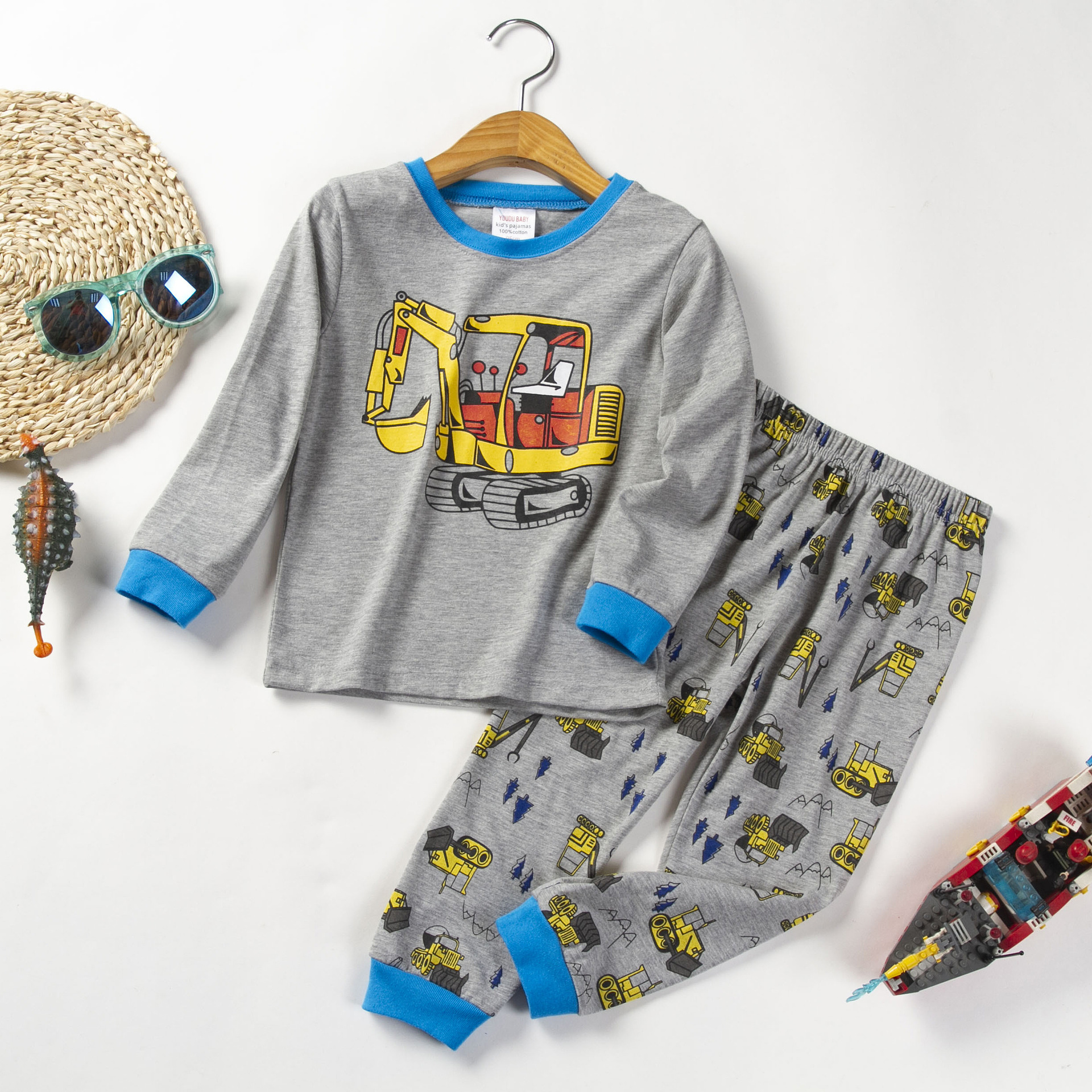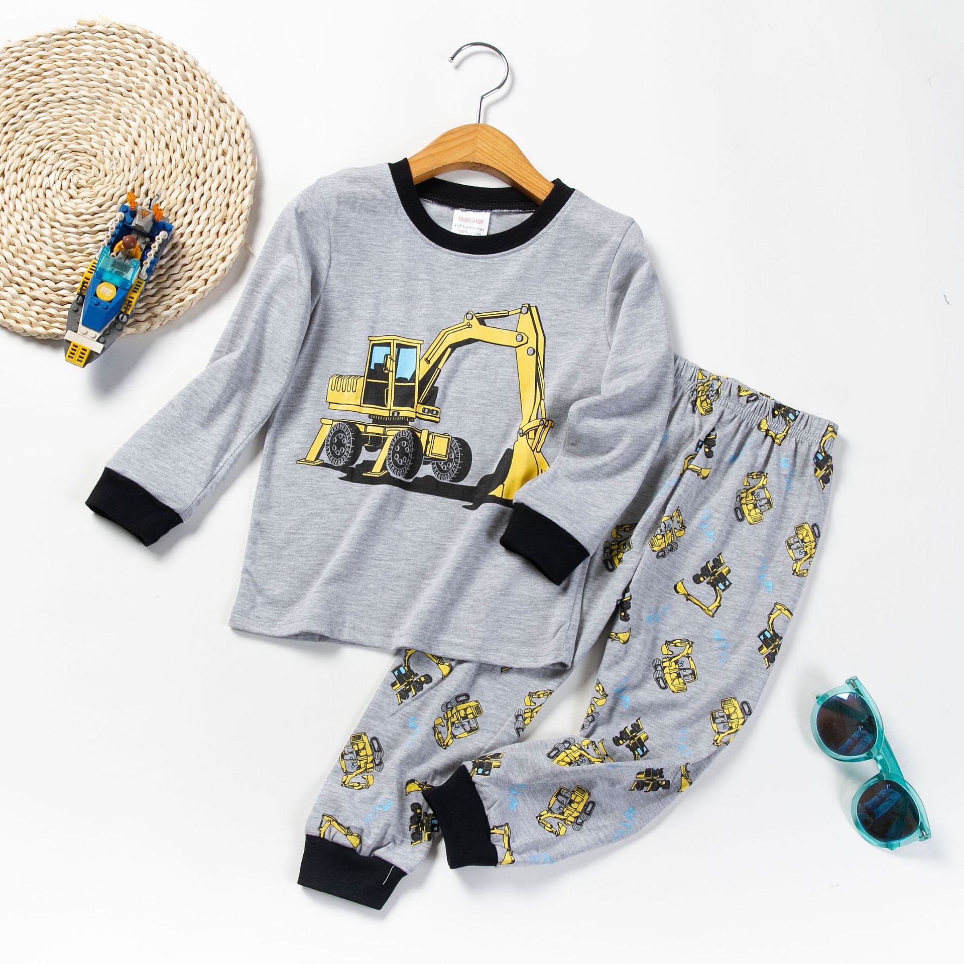 새로운 굴삭기 자동차 어린이 잠옷 봄과 가을 면 긴 소매 세트 소년 어린이 가정 의류 당일 출고 가능