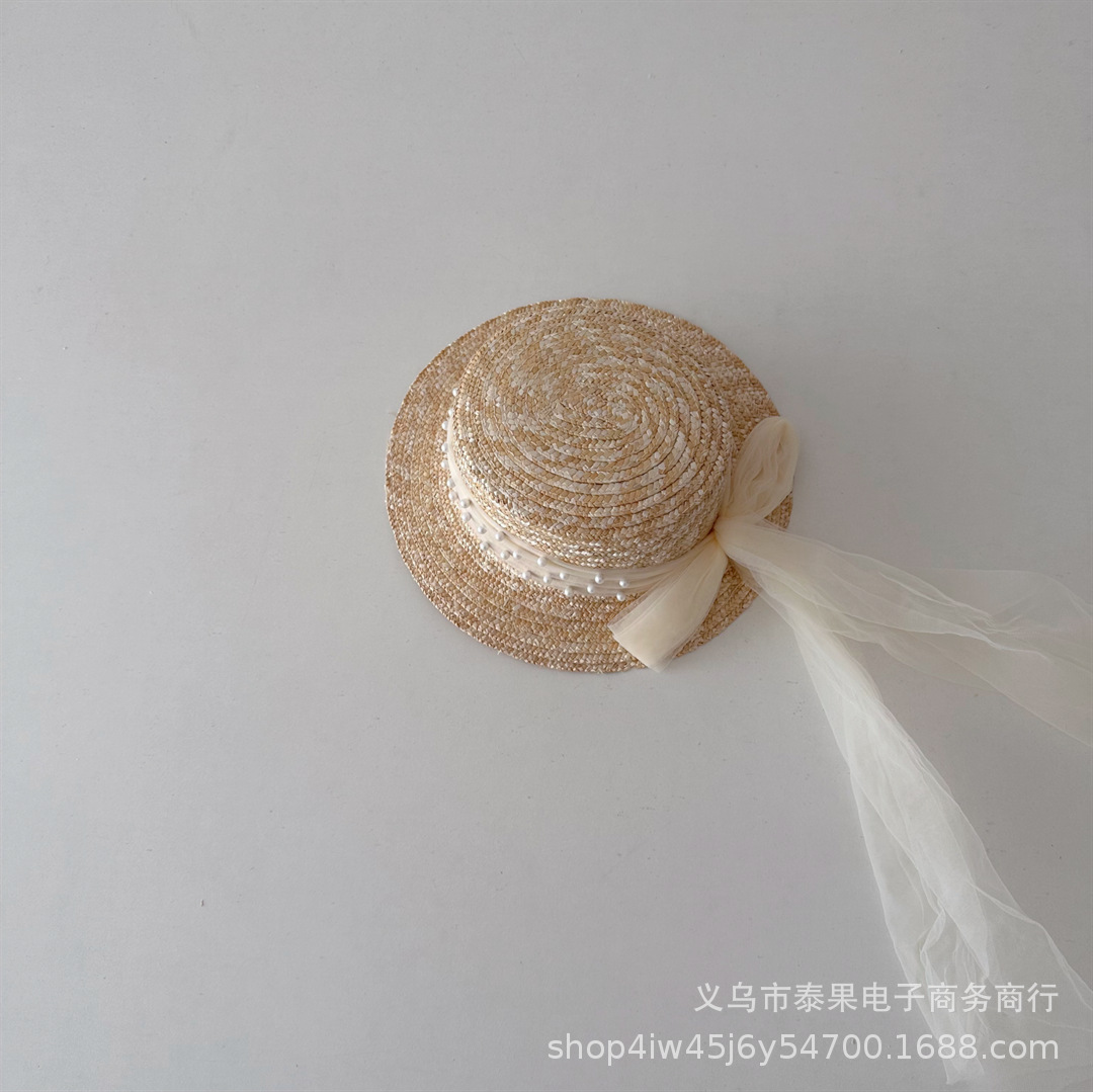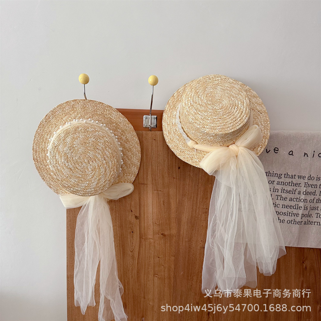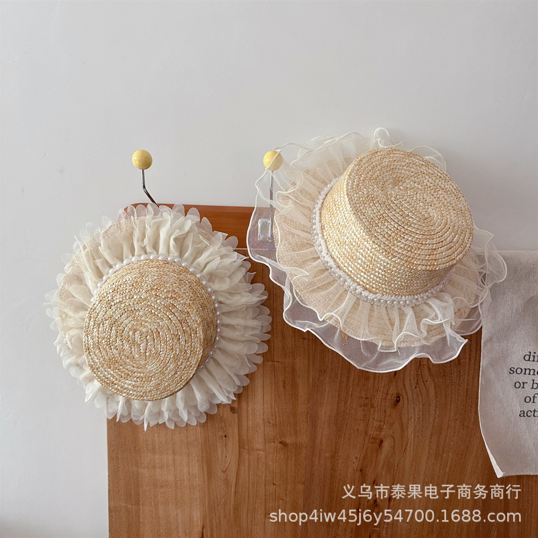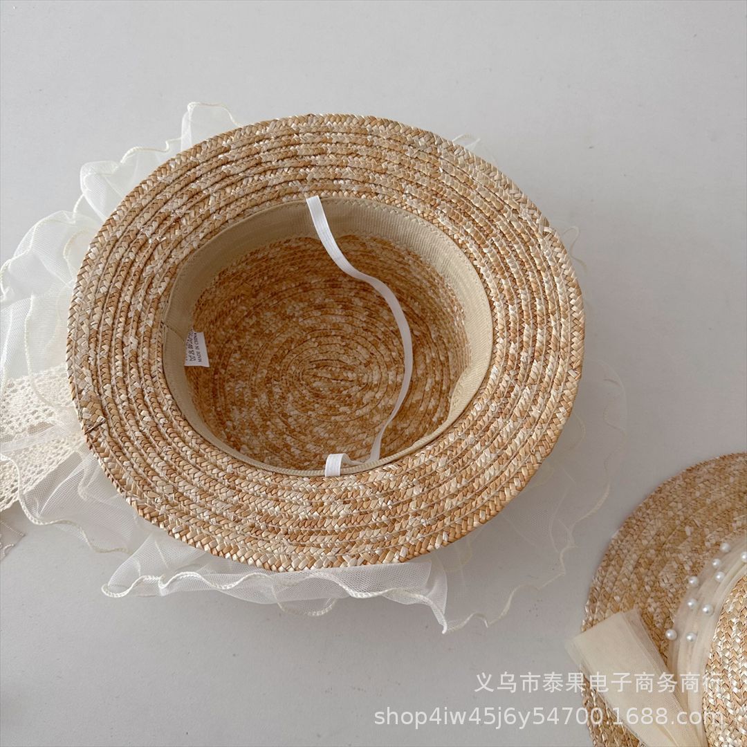 ~ 인 스타일 여름 새로운 어린이 레이스 진주 밀짚 플랫 탑 태양 모자 소녀 서양식 선 스크린 비치 밀짚 모자