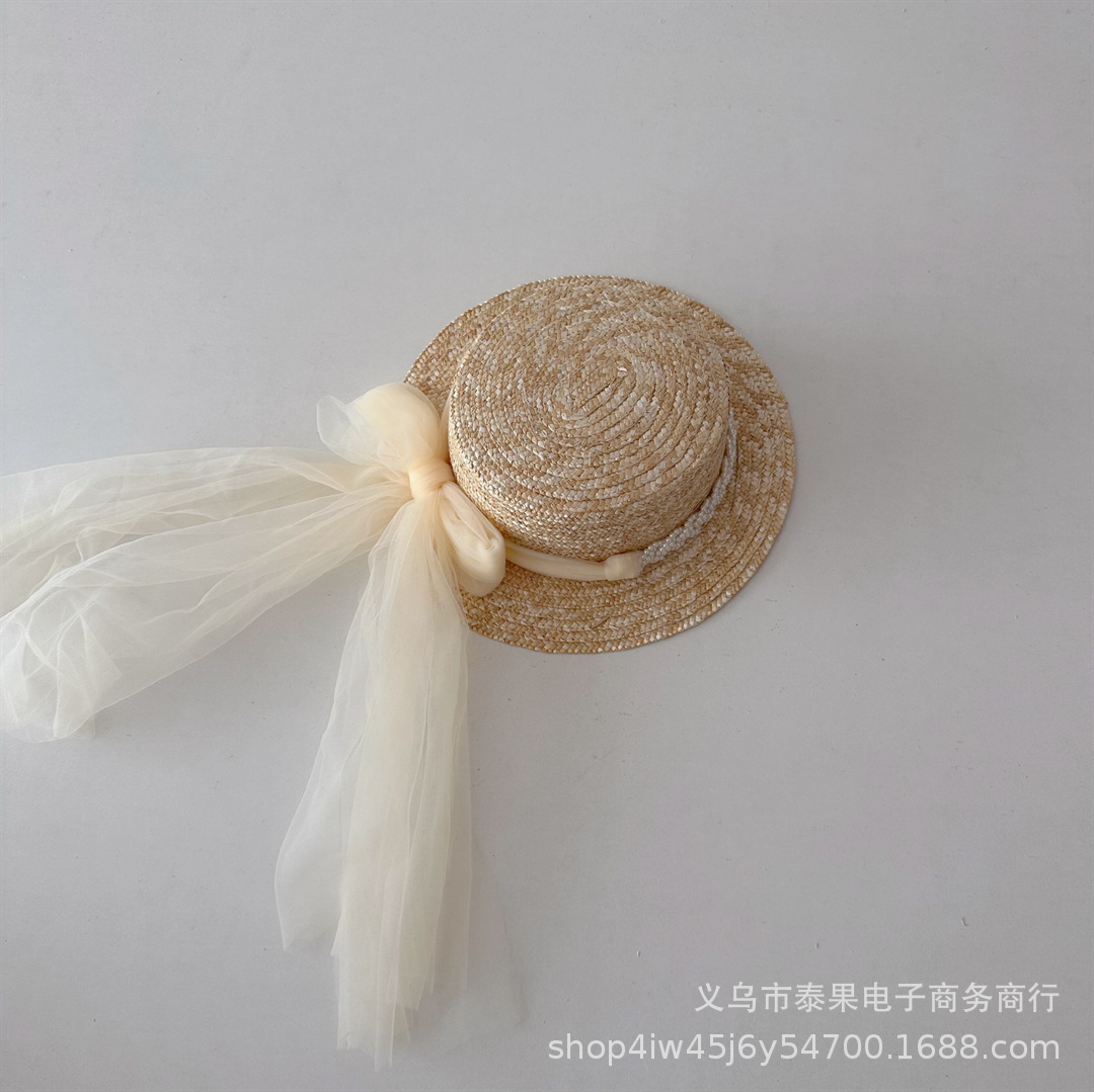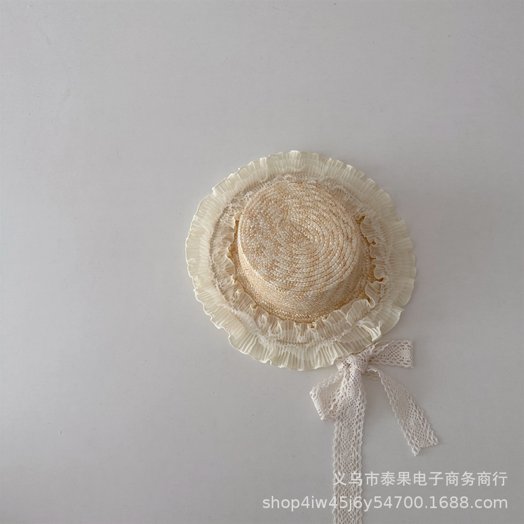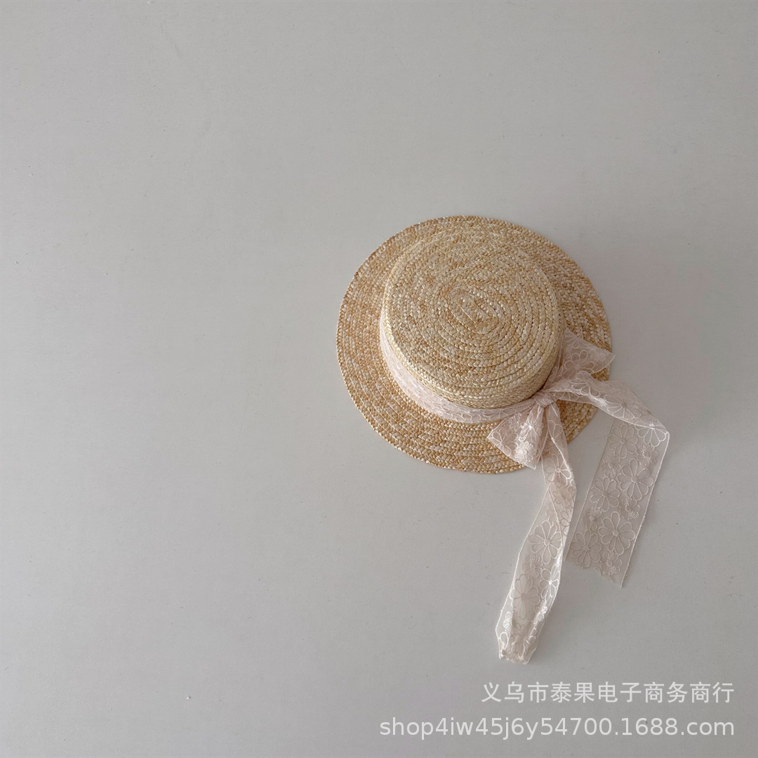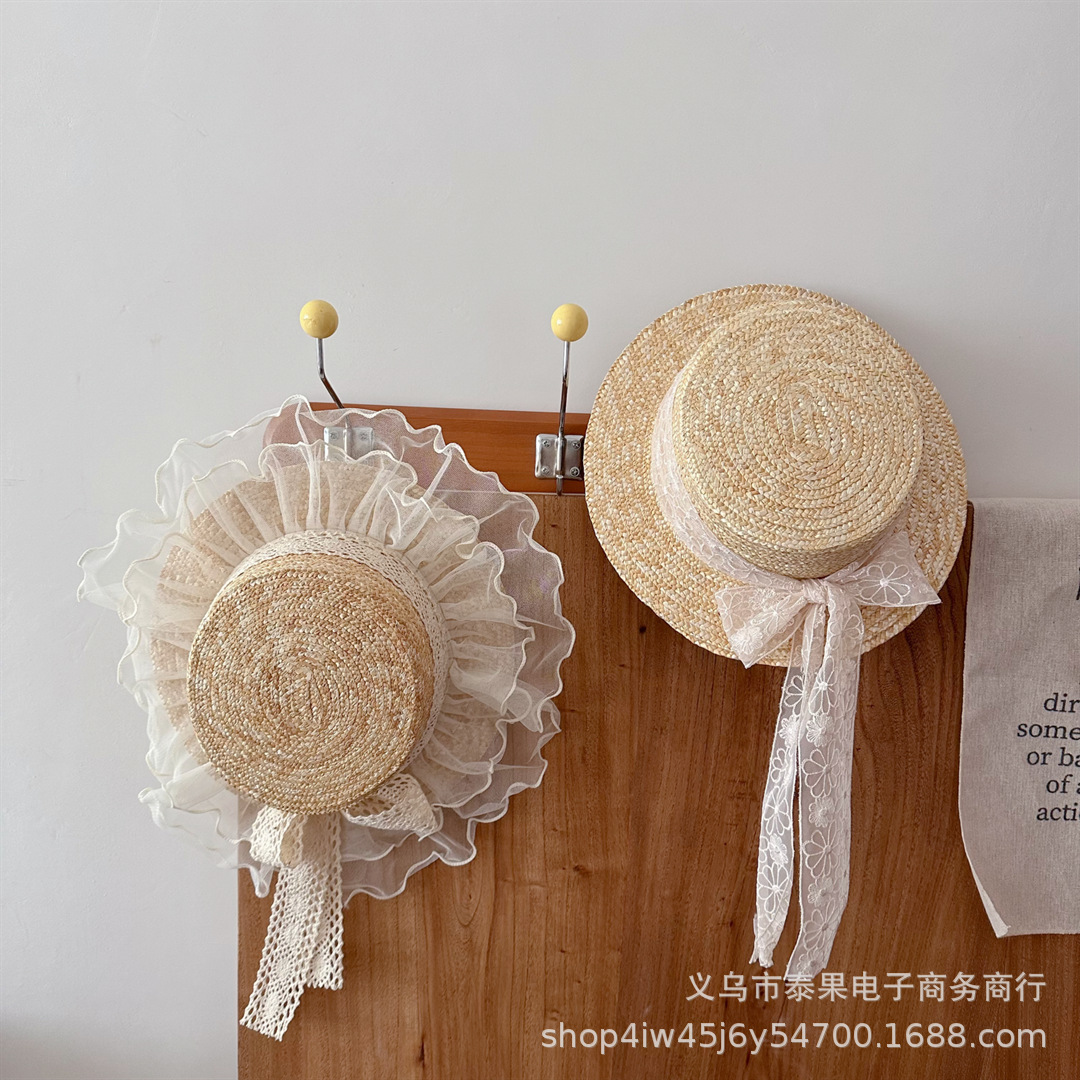 ~ 인 스타일 여름 새로운 어린이 레이스 진주 밀짚 플랫 탑 태양 모자 소녀 서양식 선 스크린 비치 밀짚 모자