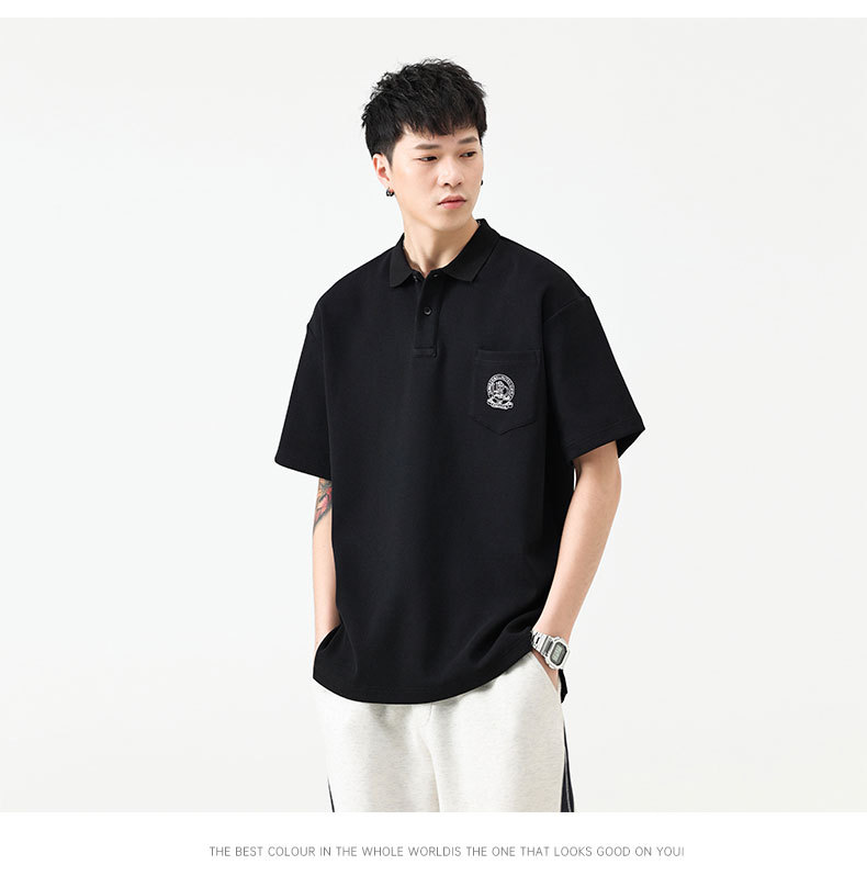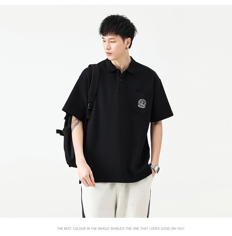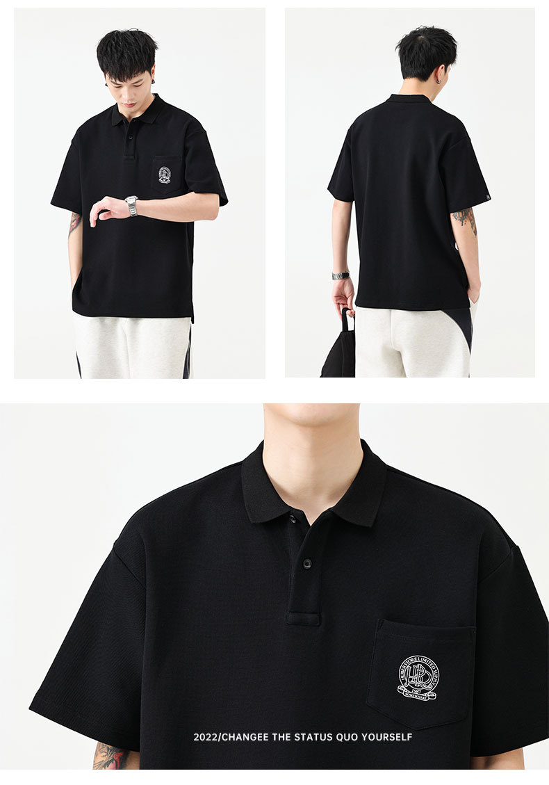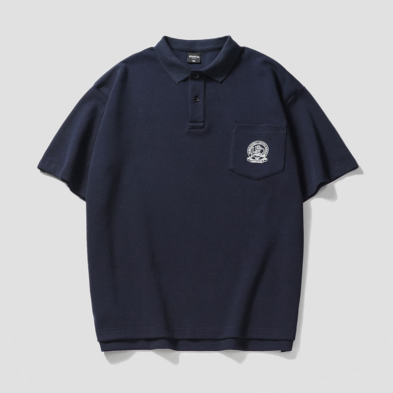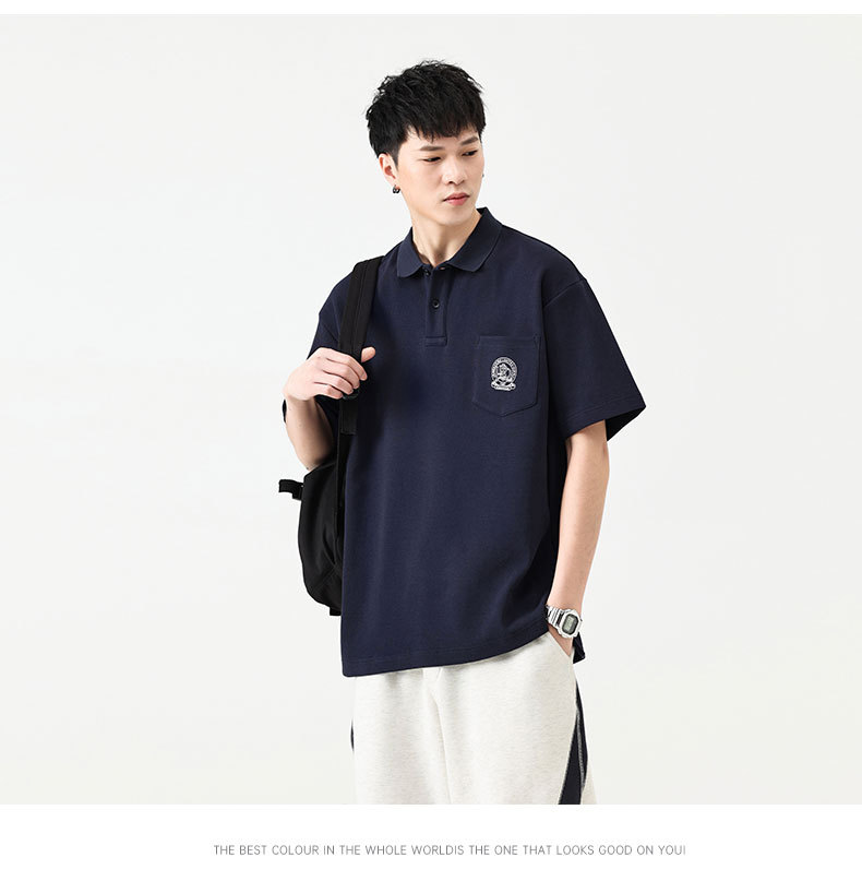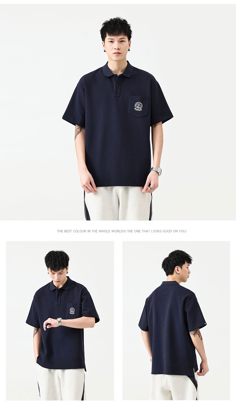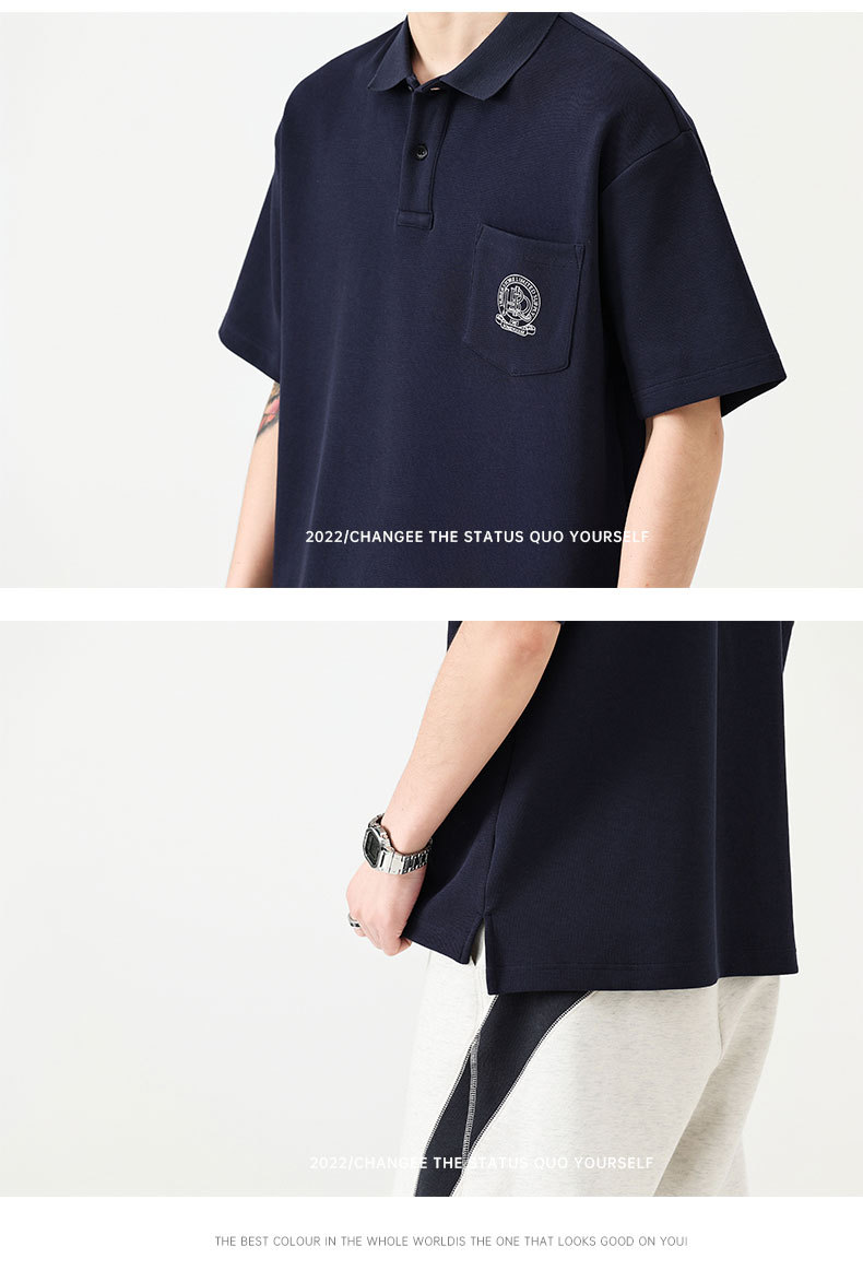 Qiqiu 남성용 세련된 패션 브랜드 플러스 사이즈 느슨한 네이비 반팔 티셔츠 남성용 300g 헤비 일본식 레트로 폴로 셔츠스토어 가기