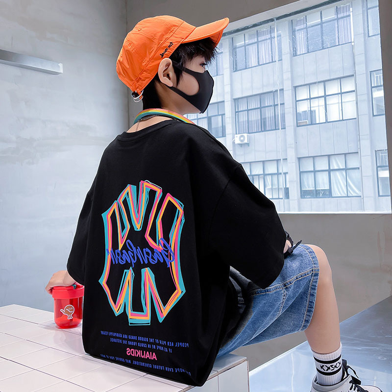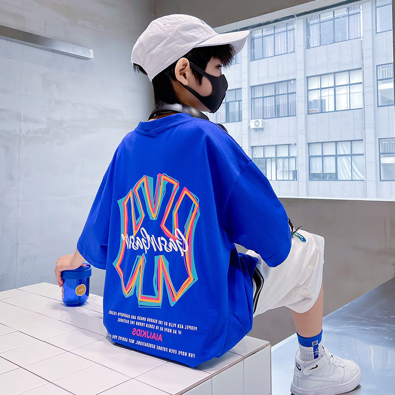 소년 반팔 티셔츠 여름 2023 새로운 스타일 큰 어린이 여름 원피스 소년 반팔 티셔츠 면 패션 브랜드 튀김 거리 어린이 세트스토어 가기