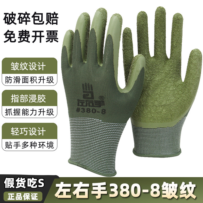 왼손 380-8 녹색 디핑 장갑 주름 나일론 라텍스 고무 미끄럼 방지 마모 방지 작업 보호 노동 보호스토어 가기
