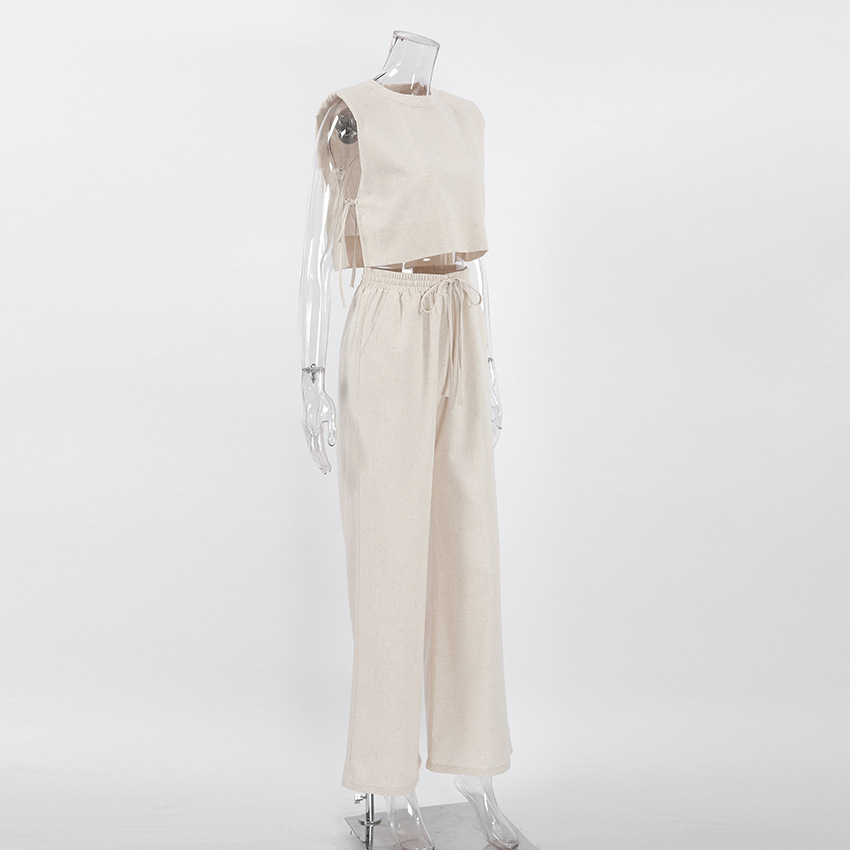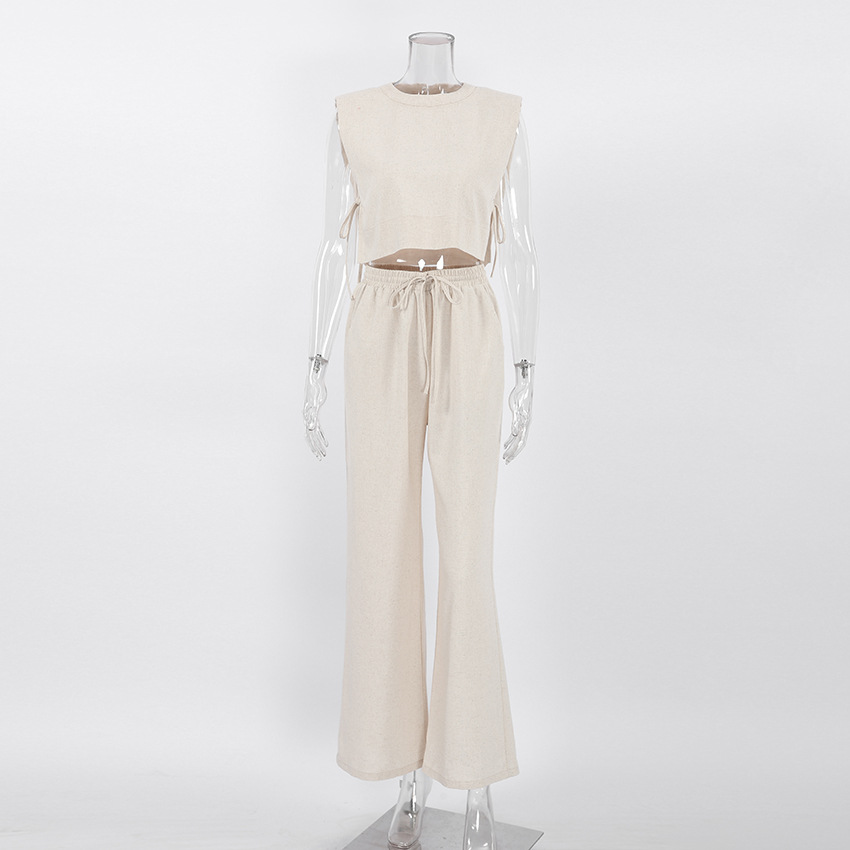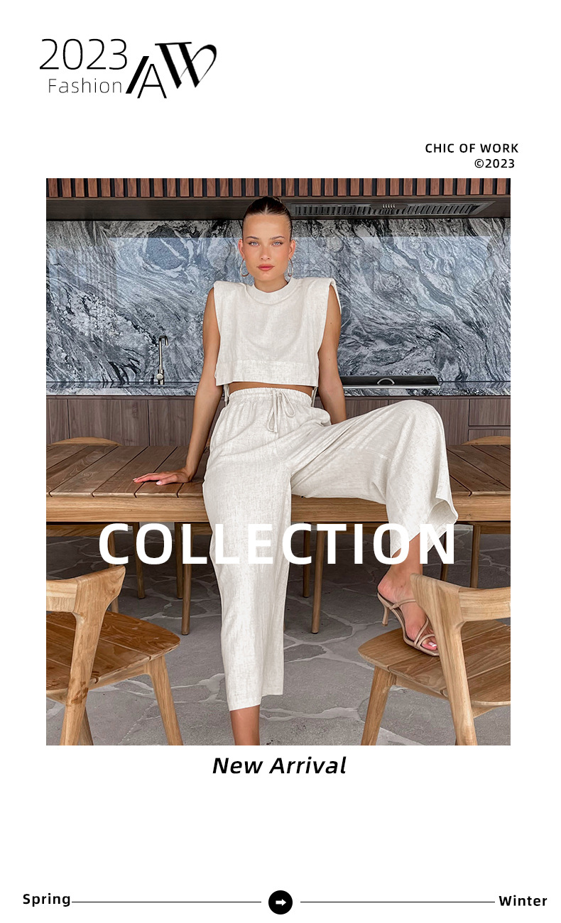 2025 여름 신상 어깨 패드 민소매 상의와 긴바지 투피스 세트 유럽 및 미국 캐주얼 패션 면마 세트 여성복스토어 가기