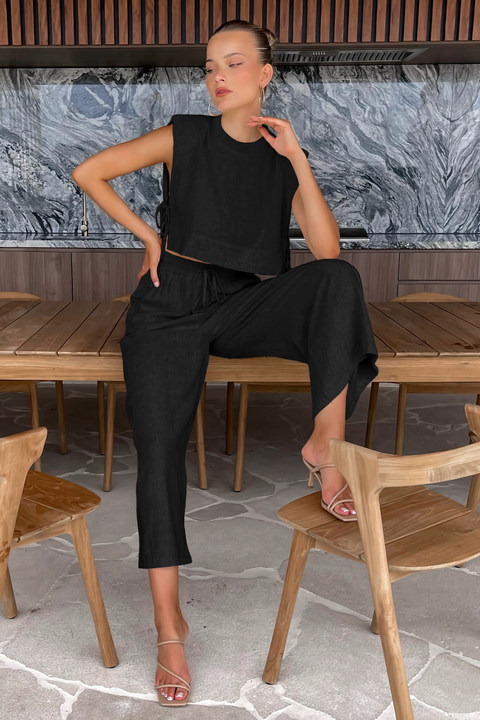 2025 여름 신상 어깨 패드 민소매 상의와 긴바지 투피스 세트 유럽 및 미국 캐주얼 패션 면마 세트 여성복