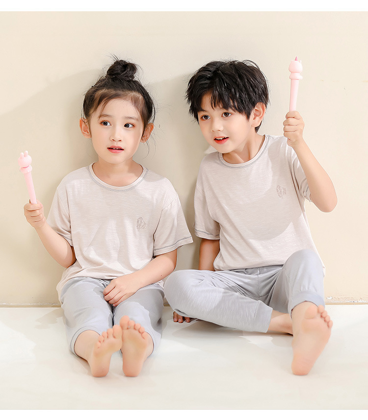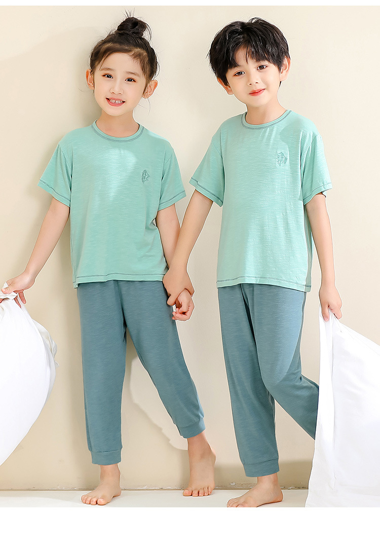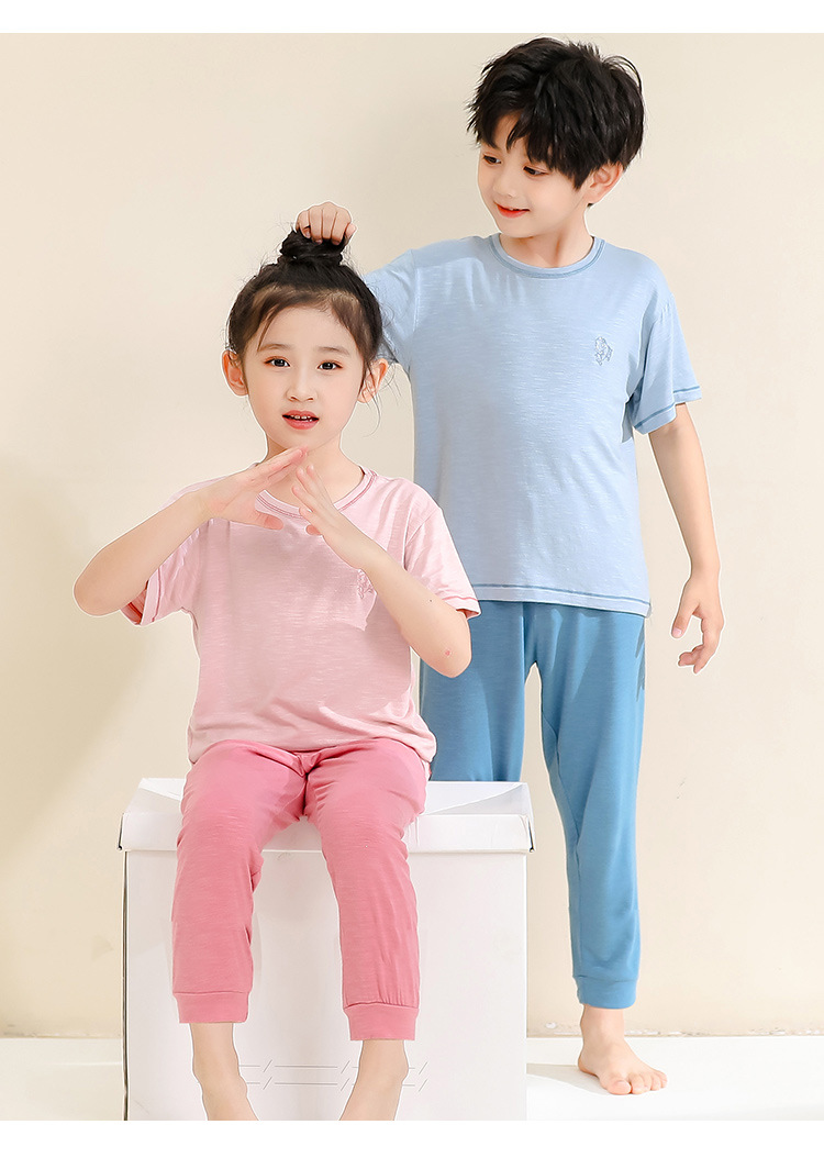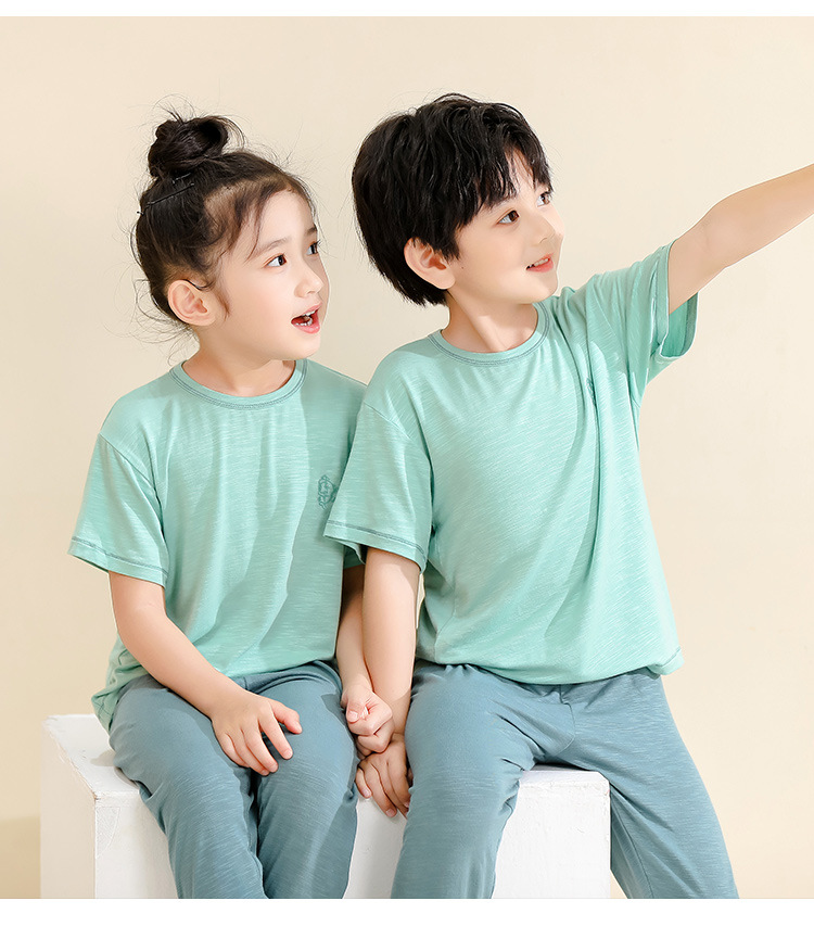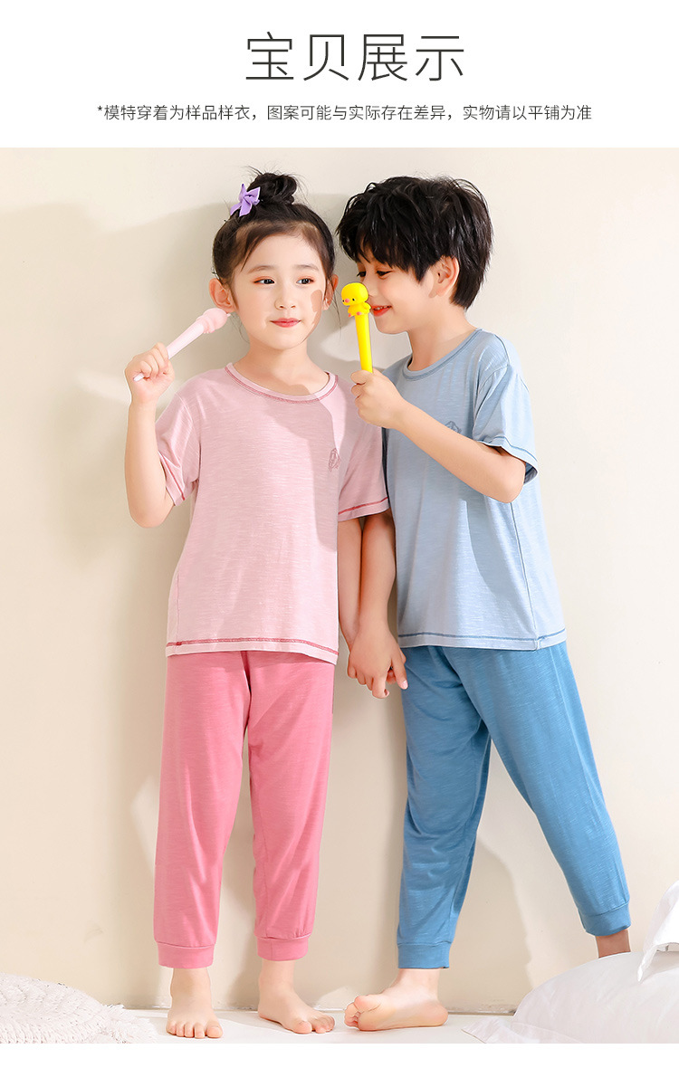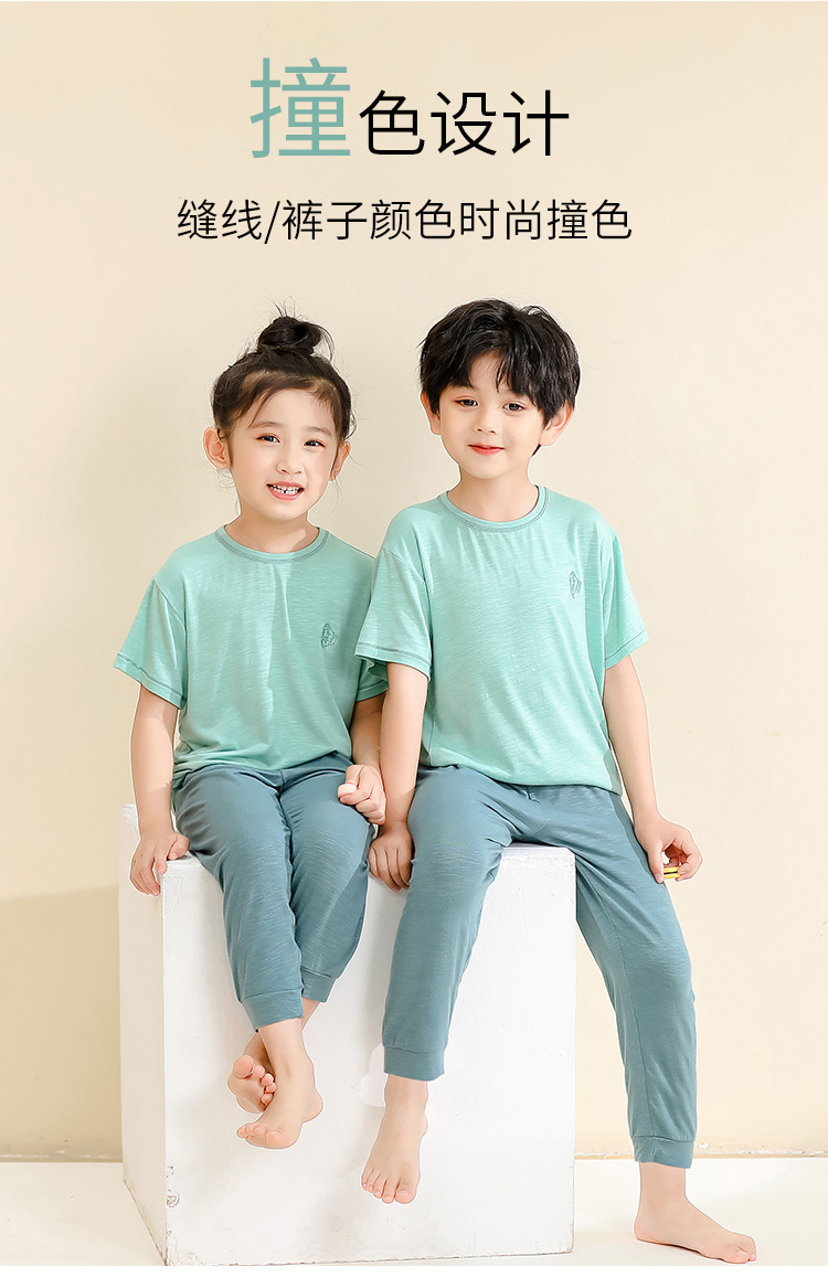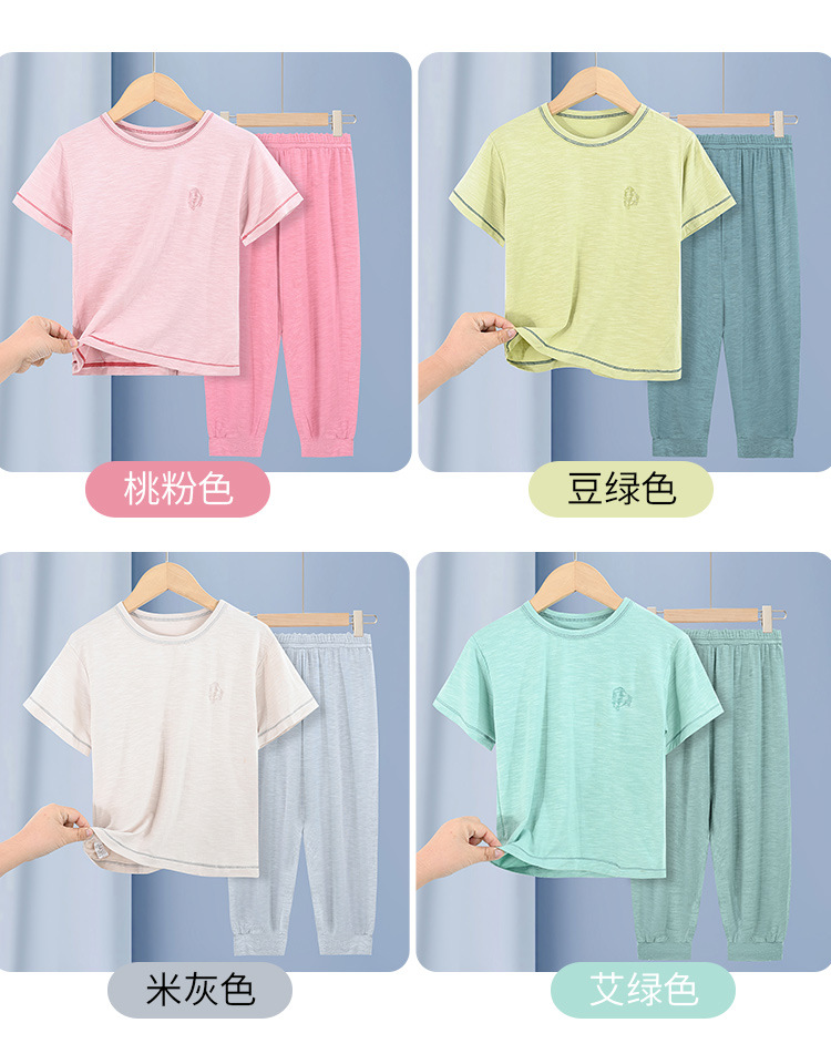 여름 신상 아동 세트 2023 슬러브 면 반팔 크롭 팬츠 가정복 투피스 세트 남녀 에어컨 의류스토어 가기