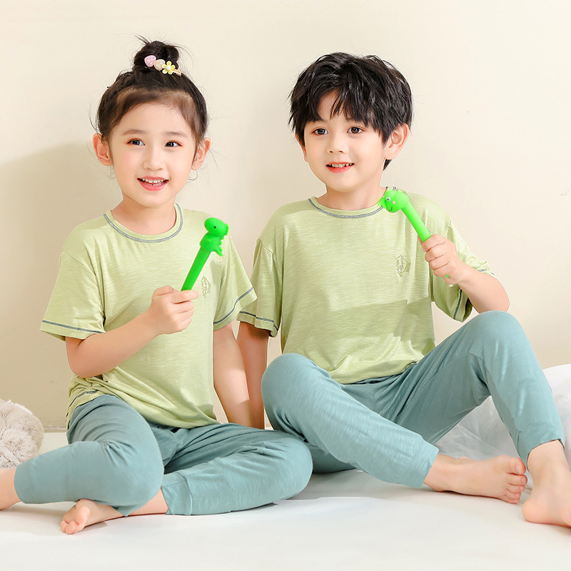 여름 신상 아동 세트 2023 슬러브 면 반팔 크롭 팬츠 가정복 투피스 세트 남녀 에어컨 의류
