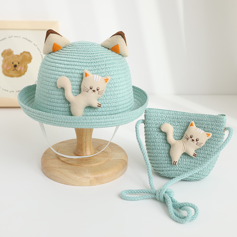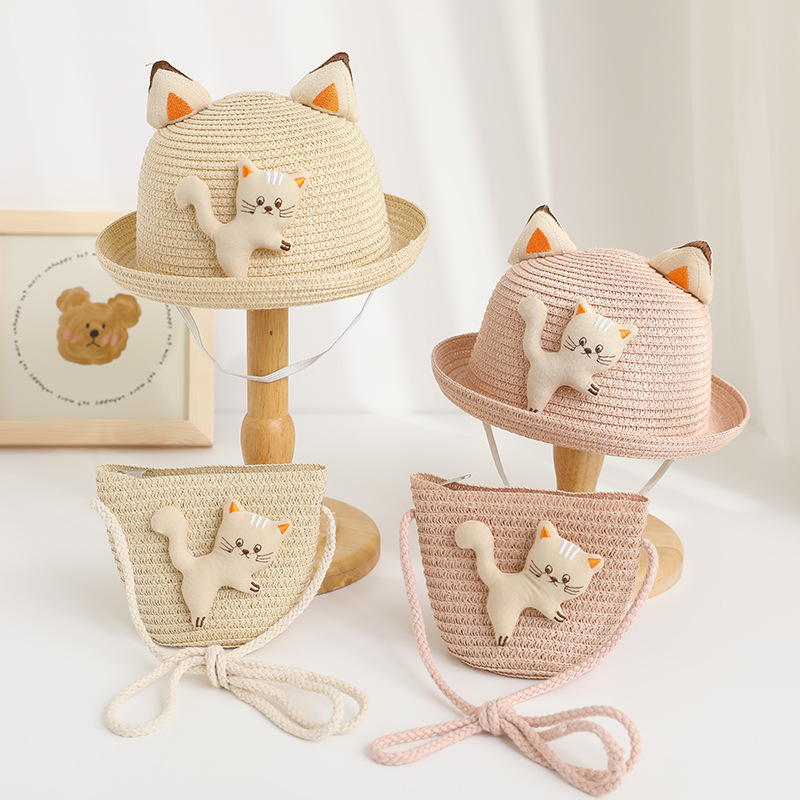 여름 새로운 어린이 가방 밀짚 모자 세트 야외 차양 자외선 차단제 통기성 밀짚 숄더백 비치 모자 유행
