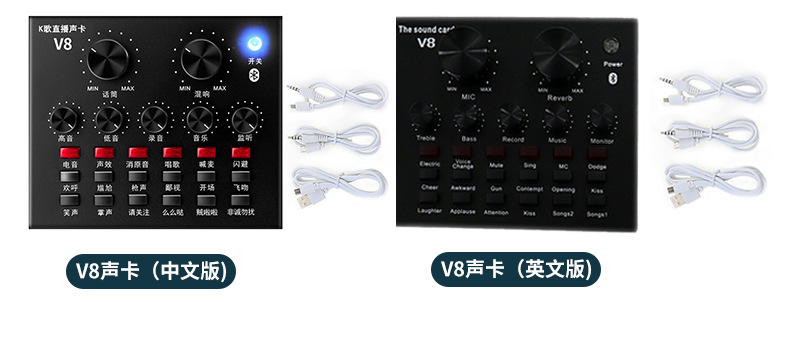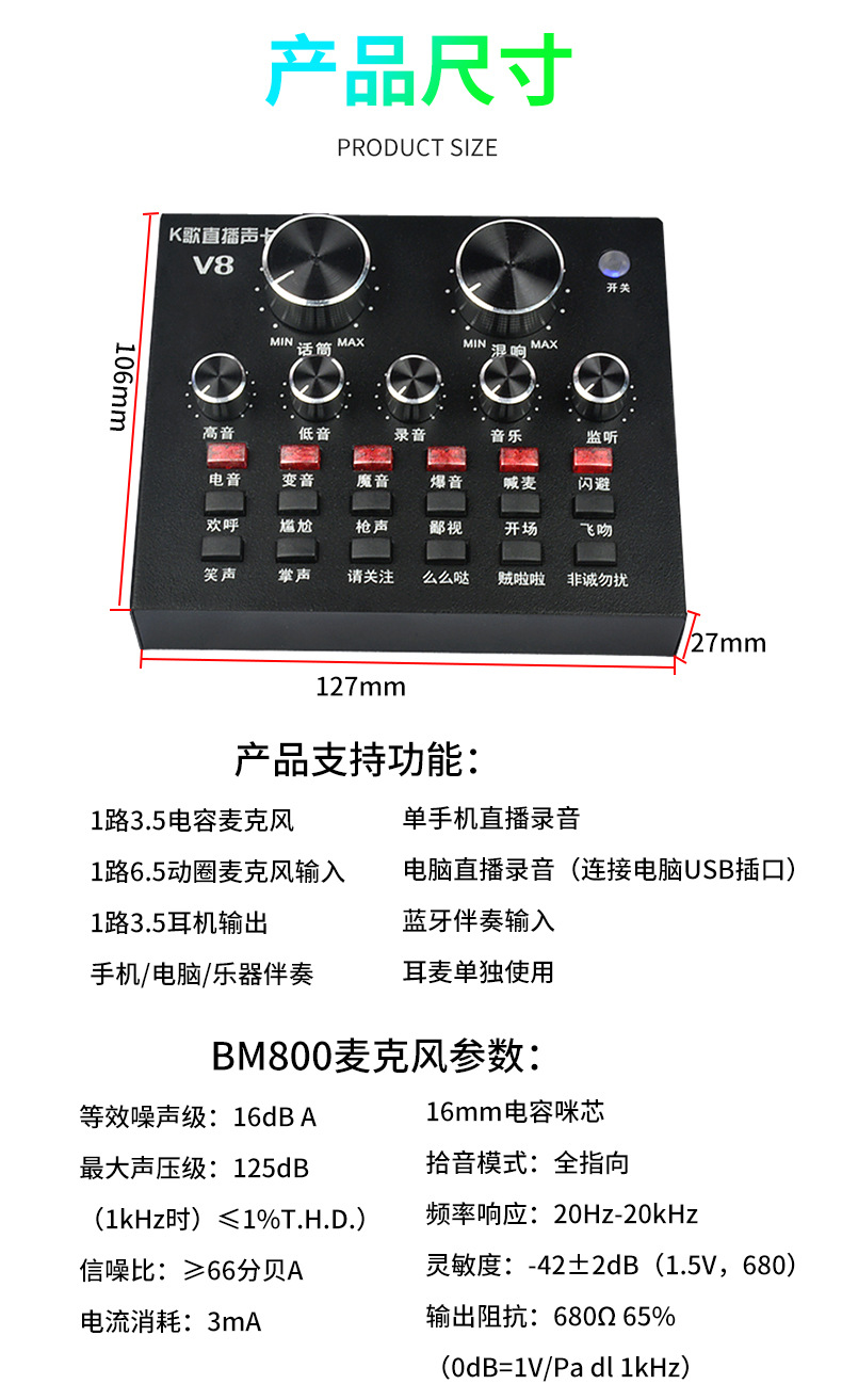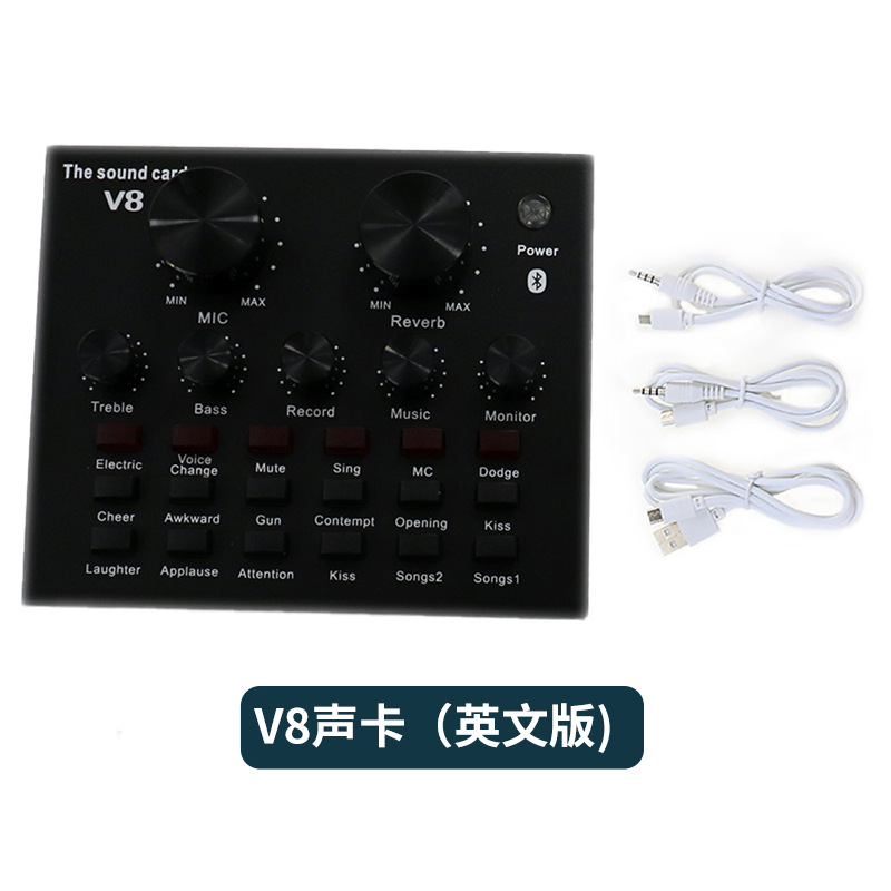 • 전체 플라스틱 V8 사운드 카드(영어 버전) + 금속 BM800 커패시터 마이크 + 헤드폰 + 캔틸레버 브래킷 세트