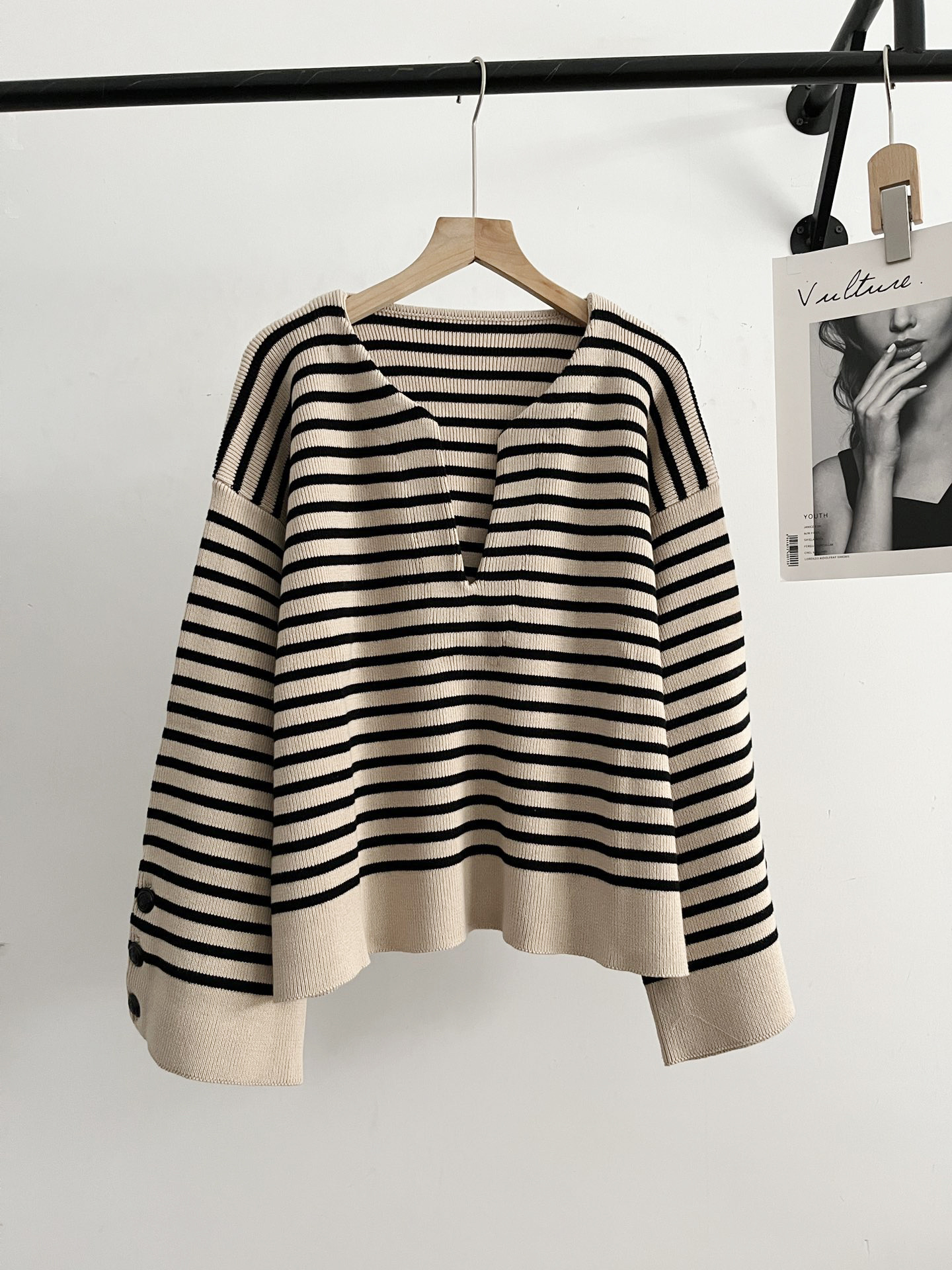 Md 스타일 가을과 겨울 새로운 느슨한 버튼 V-넥 블랙 스트라이프 와이드 슬리브 헤드 스웨터 여성용스토어 가기