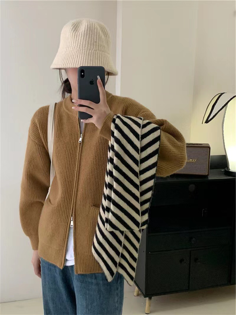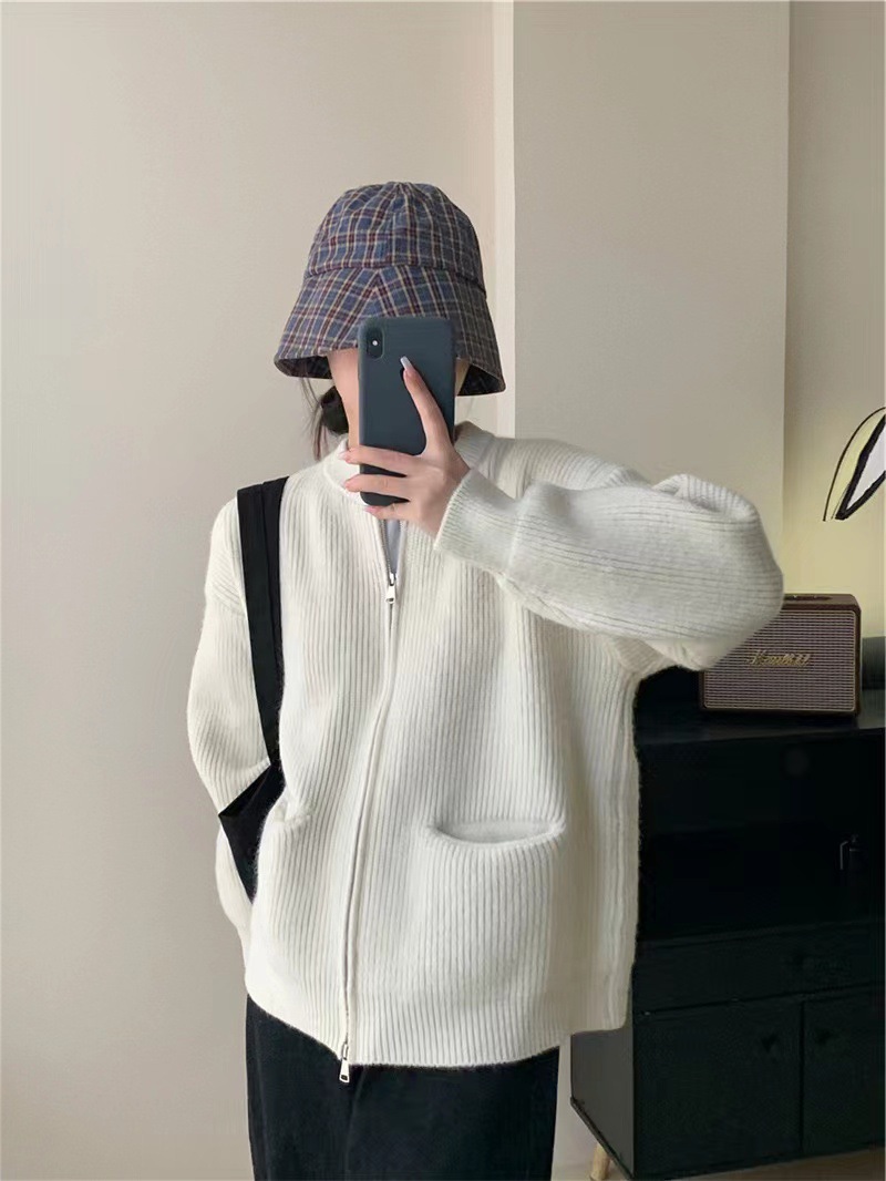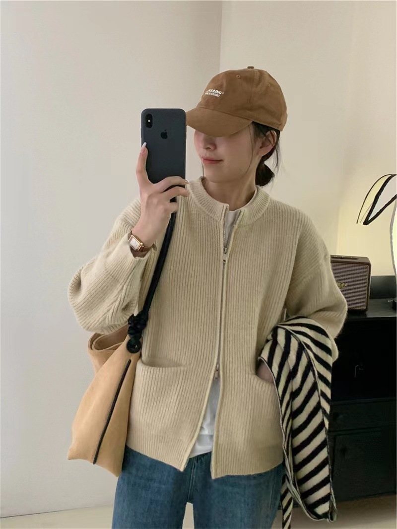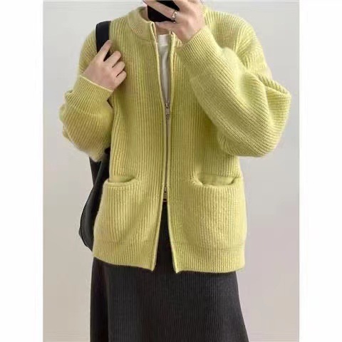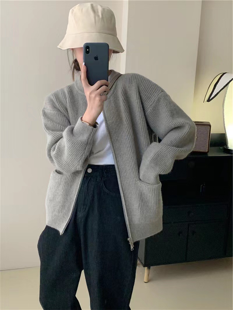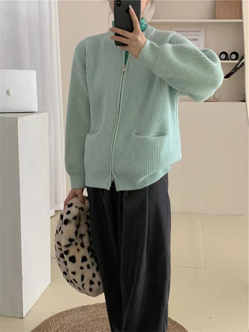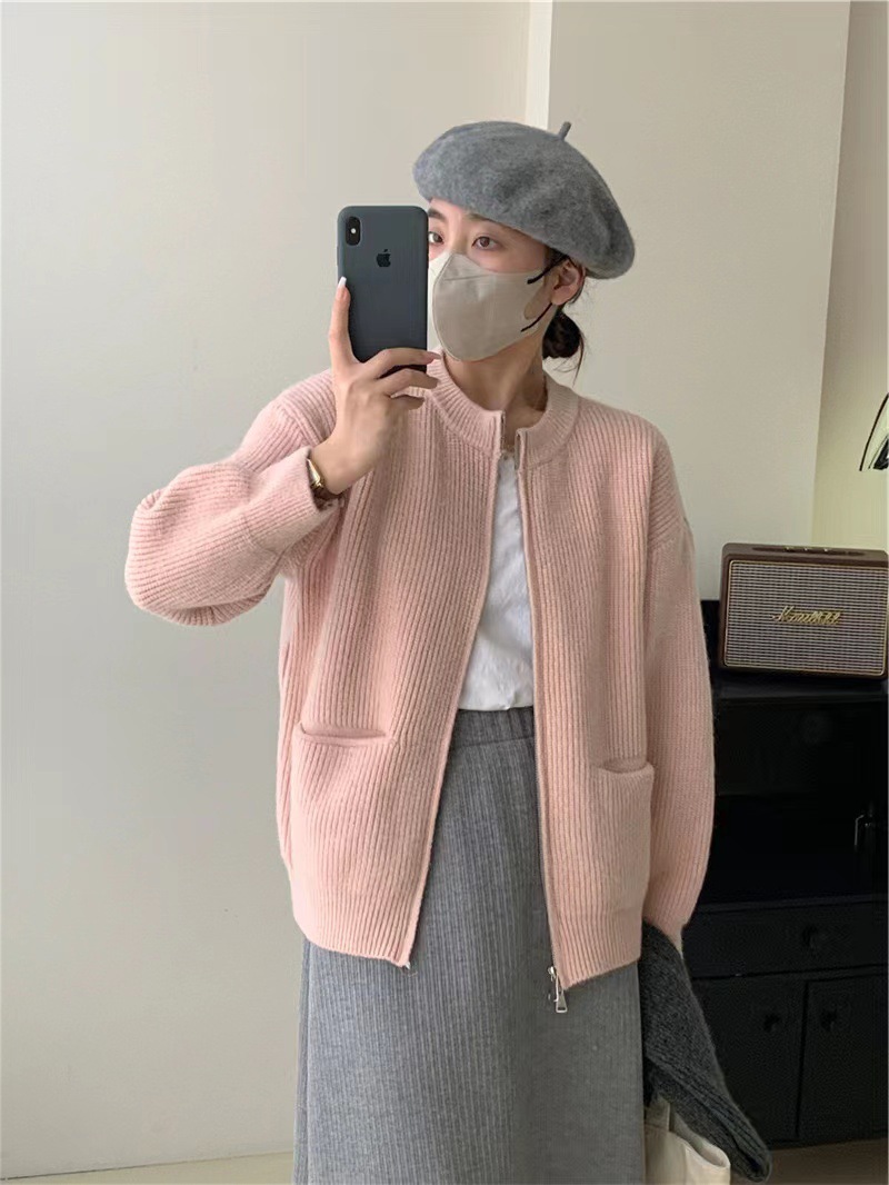 여성을위한 디자인 더블 지퍼 스웨터 봄, 가을 새로운 라운드 넥 캔디 컬러 카디건 탑 자켓 여성 유행스토어 가기