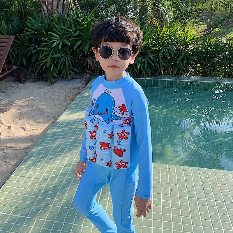 수영 모자를위한 새로운 원피스 부력 수영복 긴팔 바지 자외선 차단제 소년 만화 패턴 어린이 플로팅 수영복스토어 가기