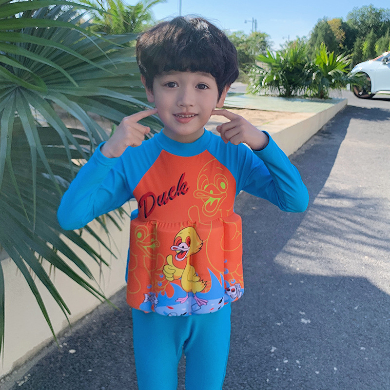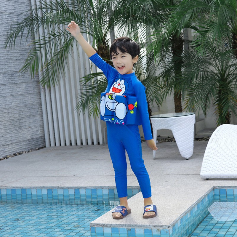 수영 모자를위한 새로운 원피스 부력 수영복 긴팔 바지 자외선 차단제 소년 만화 패턴 어린이 플로팅 수영복