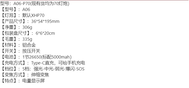 • A06 [국경 간 색상 상자]: A06-P70 플랫 테일 + 3000mah 26650 리튬 배터리 + type-c 데이터 케이블