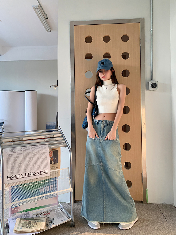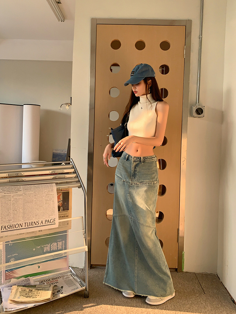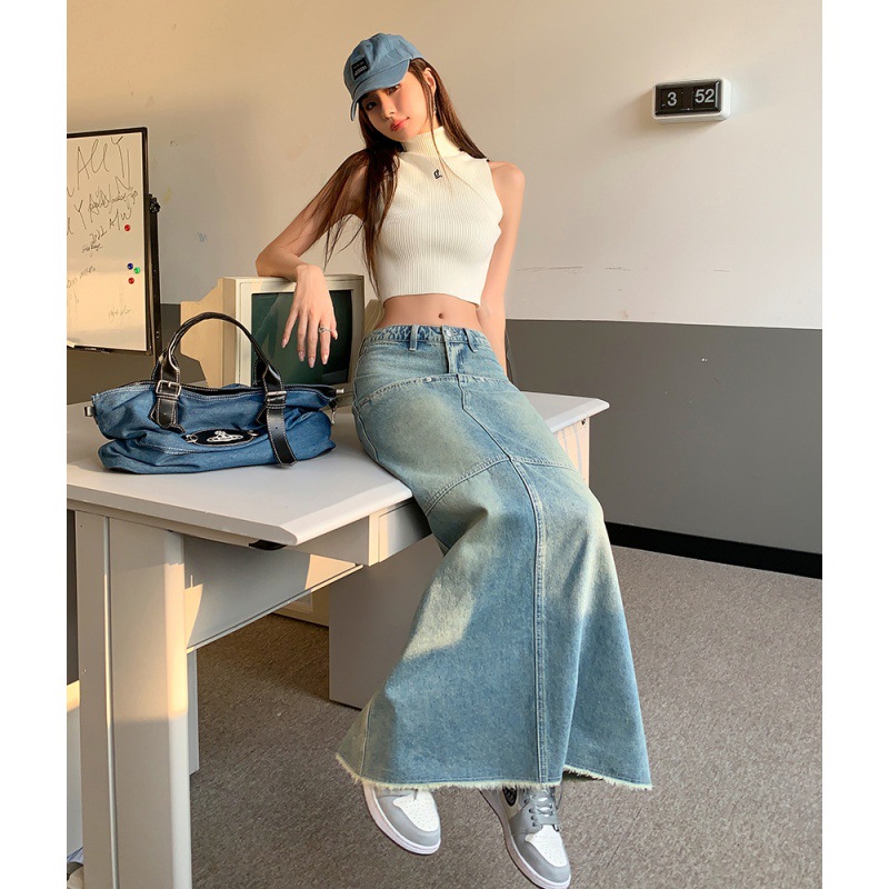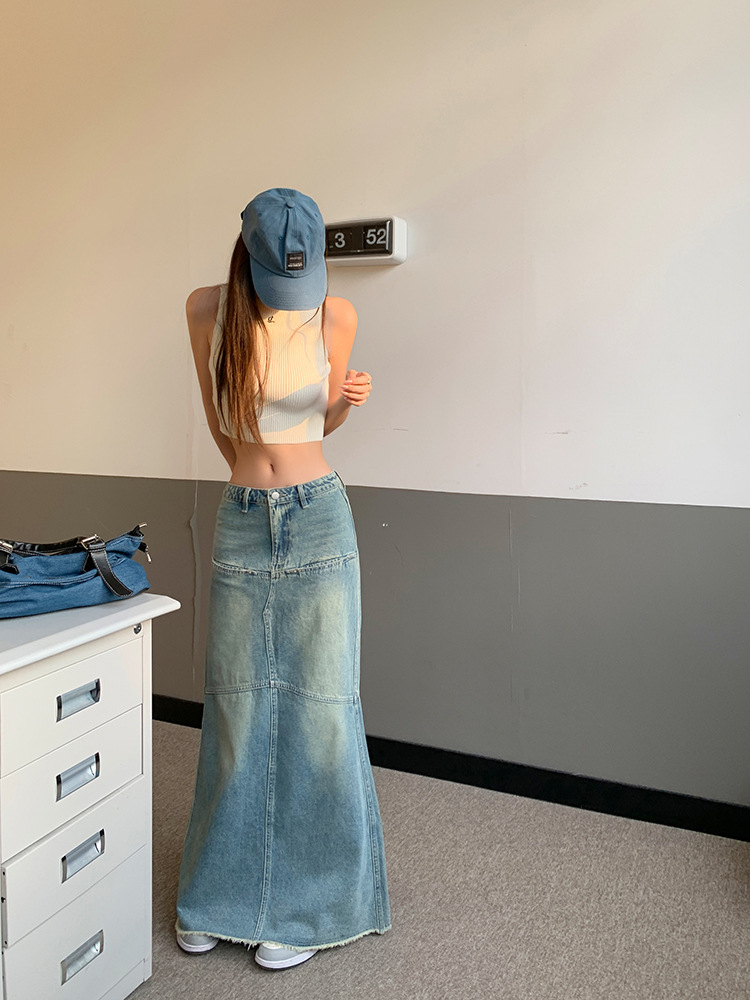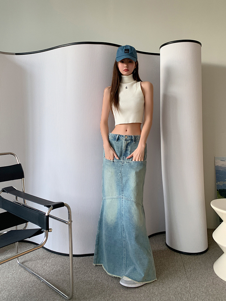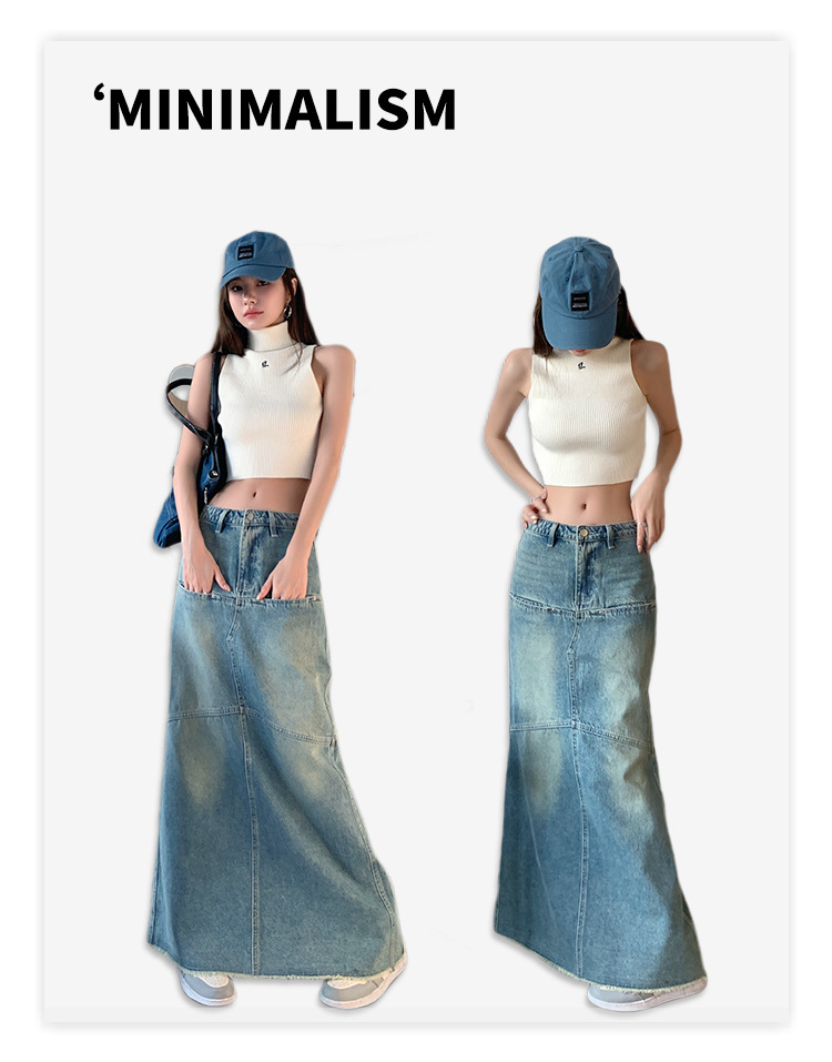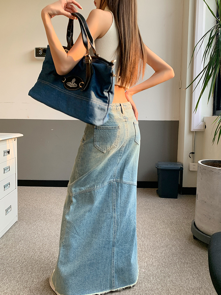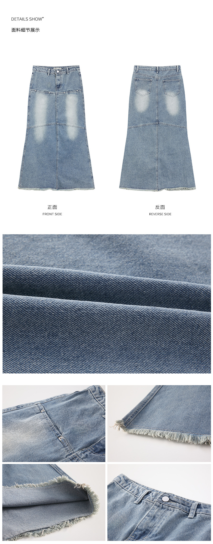 리얼 샷 이른 봄 새로운 디자인 감각 데님 스커트 여성 가방 엉덩이 슬림 피쉬 테일 스커트 포켓 롱 스커트 47169