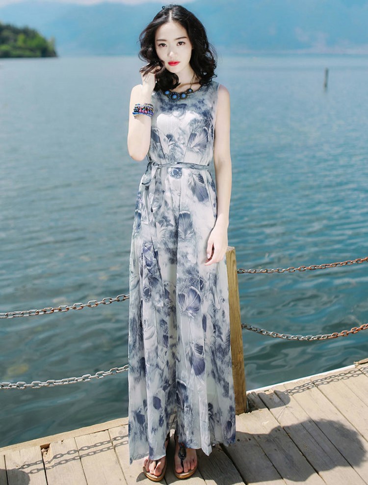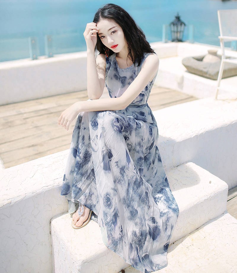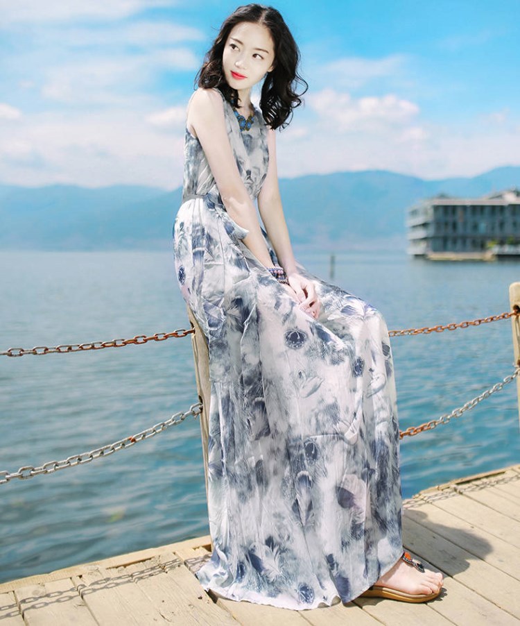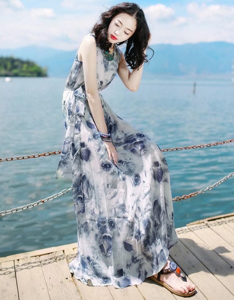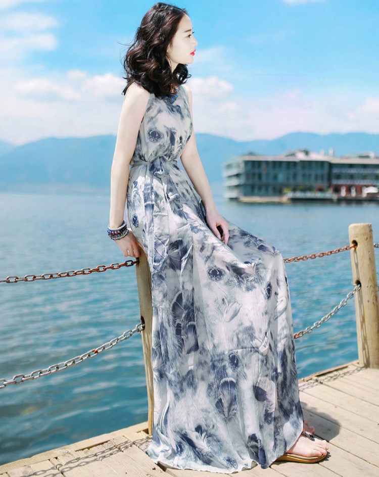 보헤미안 원피스 여자의 여름 긴 원피스 2023 새로운 해변 휴가 인쇄 민소매 스트랩 비치 원피스