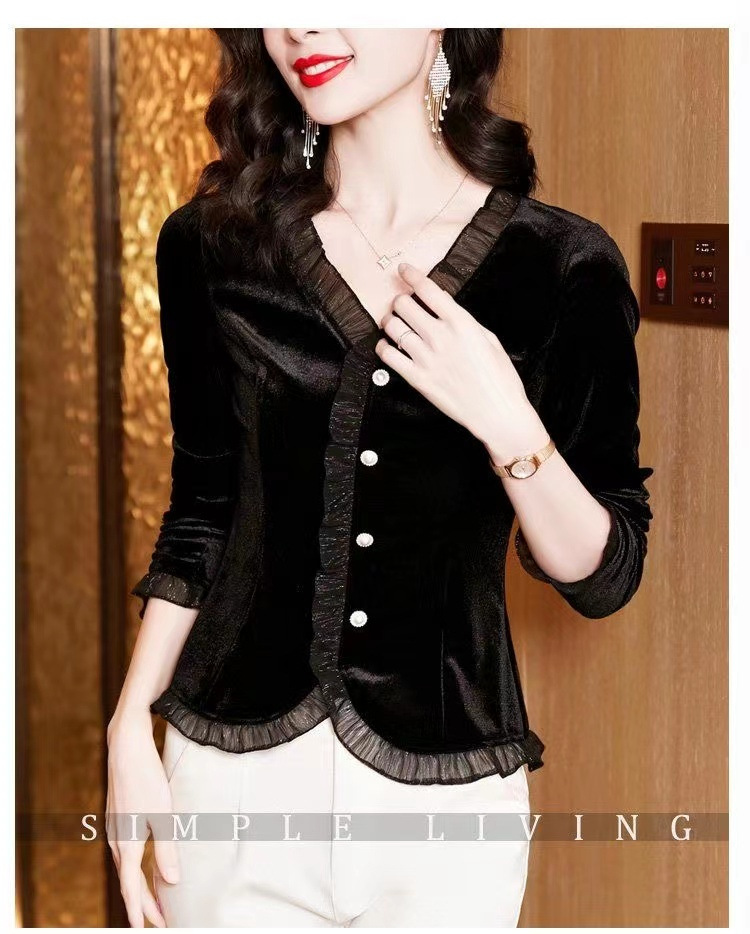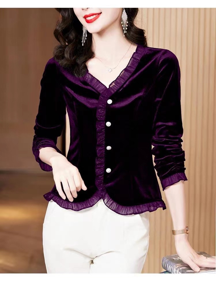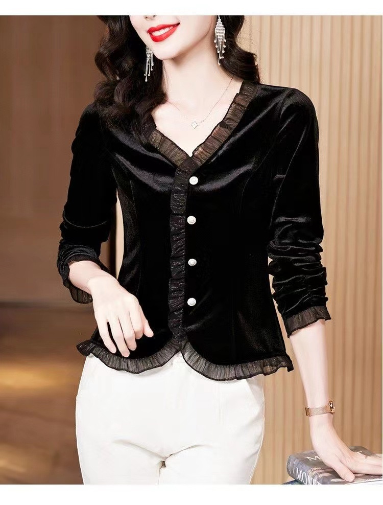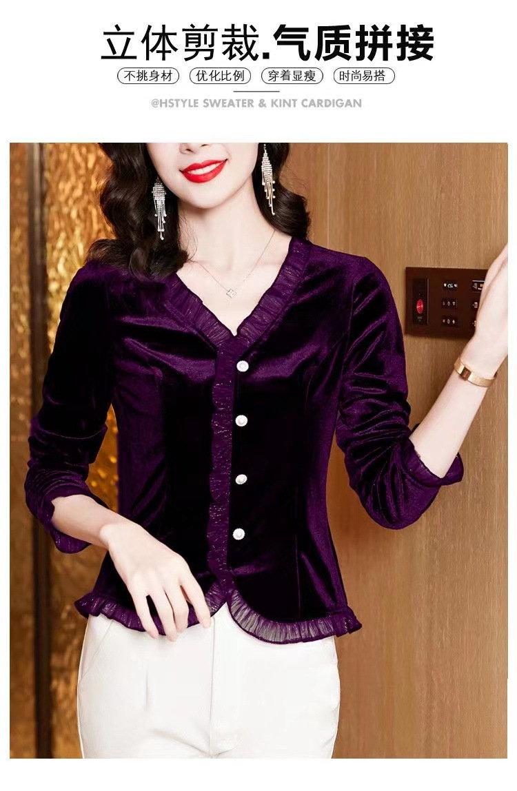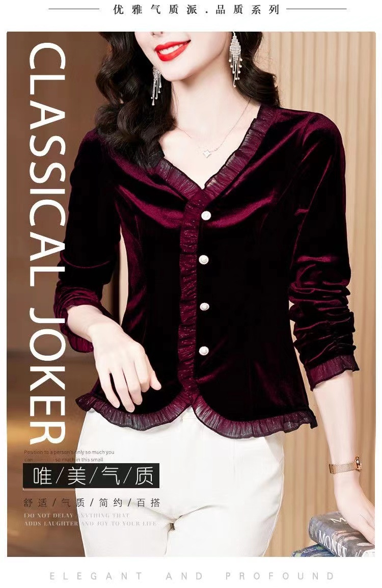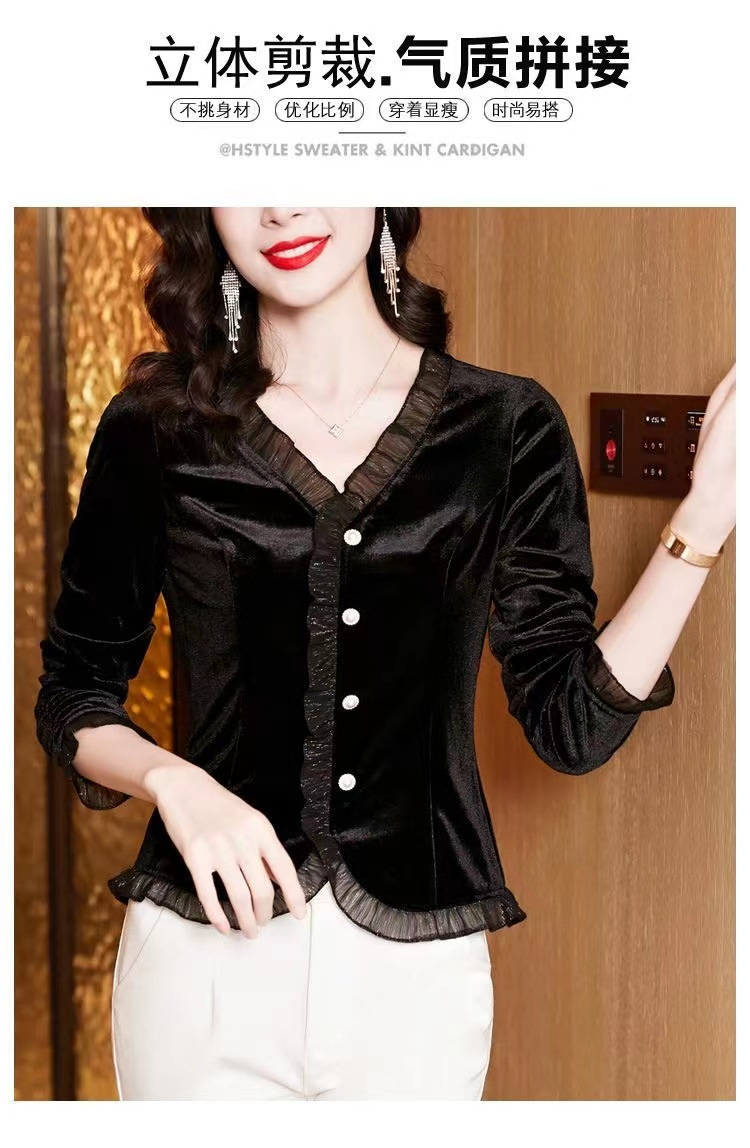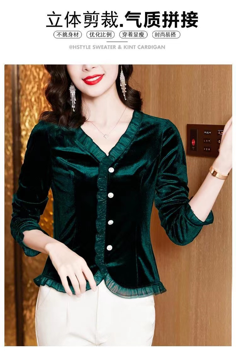 골드 벨벳베이스 셔츠 여성의 가을과 겨울 새로운 스타일 우아한 V-넥 풀오버 따뜻한 옷 긴 소매 편지 자수 탑