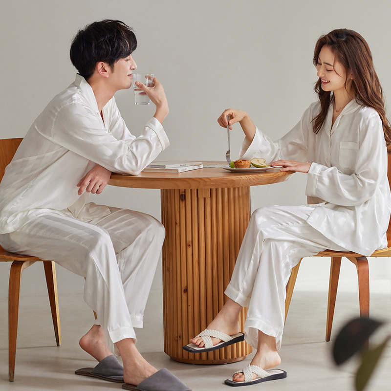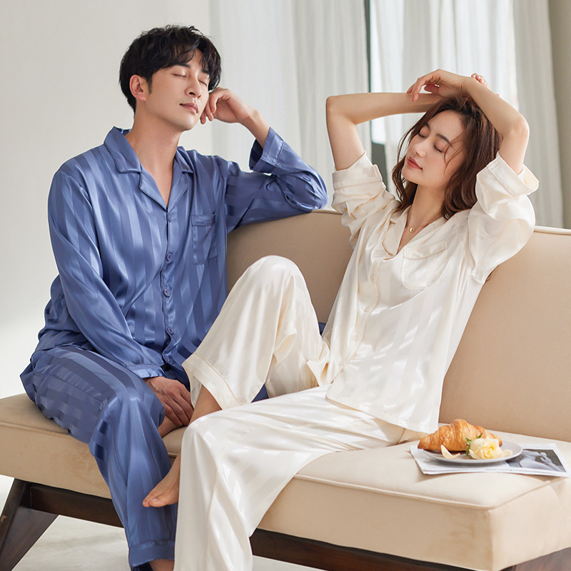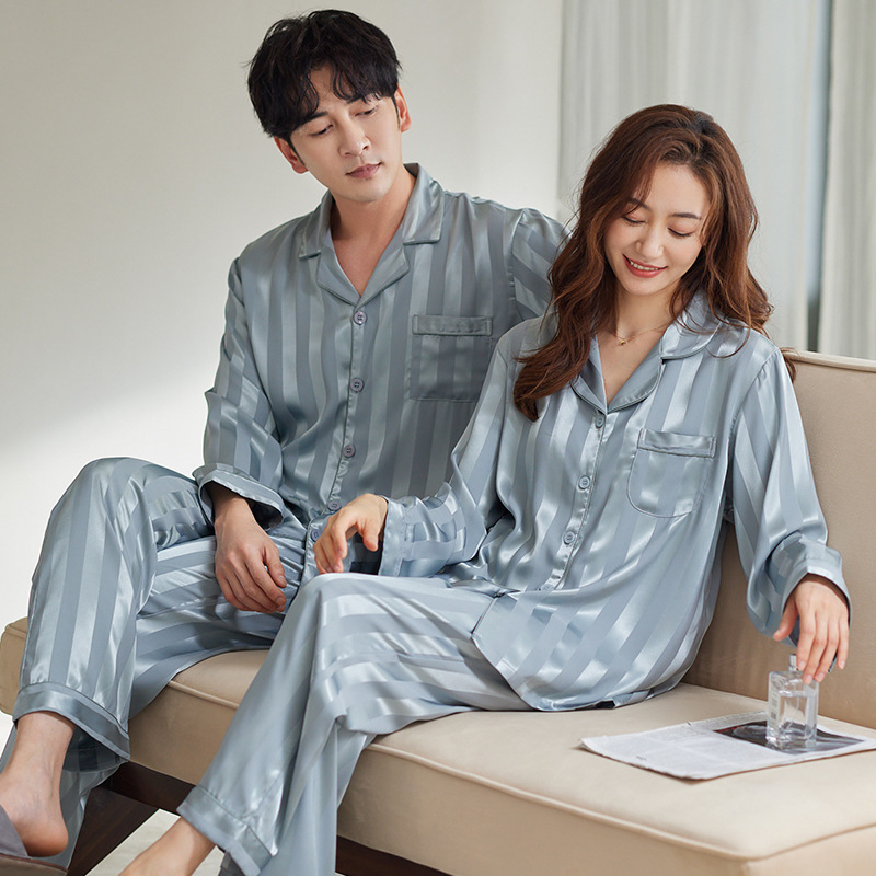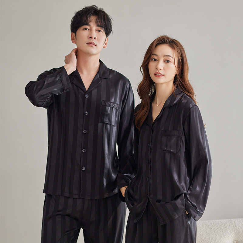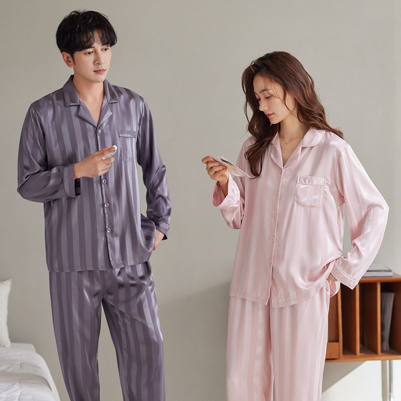 Tiremeng 봄 가을 카디건 긴 소매 편안한 신혼 커플 겉옷 아이스 실크 느슨한 포켓 홈 잠옷 세트