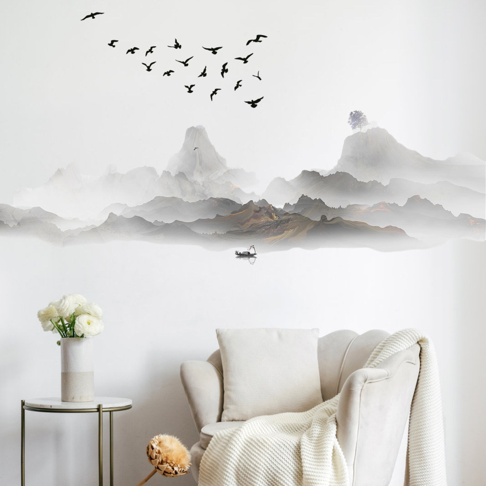 Yiyao 중국어 잉크 페인팅 벽 스티커 거실 침실 입구 창조적 인 새 풍경 배경 벽 장식 방습 스티커