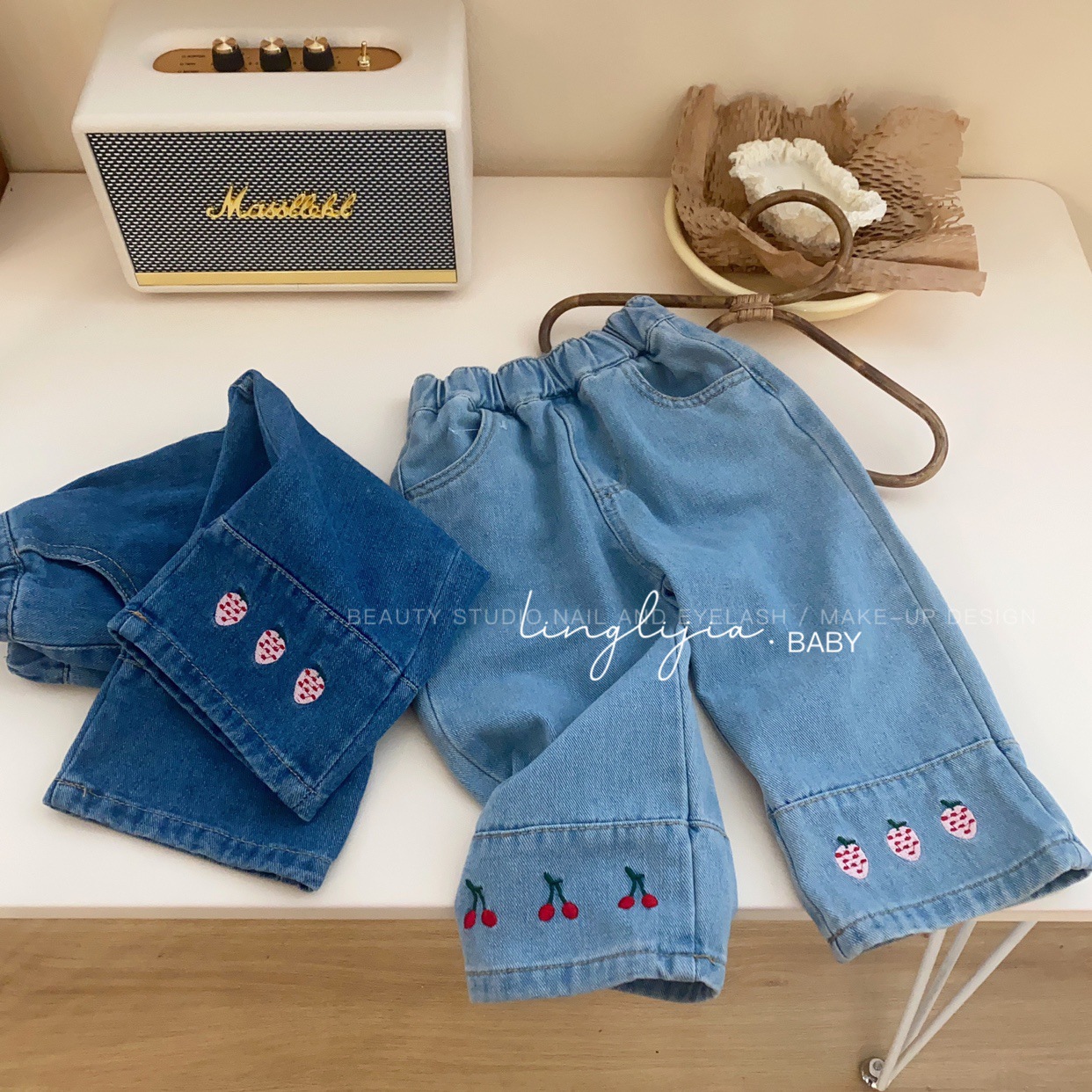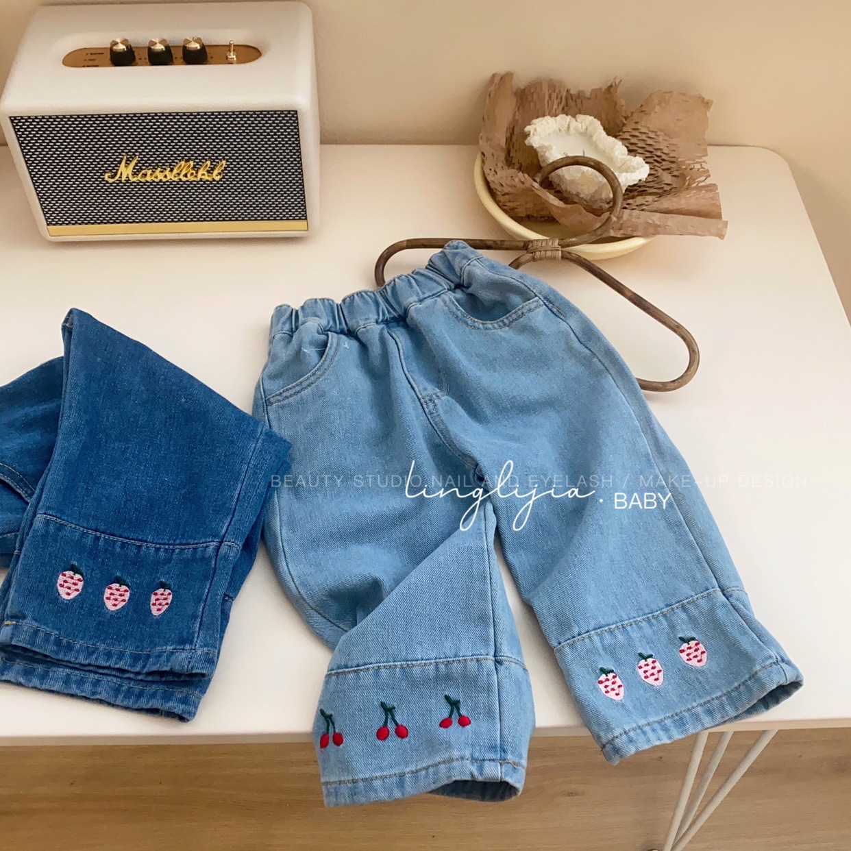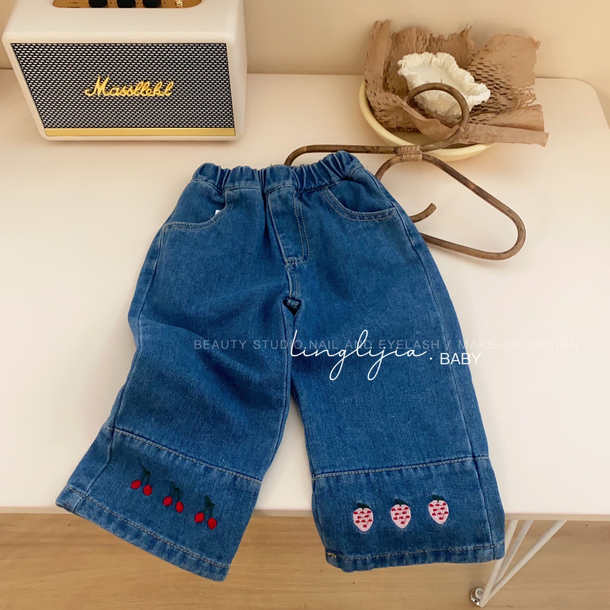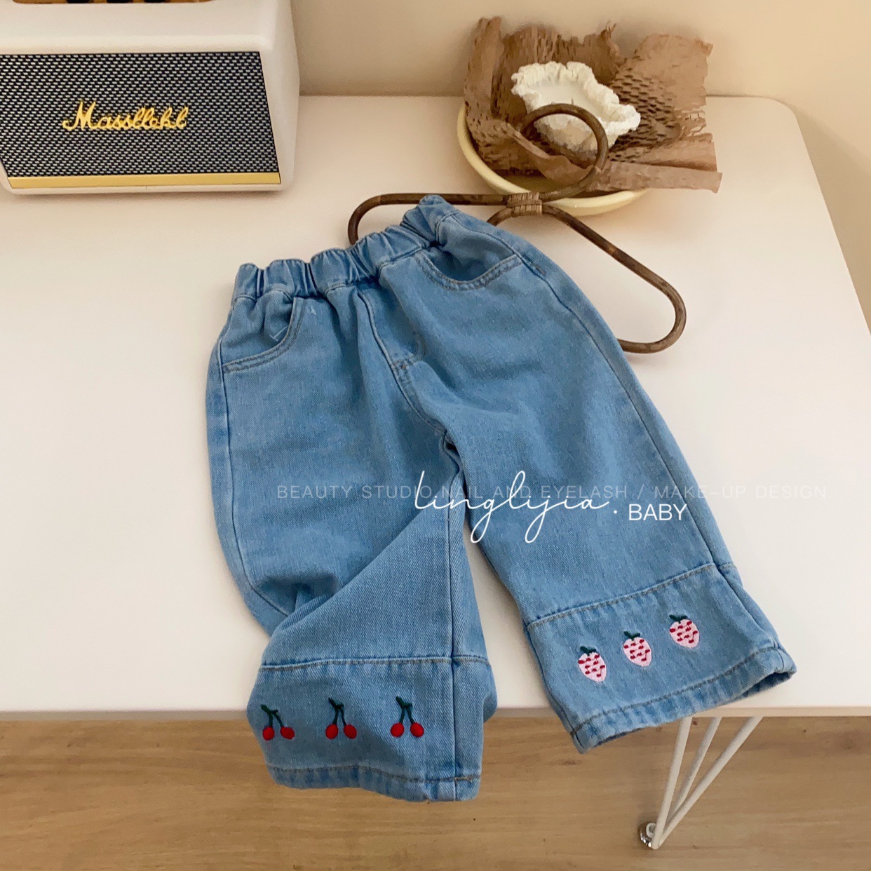 Little Salty Lemon 여아 캐주얼 청바지 1-7세 가을 베이비 한국 스타일 바지 스트레이트 체리 딸기 와이드 팬츠스토어 가기