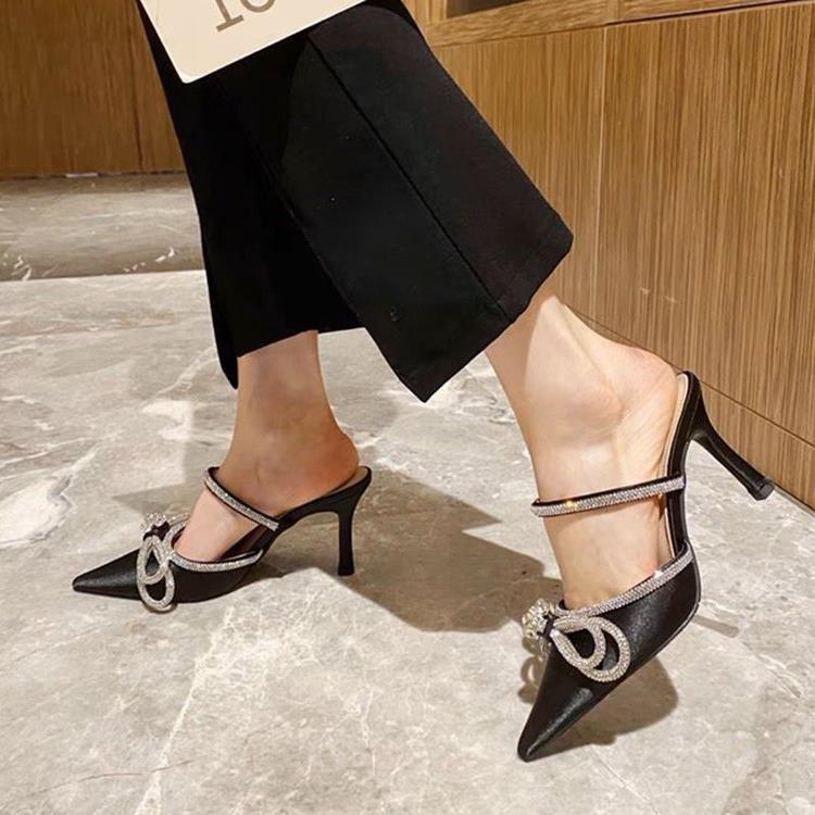 2023 봄 새로운 하이힐 여성용 스틸레토 힐 뾰족한 라인 석 활 신발 포장 탑 아우터 슬리퍼 샌들