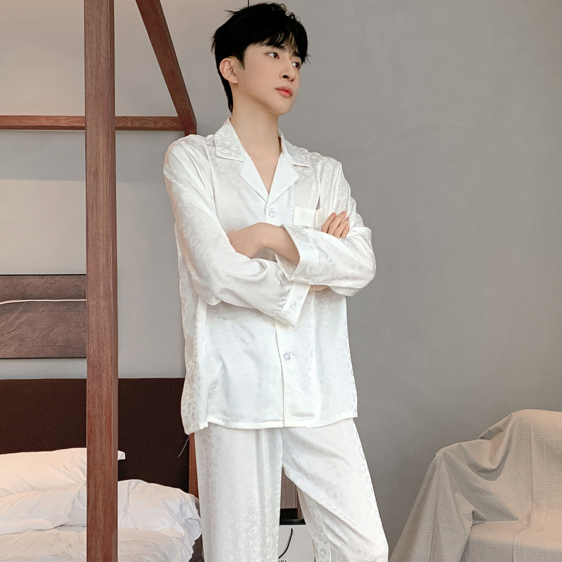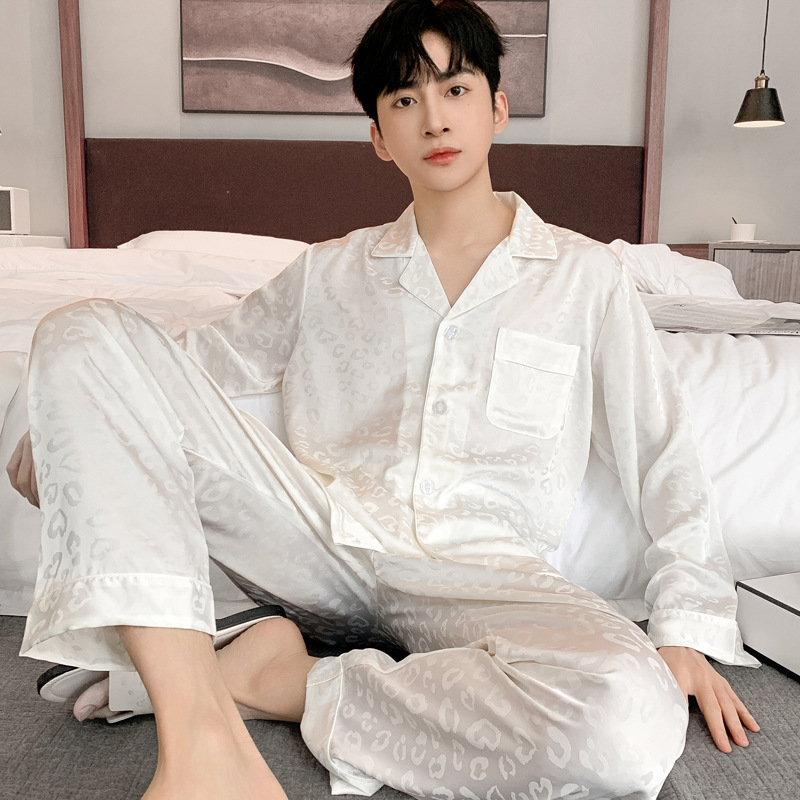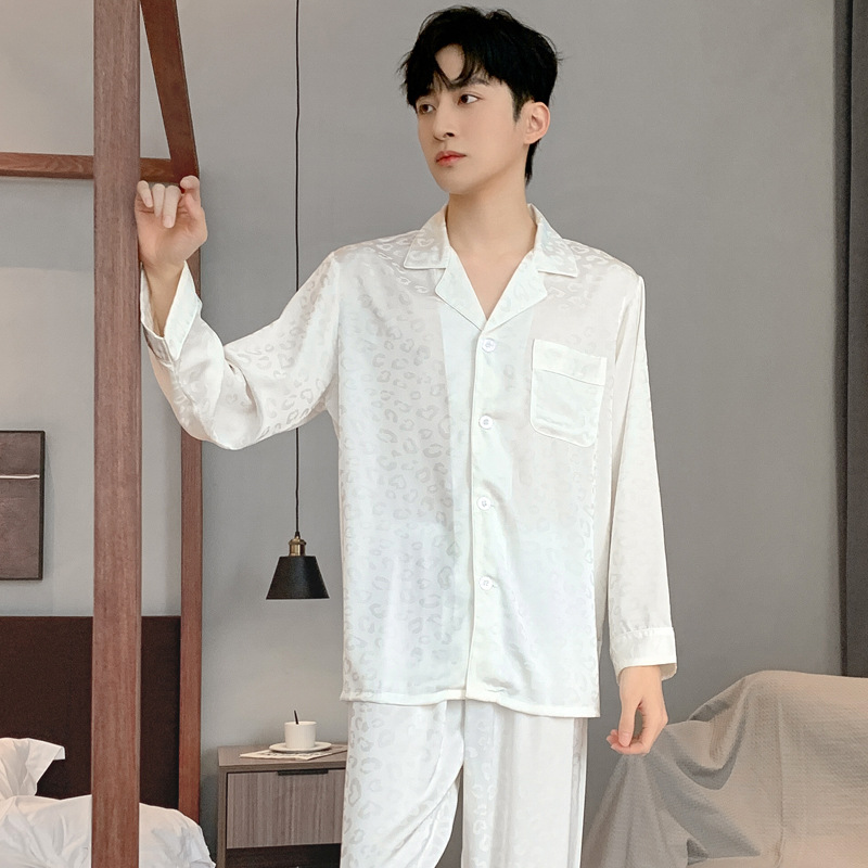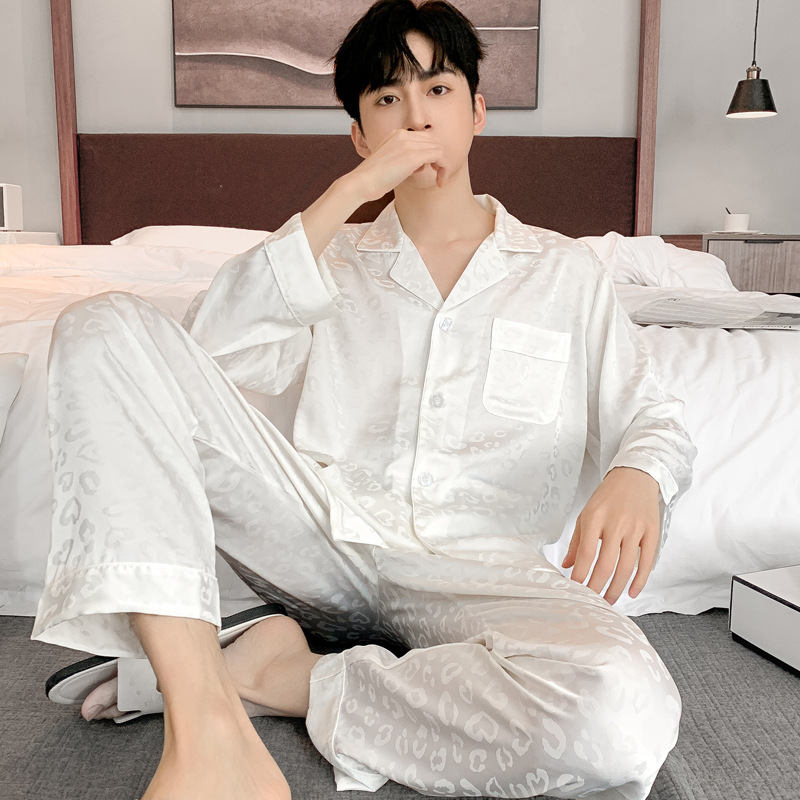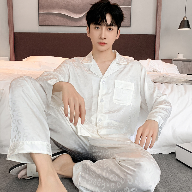 2023 새로운 봄과 가을 실크 긴 소매 남자의 잠옷 여름 고급 흰색 레오파드 무늬 여자의 가정 의류 세트