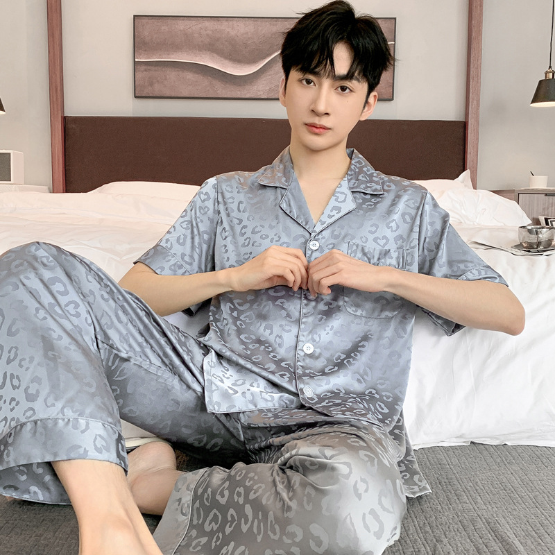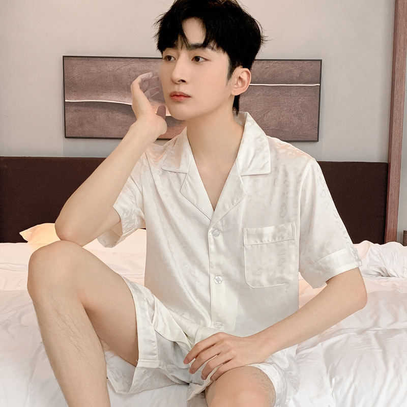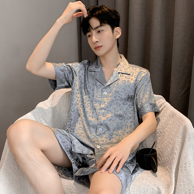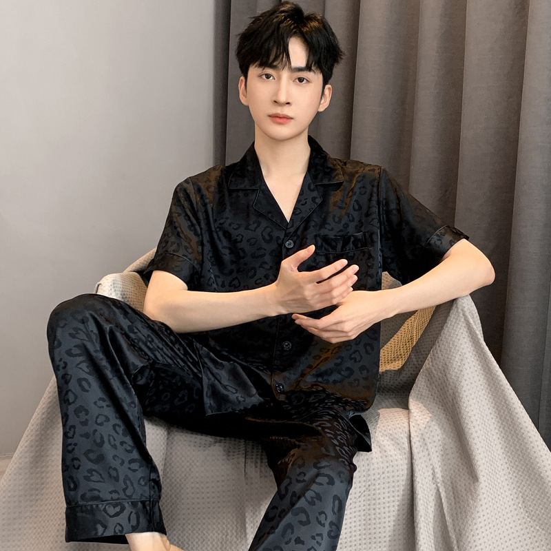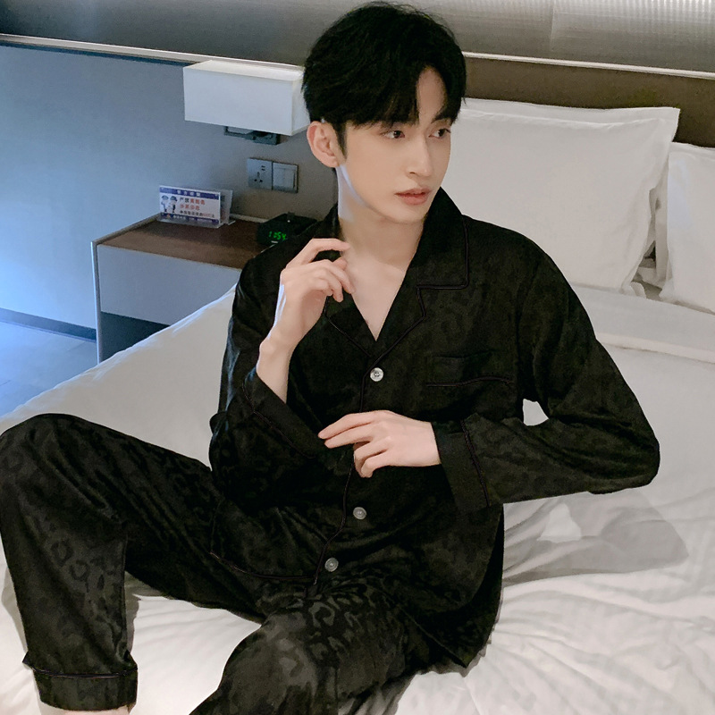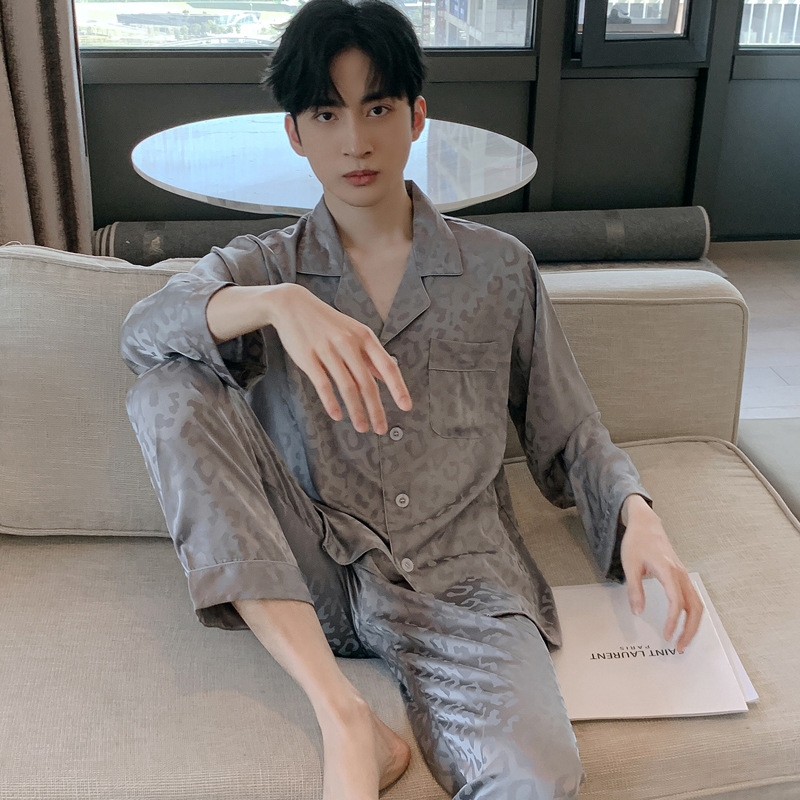 2023 새로운 봄과 가을 실크 긴 소매 남자의 잠옷 여름 고급 흰색 레오파드 무늬 여자의 가정 의류 세트