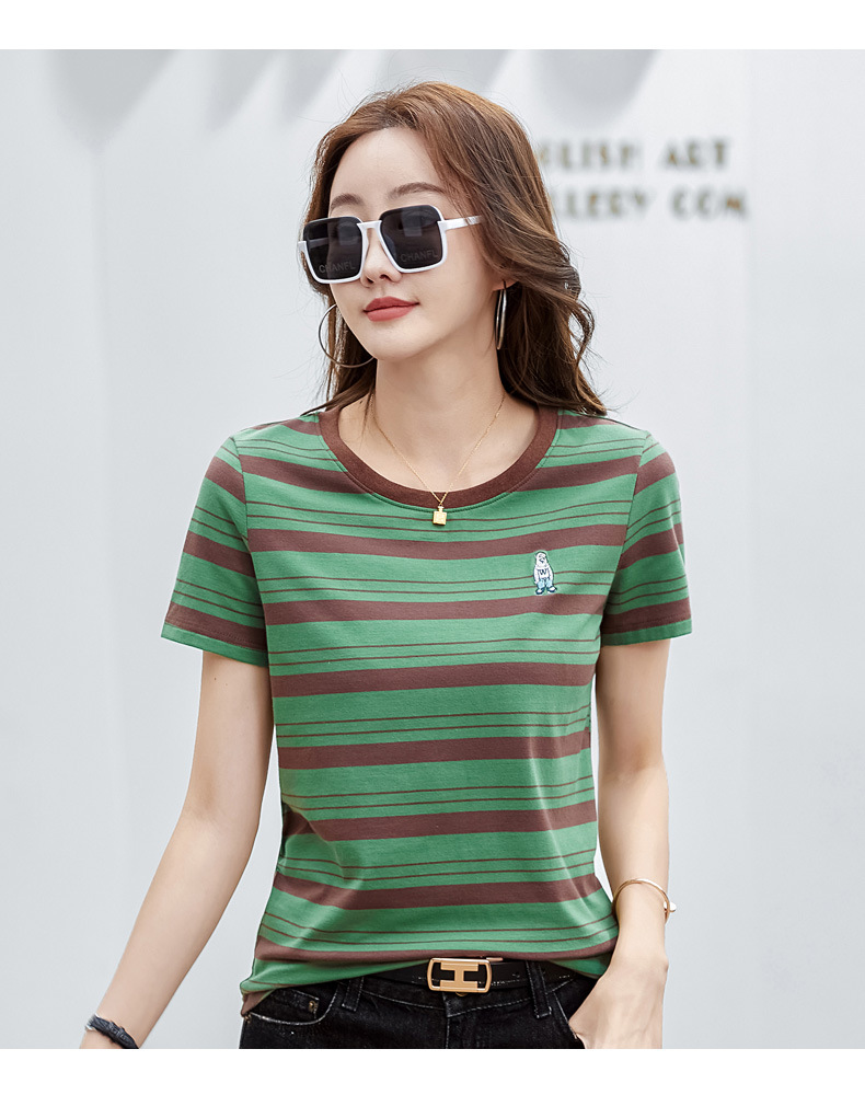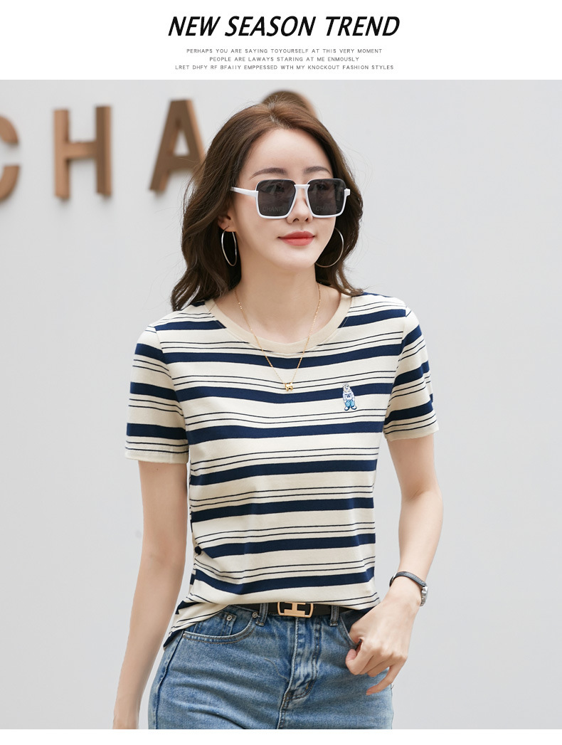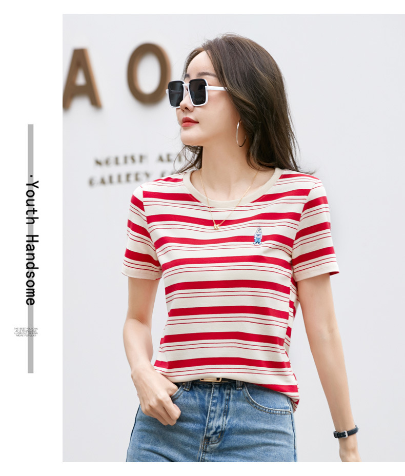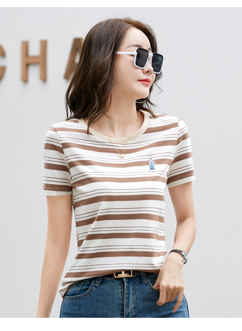 399 한국식 스트라이프 코튼 반팔 티셔츠 여성용 여름 캐주얼 틈새 디자인 시크 자수 베어 루즈한 탑