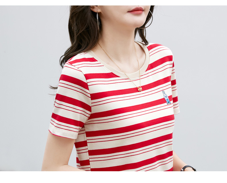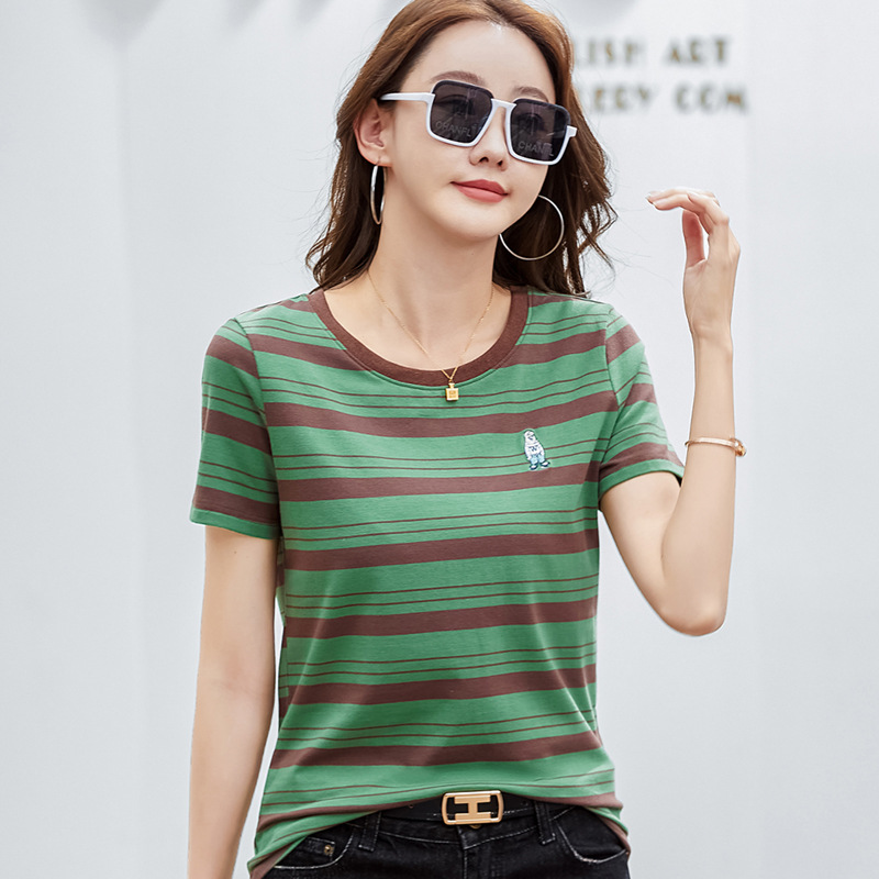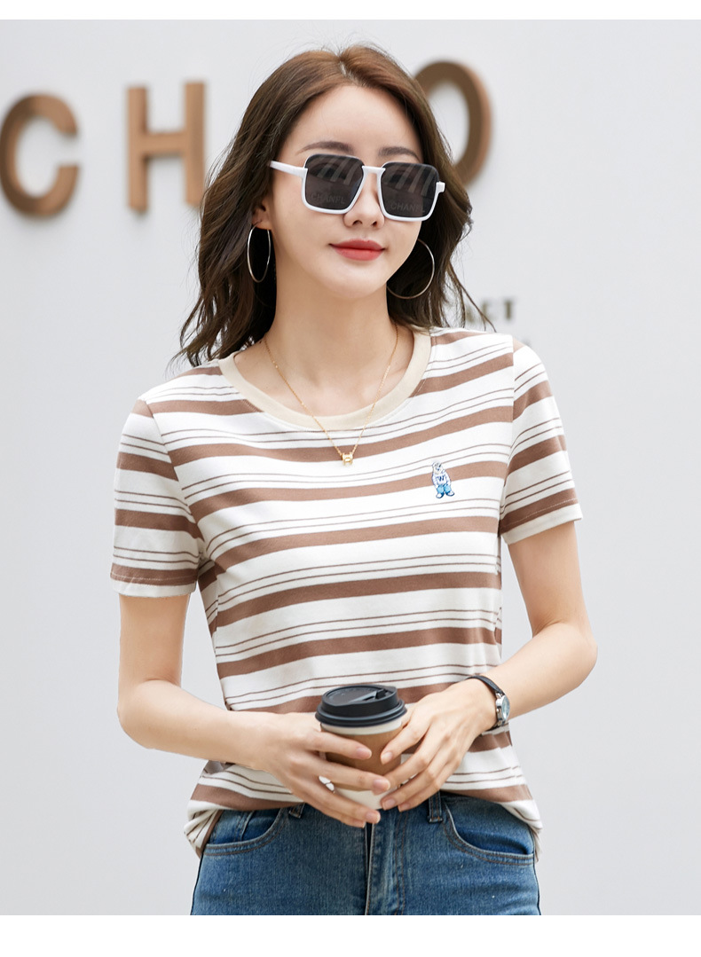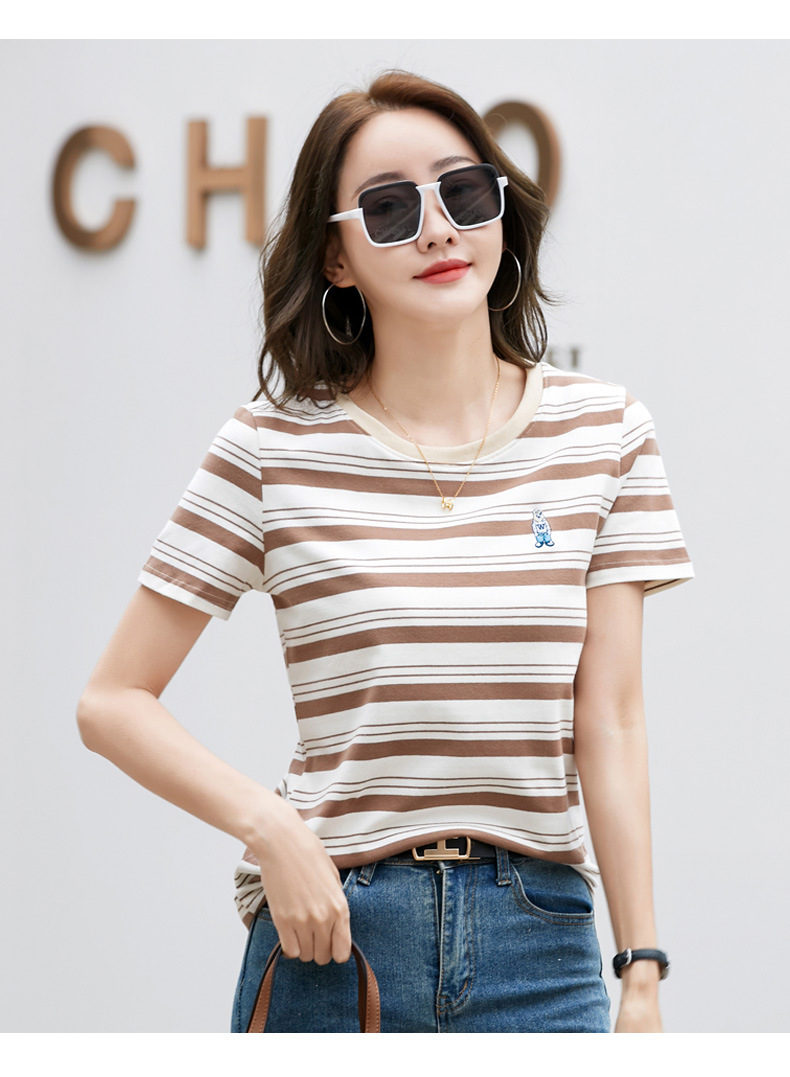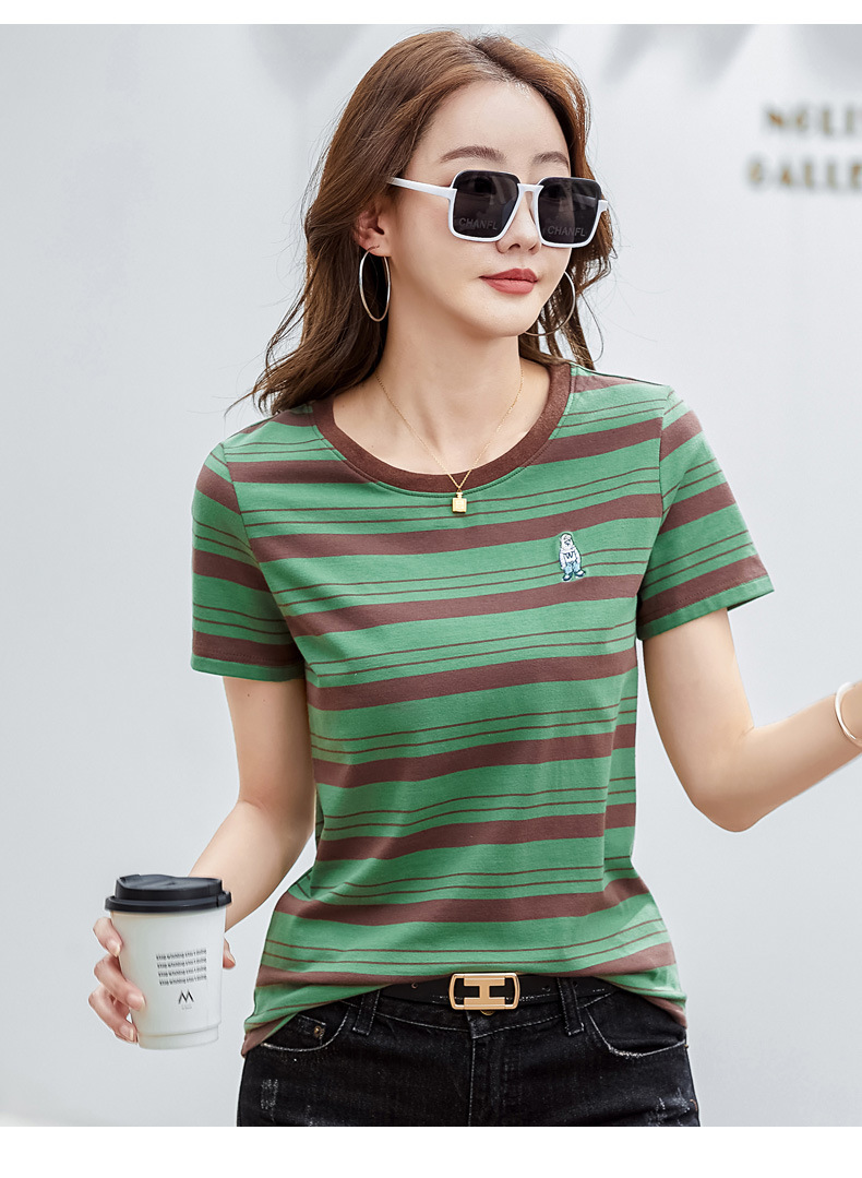 399 한국식 스트라이프 코튼 반팔 티셔츠 여성용 여름 캐주얼 틈새 디자인 시크 자수 베어 루즈한 탑