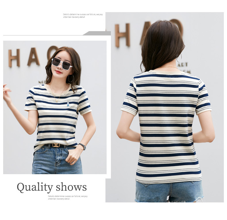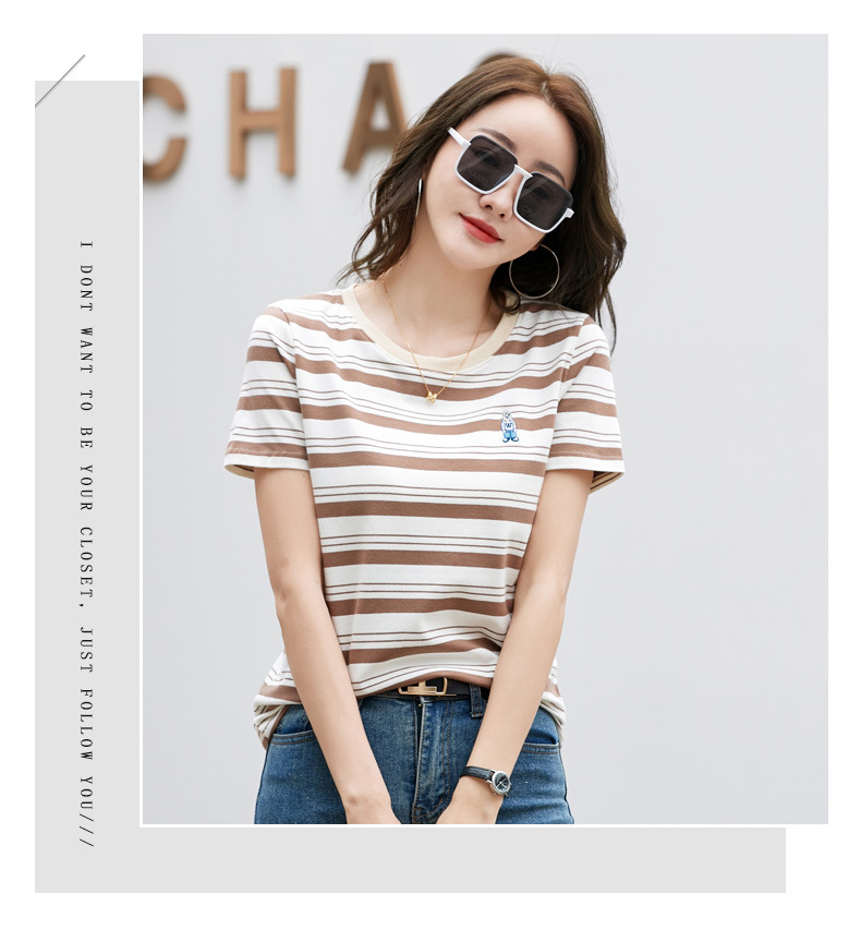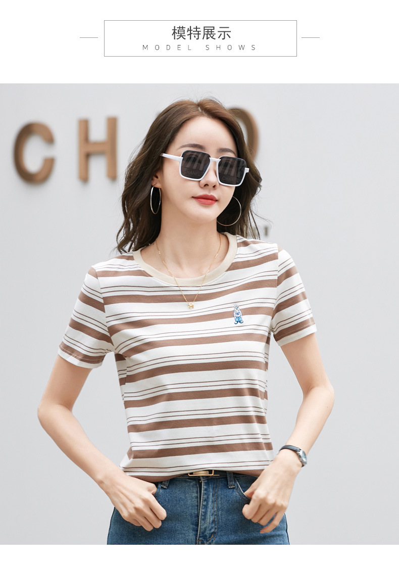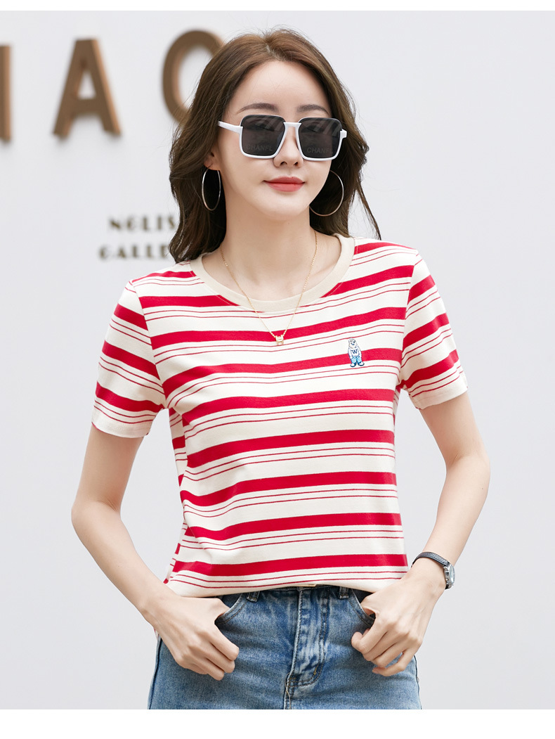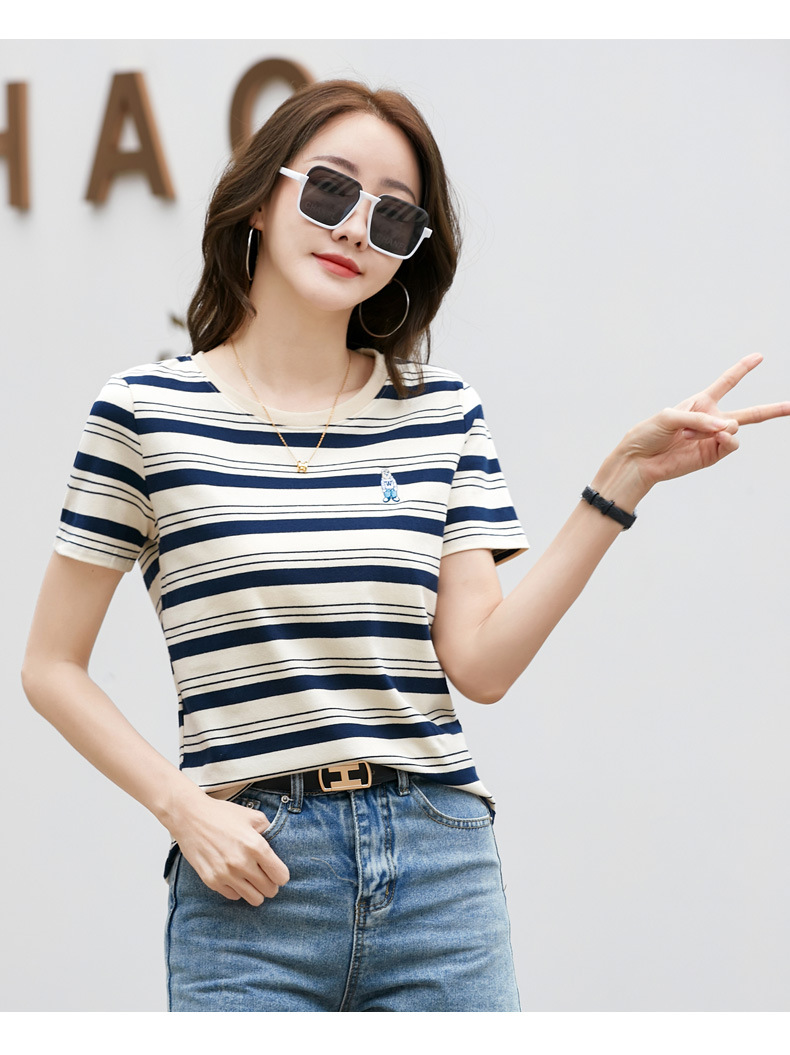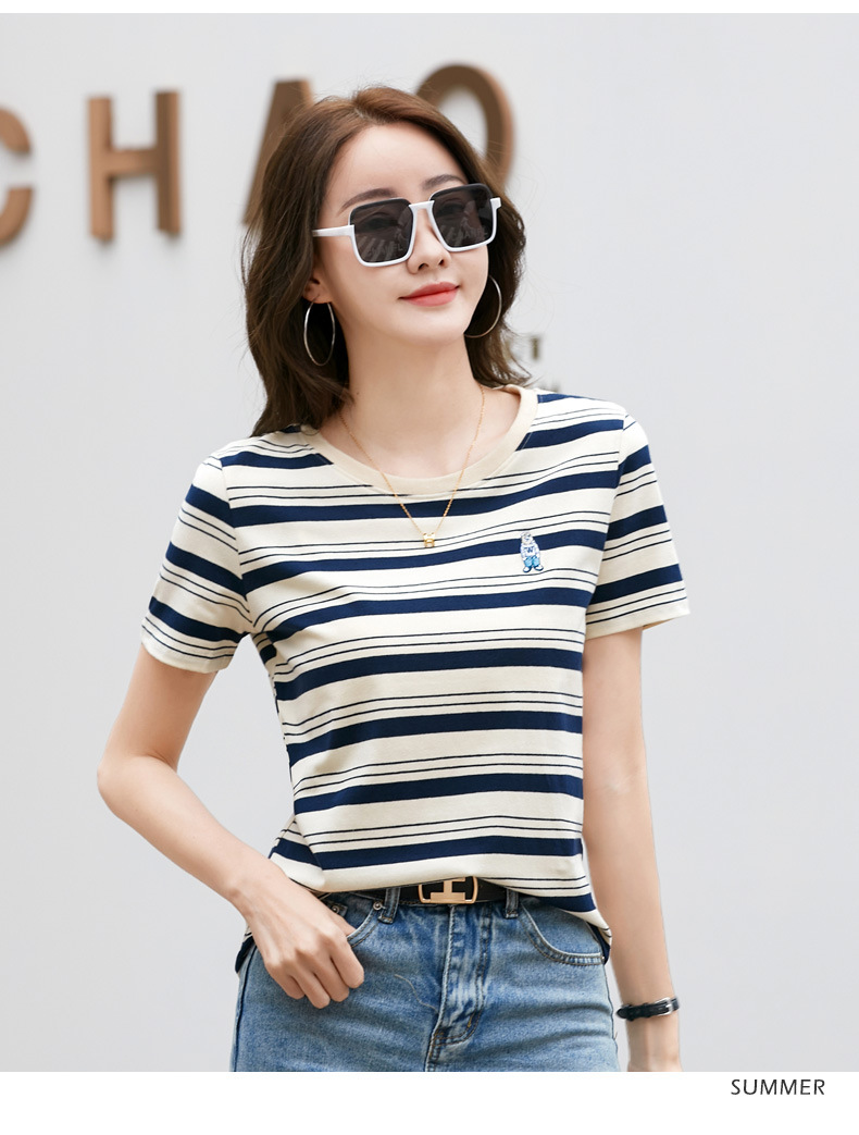399 한국식 스트라이프 코튼 반팔 티셔츠 여성용 여름 캐주얼 틈새 디자인 시크 자수 베어 루즈한 탑스토어 가기