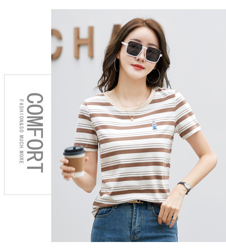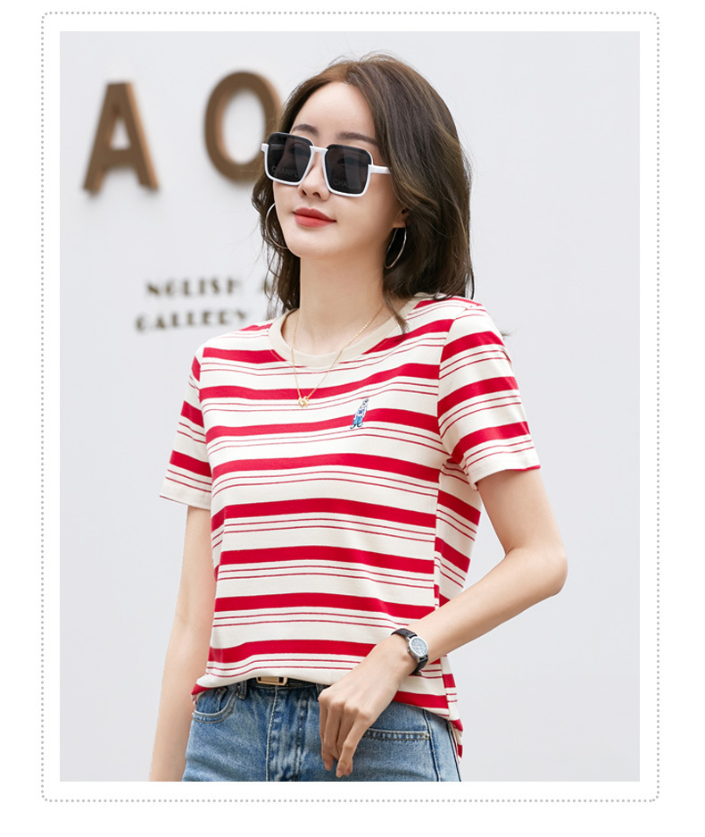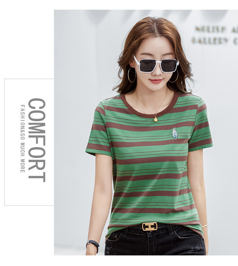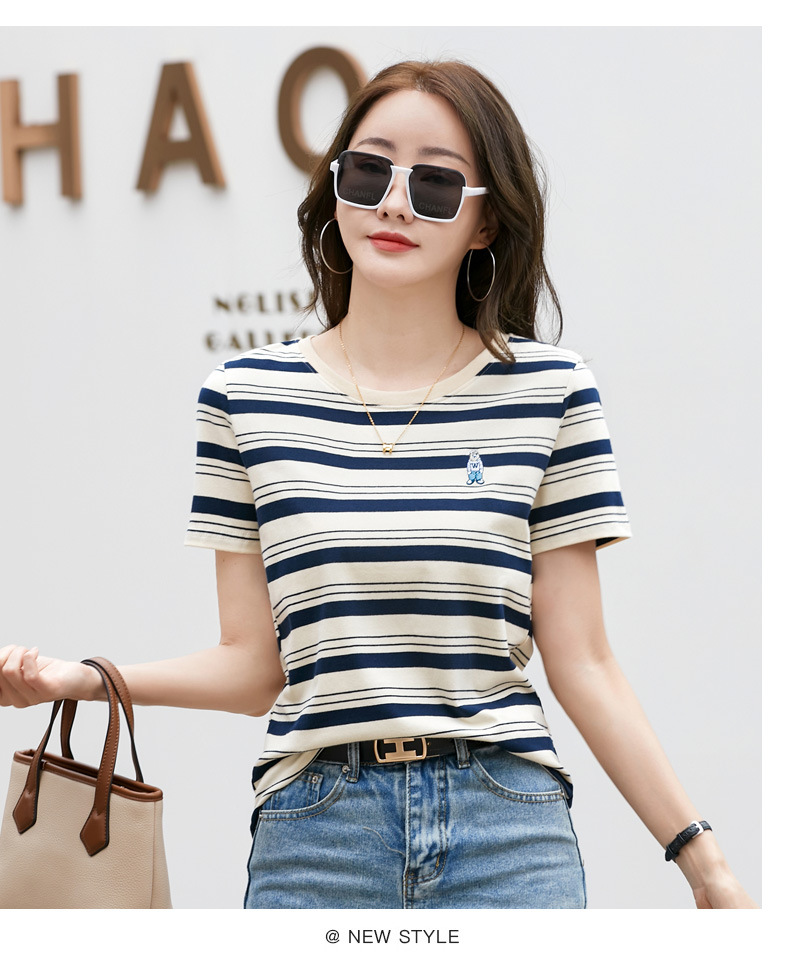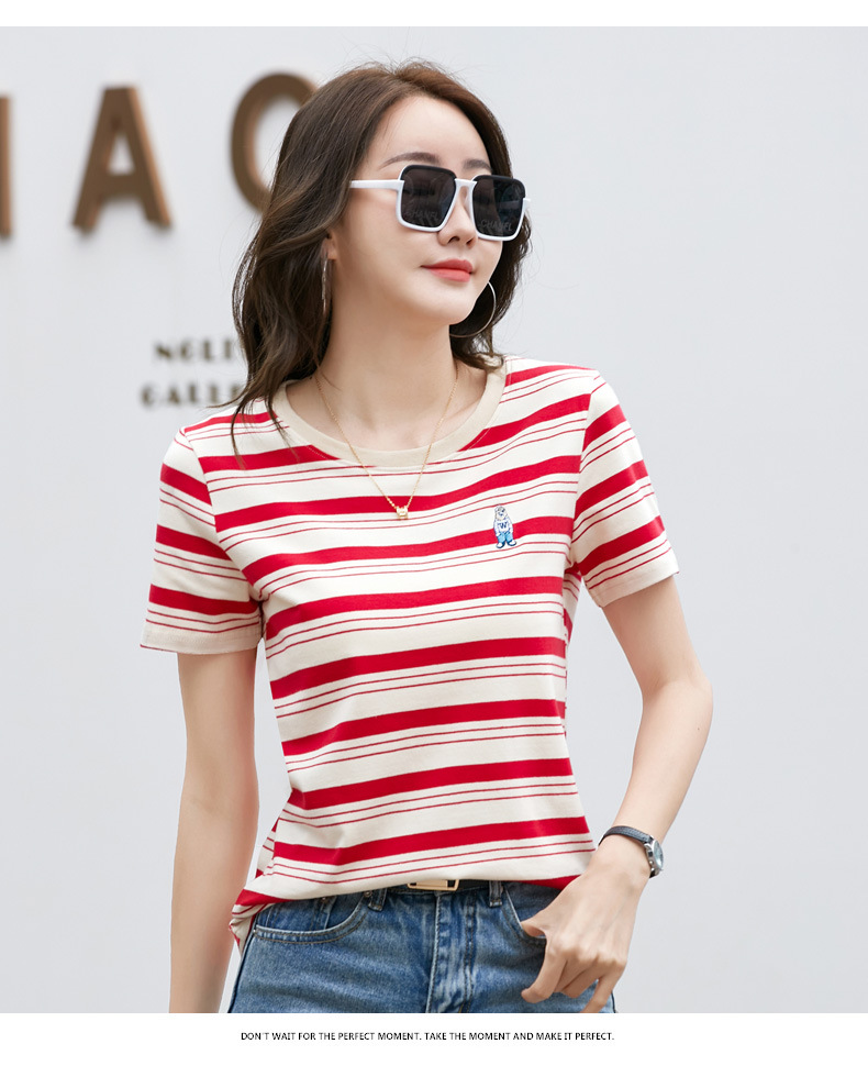 399 한국식 스트라이프 코튼 반팔 티셔츠 여성용 여름 캐주얼 틈새 디자인 시크 자수 베어 루즈한 탑스토어 가기
