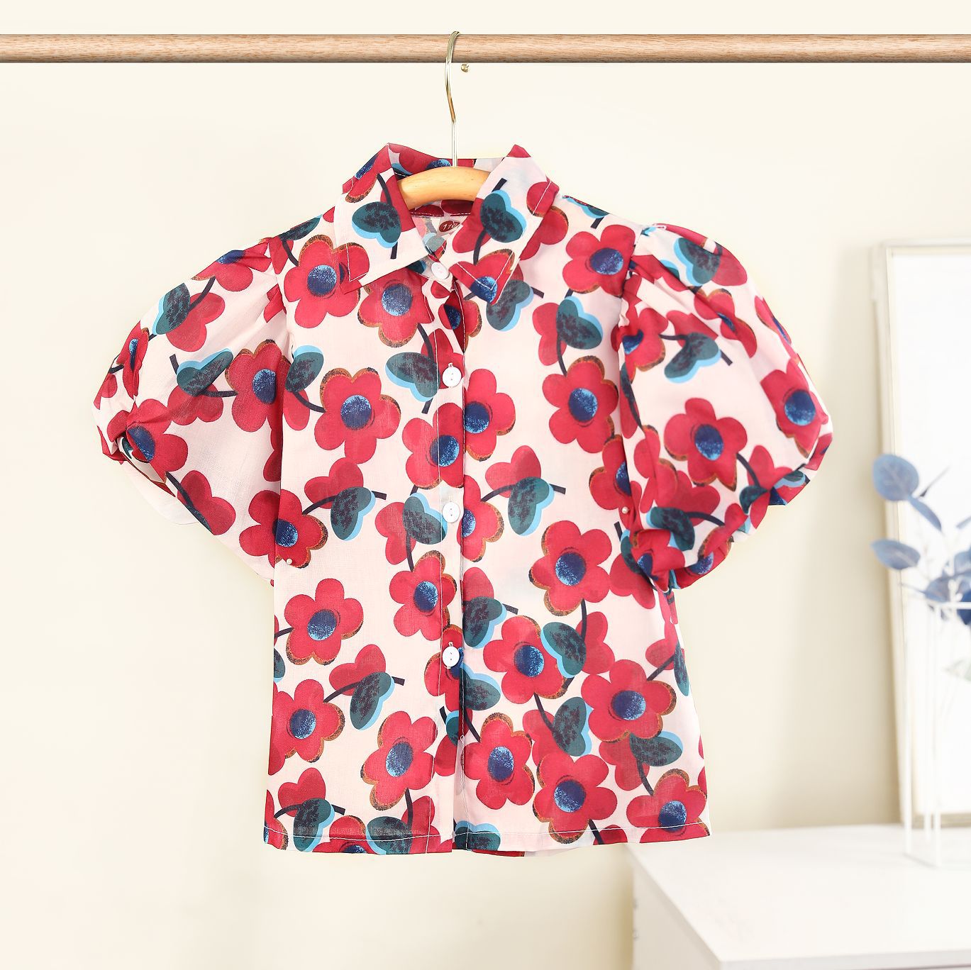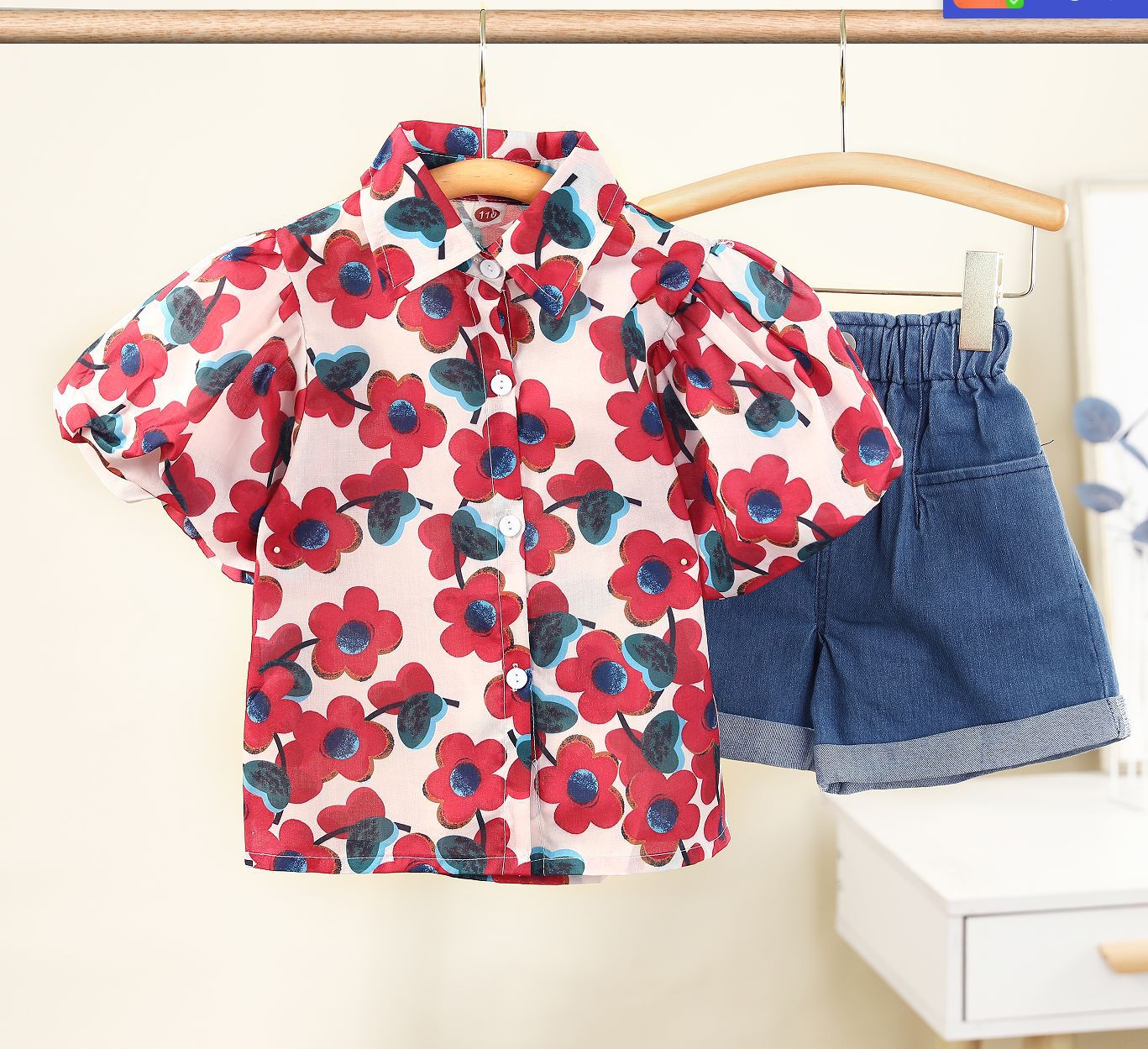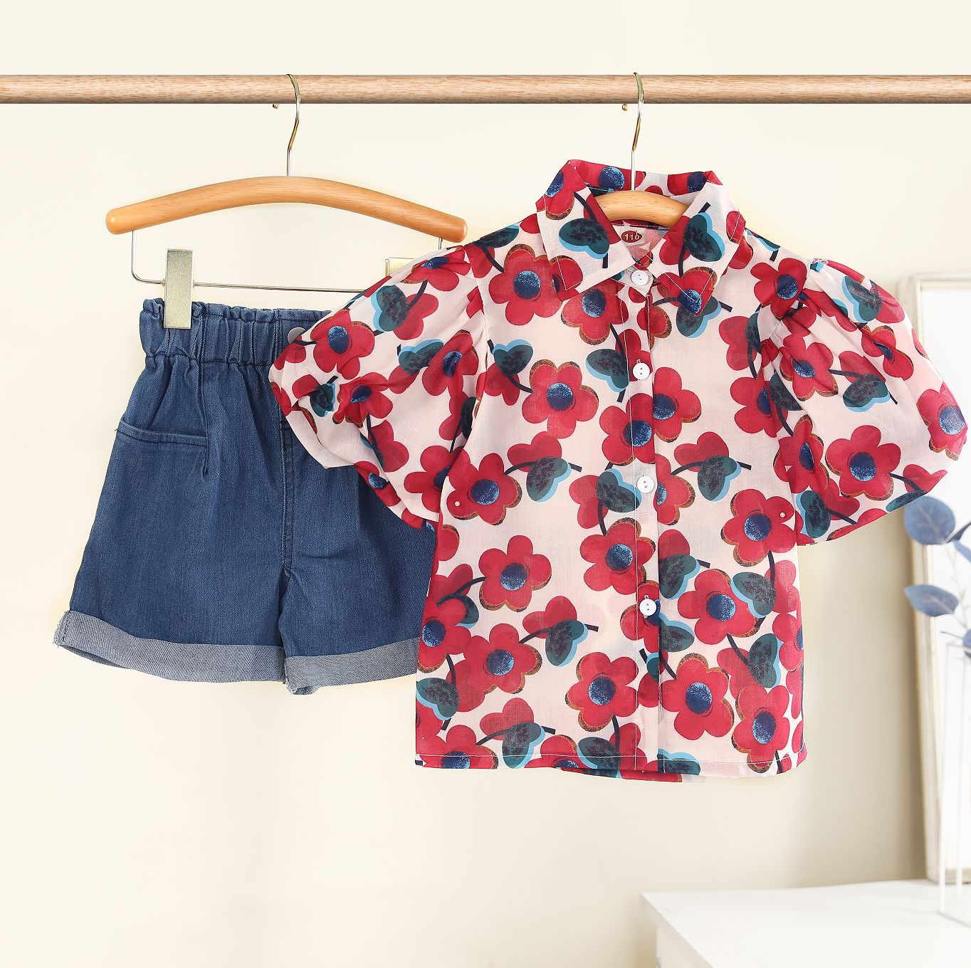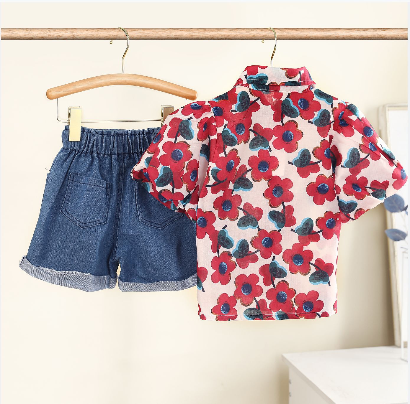 2025년 신상 여아 꽃무늬 셔츠 퍼프 소매 반팔 라펠 셔츠+데님 반바지 투피스 세트