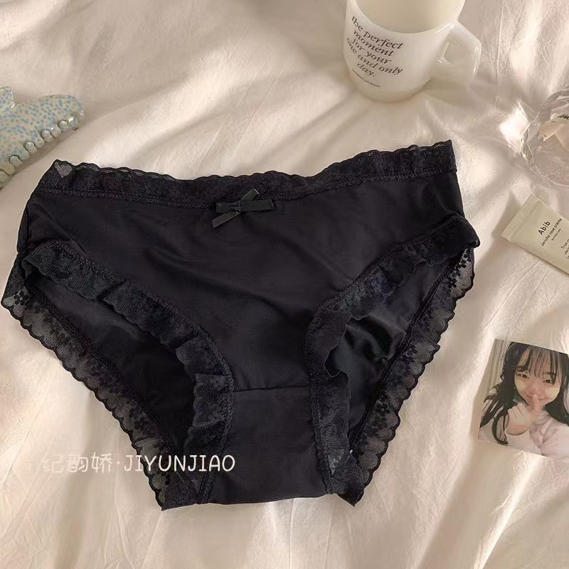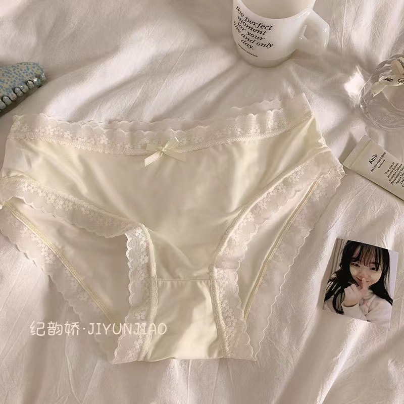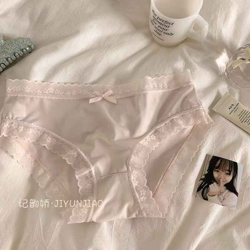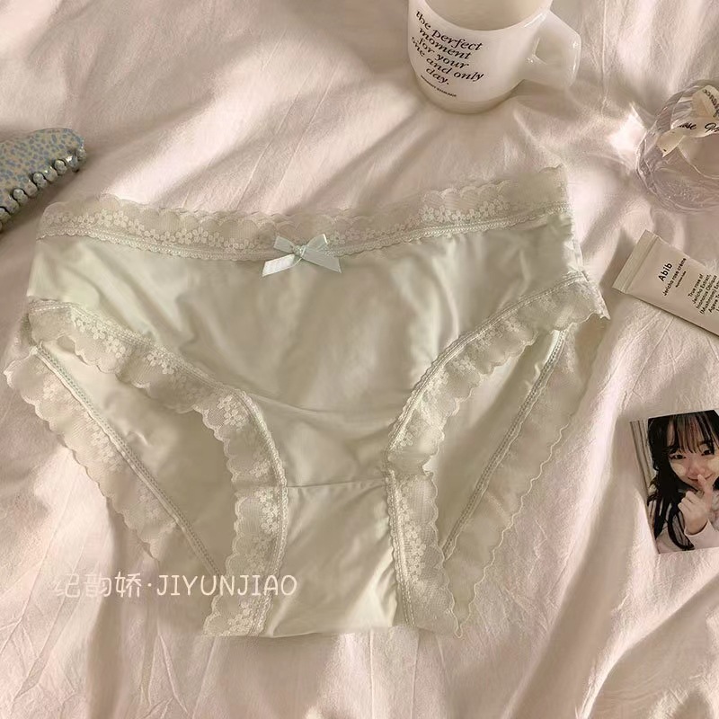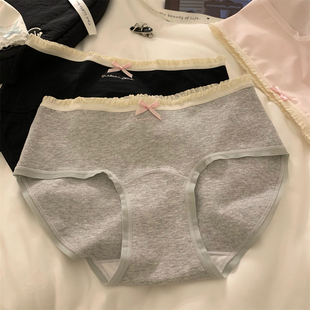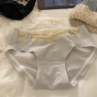 日系纯欲甜美蕾丝边内裤女士性感甜美中腰蝴蝶结三角纯棉内裤女