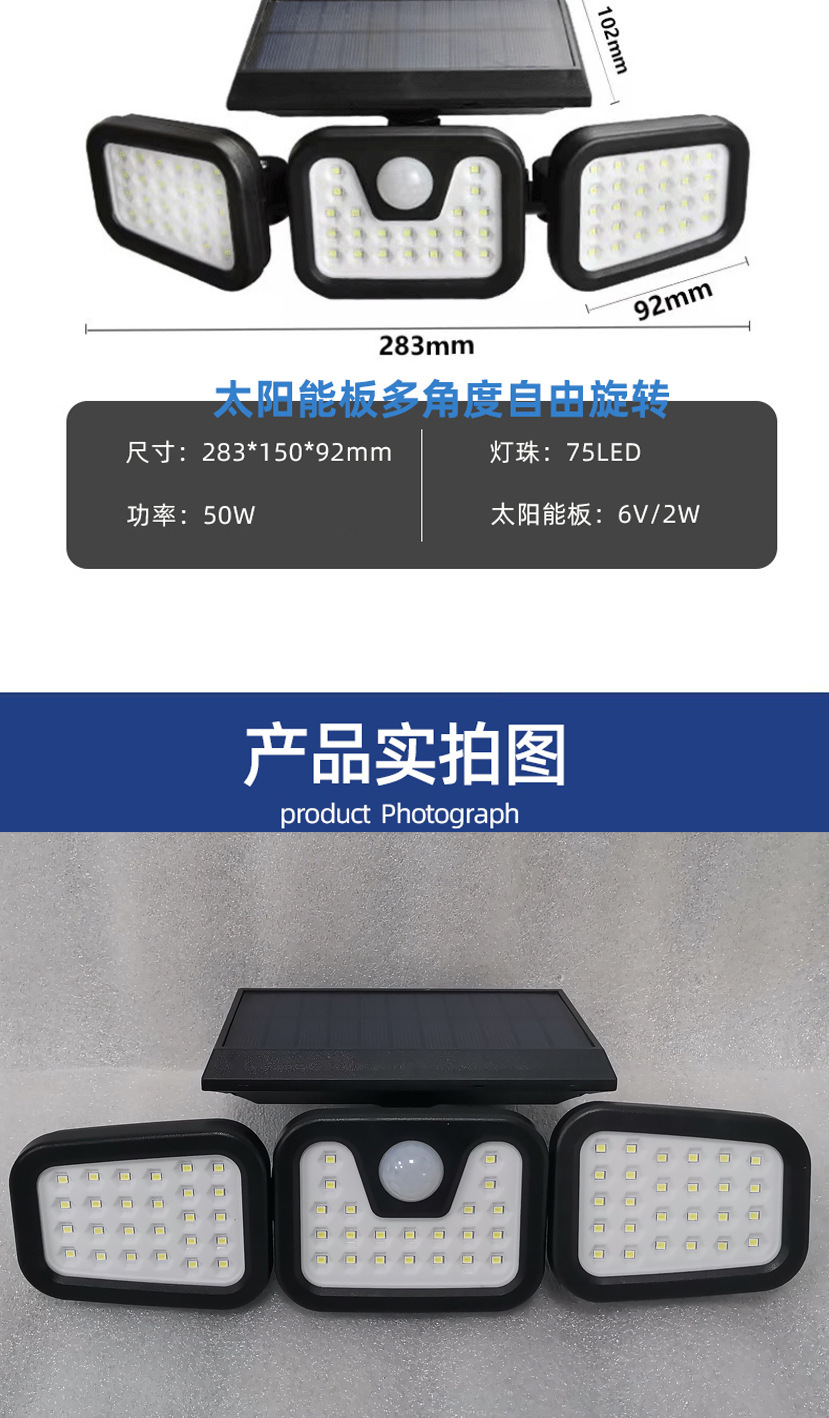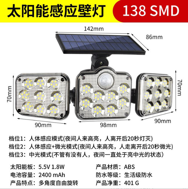 태양광 센서 라이트 맞춤형 74LED 삼중 회전형 벽등 야외 조명 제어 방수 도로 정원 가로등