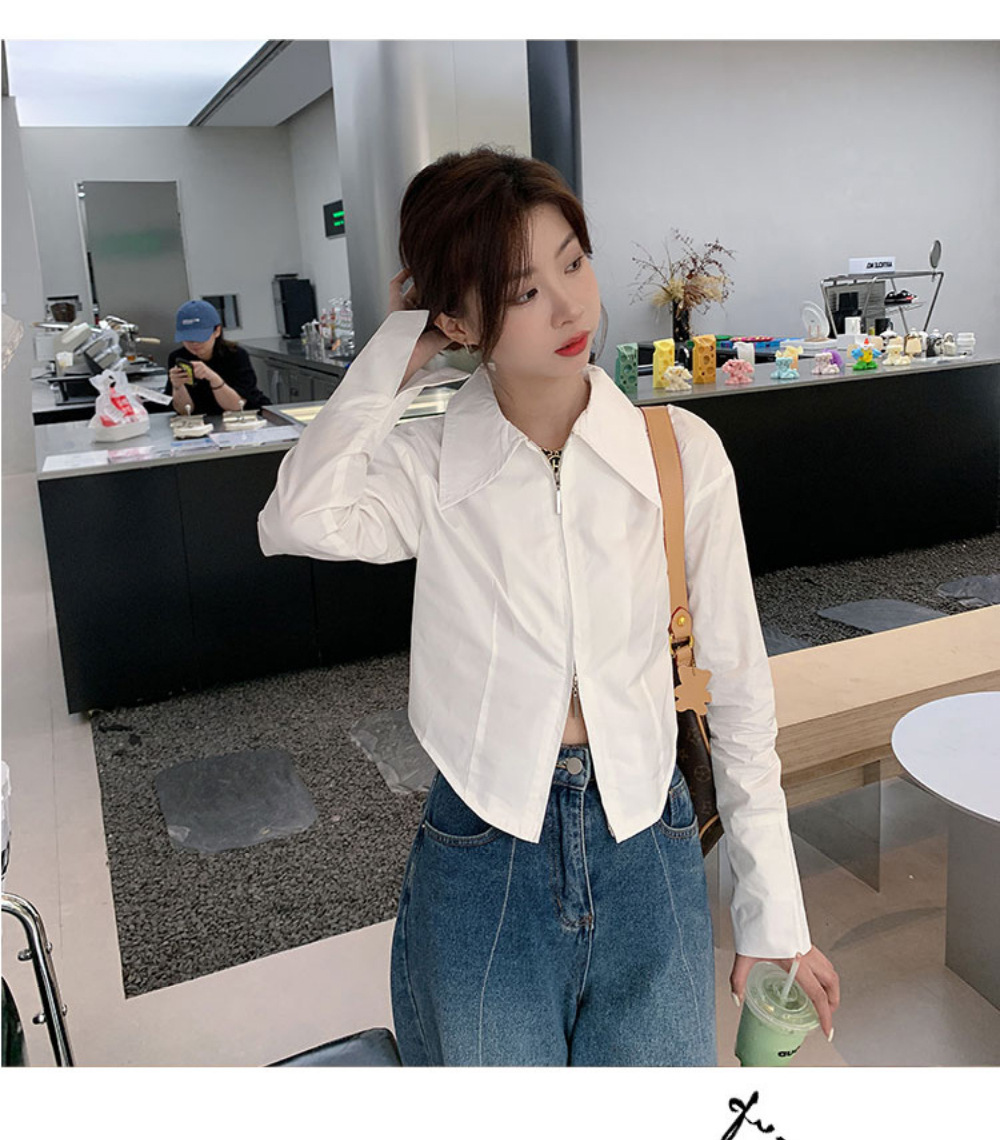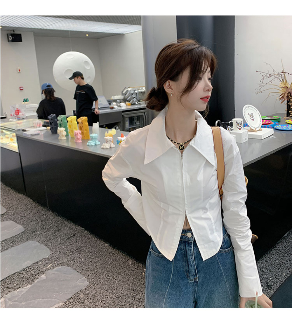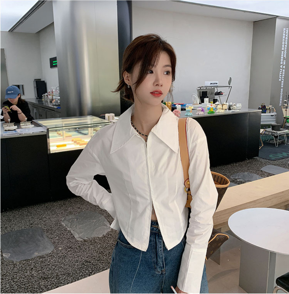 프랑스 스타일 우아한 지퍼 화이트 셔츠 여성용 봄 디자인 센스 짧은 시크 탑 베이스 긴 소매 셔츠