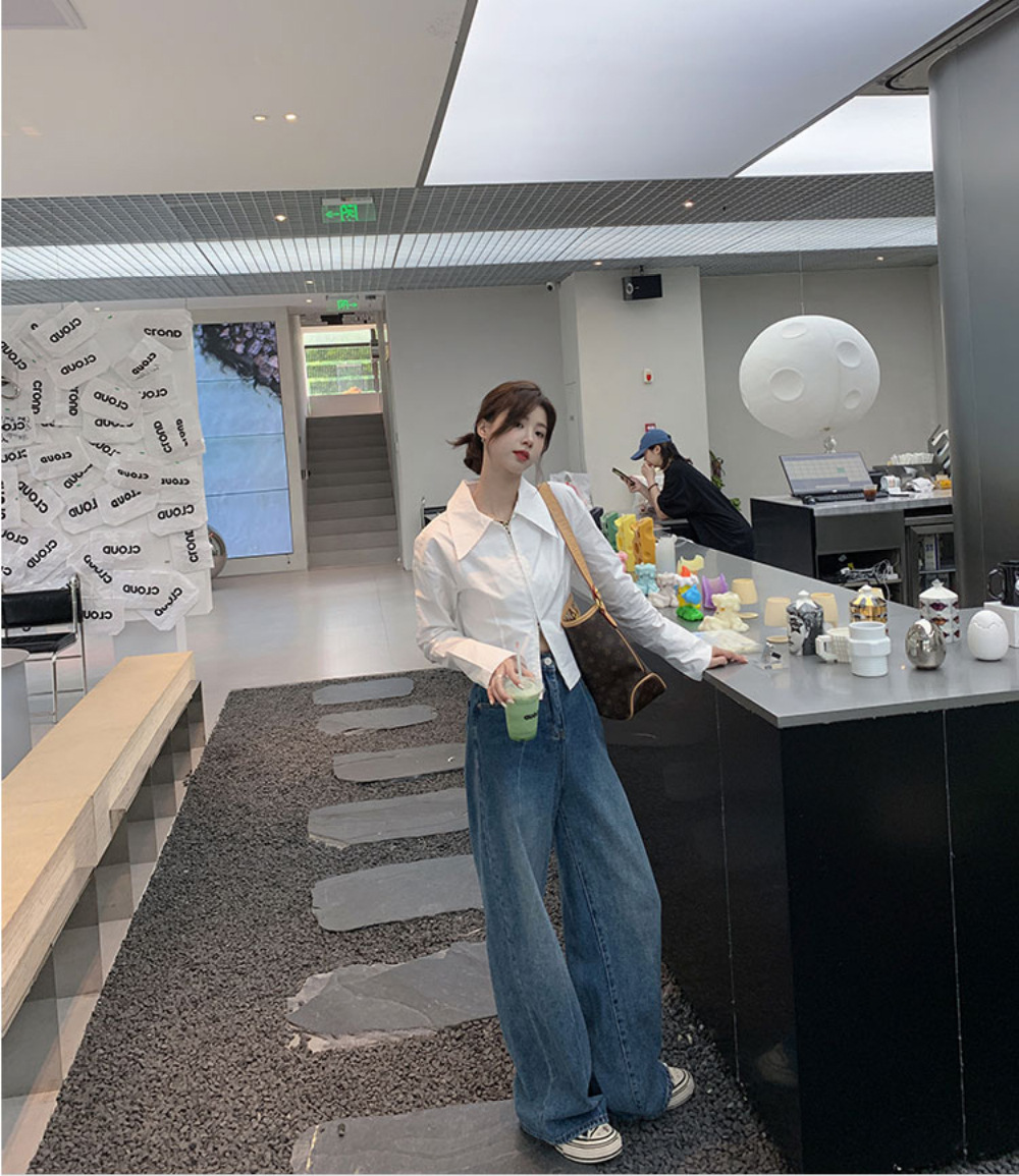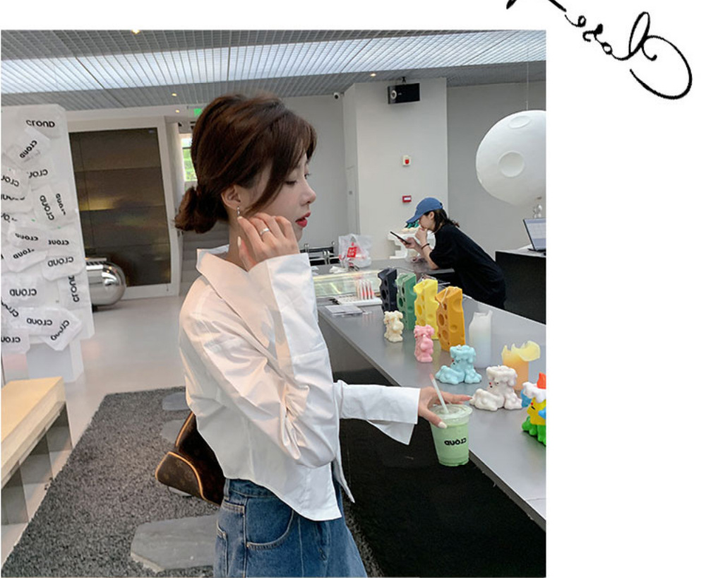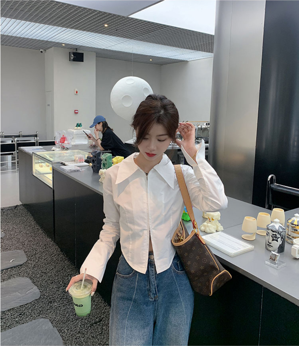 프랑스 스타일 우아한 지퍼 화이트 셔츠 여성용 봄 디자인 센스 짧은 시크 탑 베이스 긴 소매 셔츠