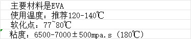 主要材料是EVA    使用温度:推荐120-140℃  软化点:77~80℃  粘度:6500-7000±500mpa.s (180℃)undefined