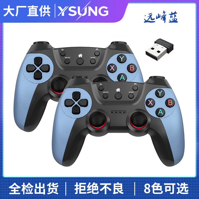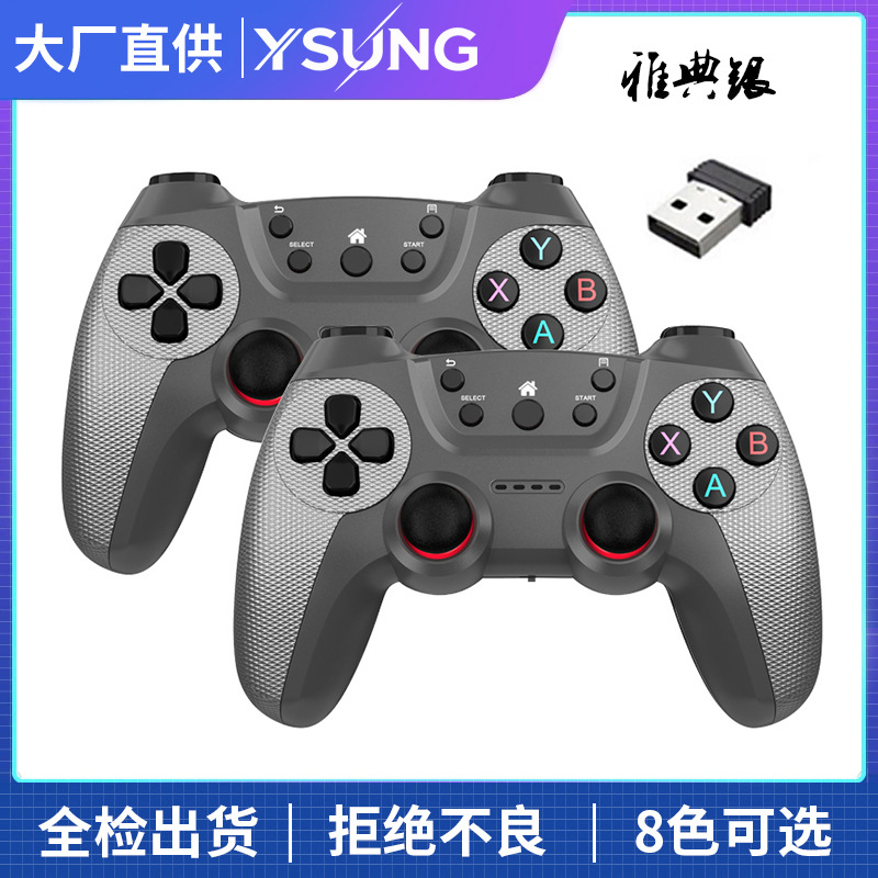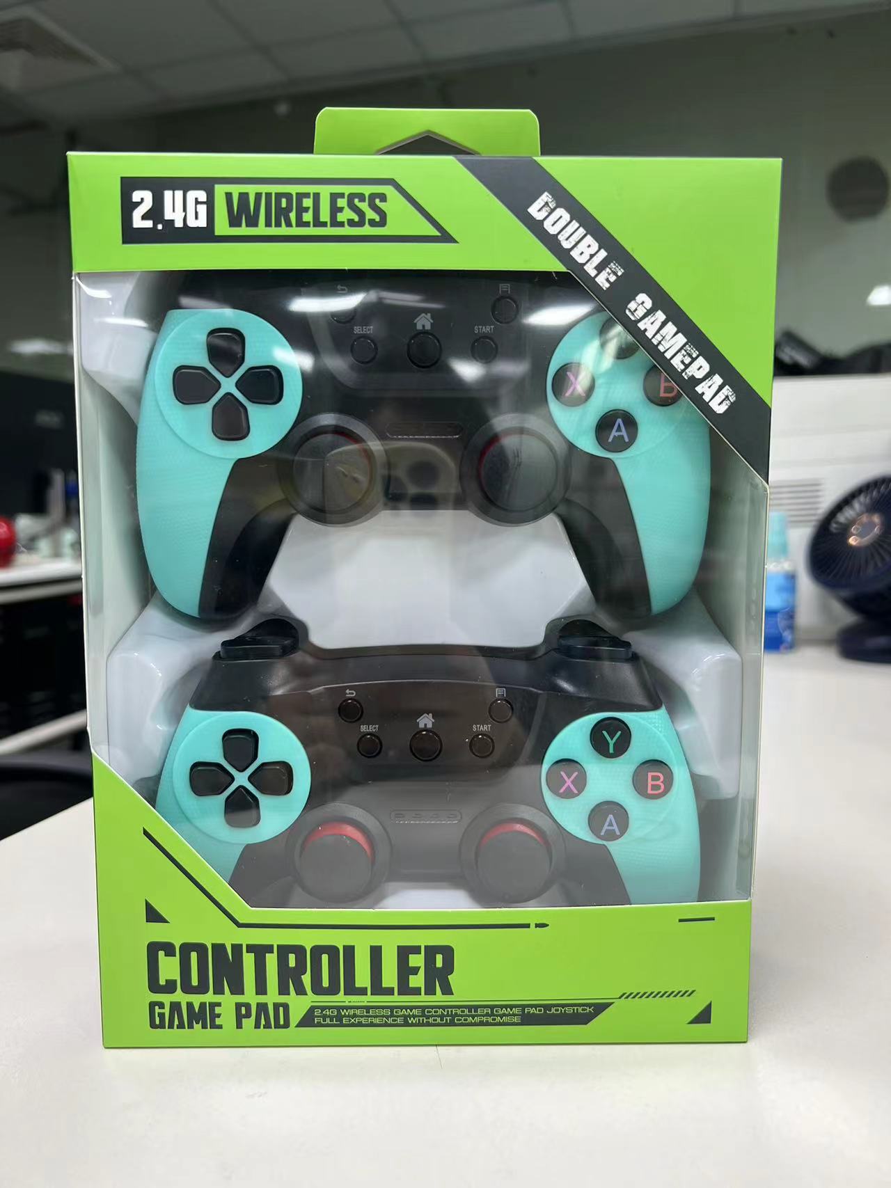 设备上插上2.4G接收器,双手柄安装上2个7号电池。(本品不配有电池)。打开手柄开关。