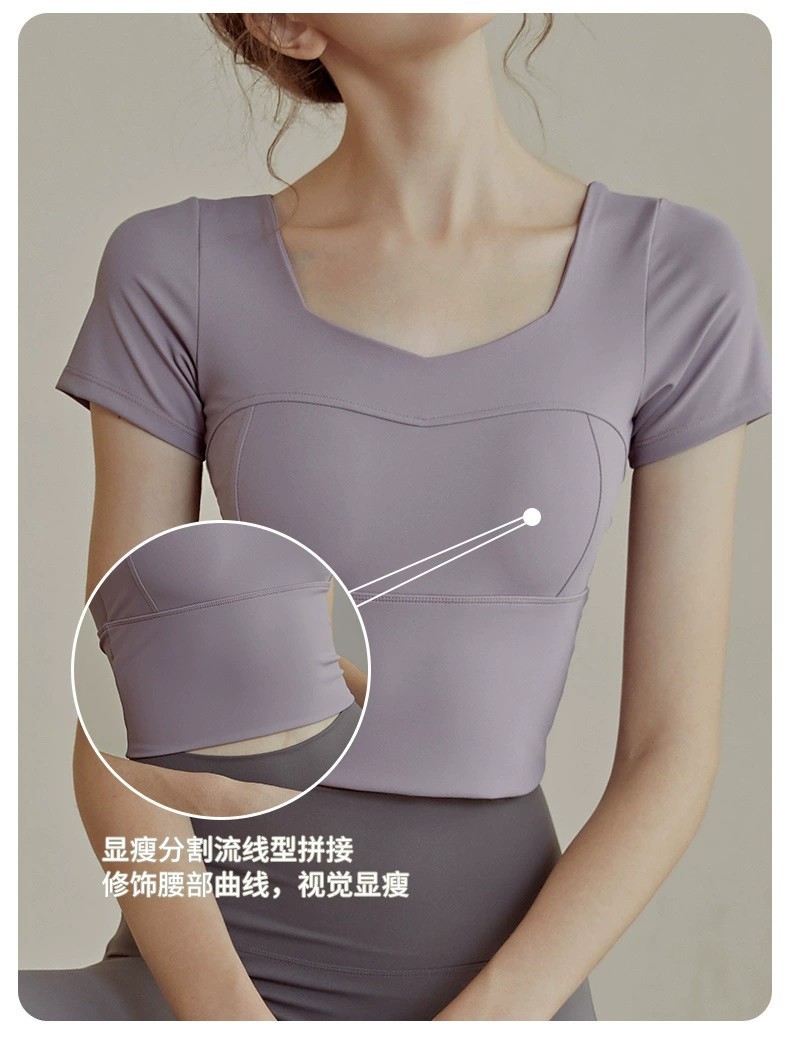 가슴 매트가있는 여름 반팔 요가 의류 여성용 러닝 스포츠 탑 고탄성 속건 꽉 피트니스 티셔츠 얇은스토어 가기