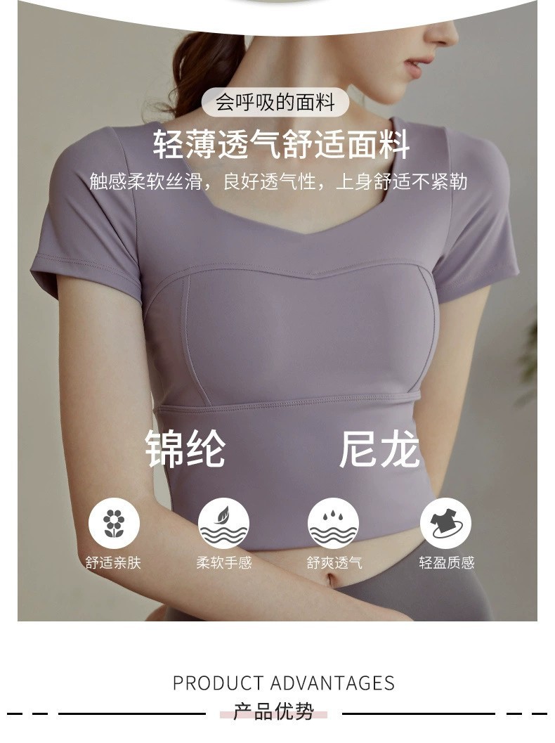 가슴 매트가있는 여름 반팔 요가 의류 여성용 러닝 스포츠 탑 고탄성 속건 꽉 피트니스 티셔츠 얇은