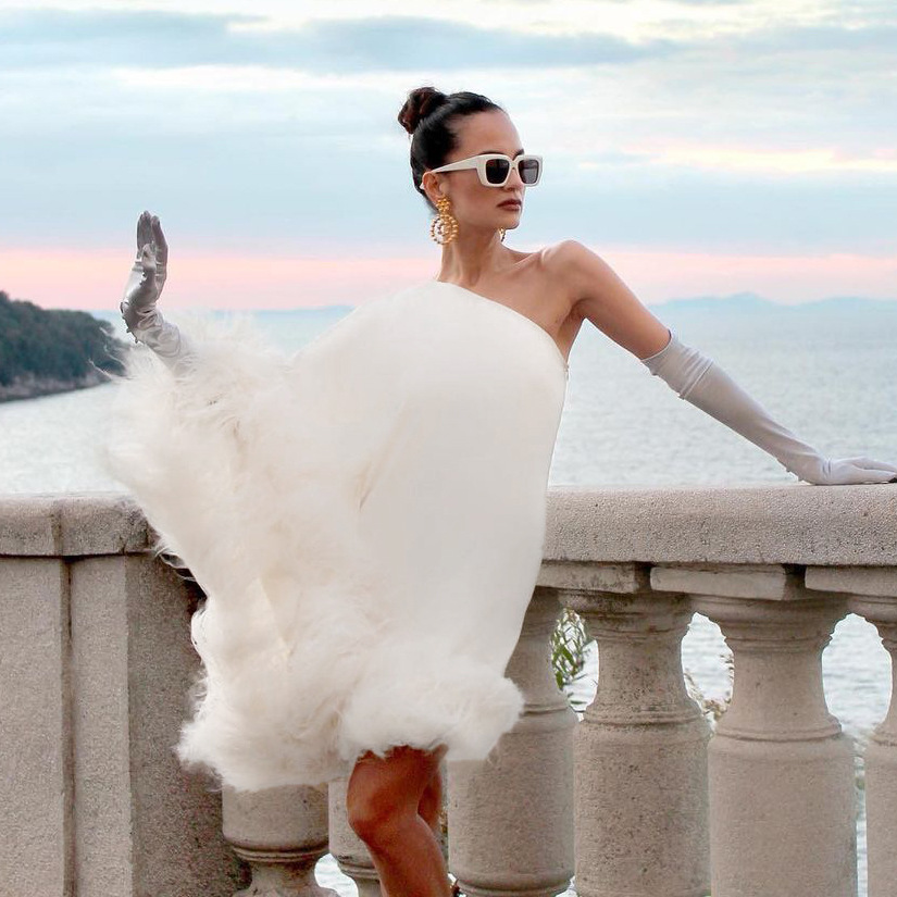 JFL22485 섹시한 어깨 모피 밑단 케이프 스타일 원피스 유럽과 미국 파티 짧은 슬림 핏 힙 스커트 여성용스토어 가기