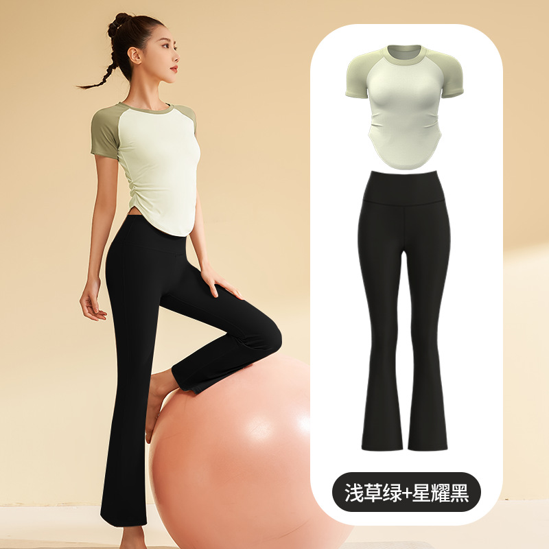 • 반팔 얕은 잔디 녹색 + 벨 바닥 바지 스타 블랙