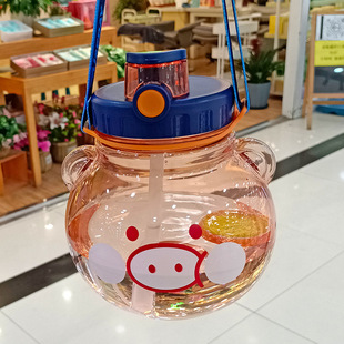 大肚子的水杯现货1500ML吸管塑料杯子小猪头超萌带背带弹跳网红杯