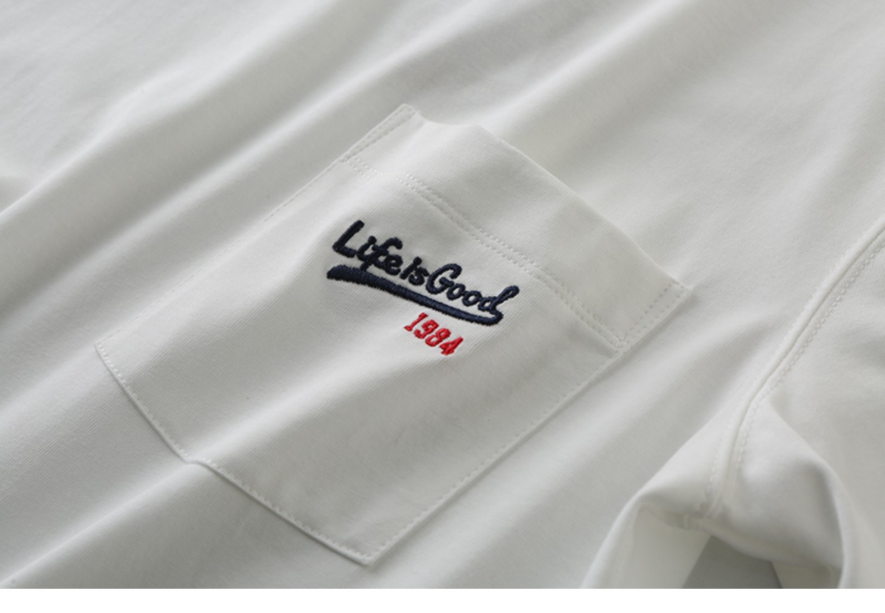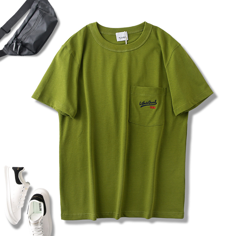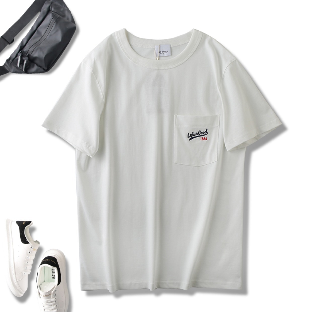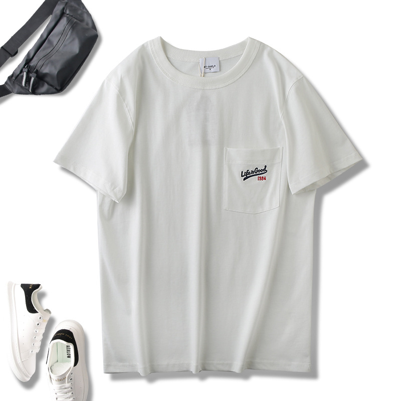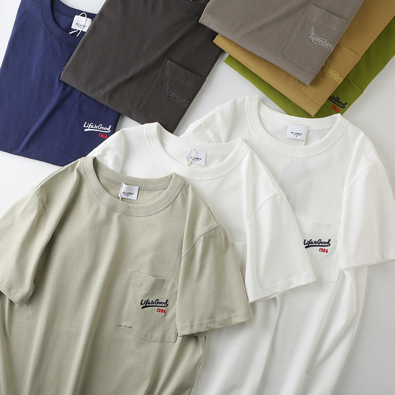 240g 일본 복고풍 간단한 편지 인쇄 반팔 티셔츠 남성 패션 느슨한 코튼 크루 넥 티셔츠 기본 셔츠 포켓