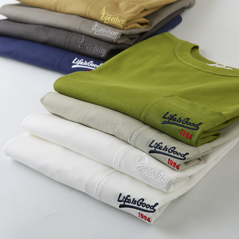 240g 일본 복고풍 간단한 편지 인쇄 반팔 티셔츠 남성 패션 느슨한 코튼 크루 넥 티셔츠 기본 셔츠 포켓스토어 가기