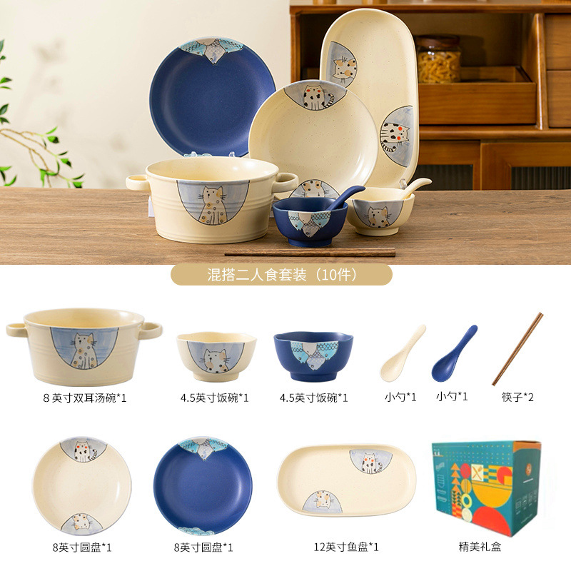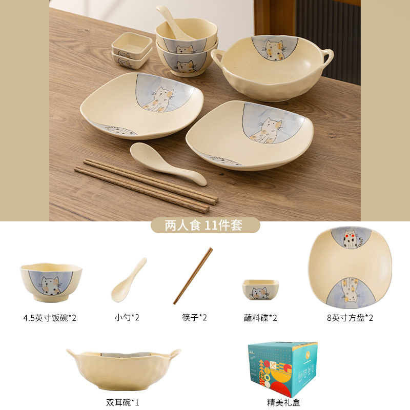 귀여운 식기 요리 세트 가정용 일본식 만화 세라믹 요리 집들이 요리 창조적 인 커플 그릇 젓가락 2 인용