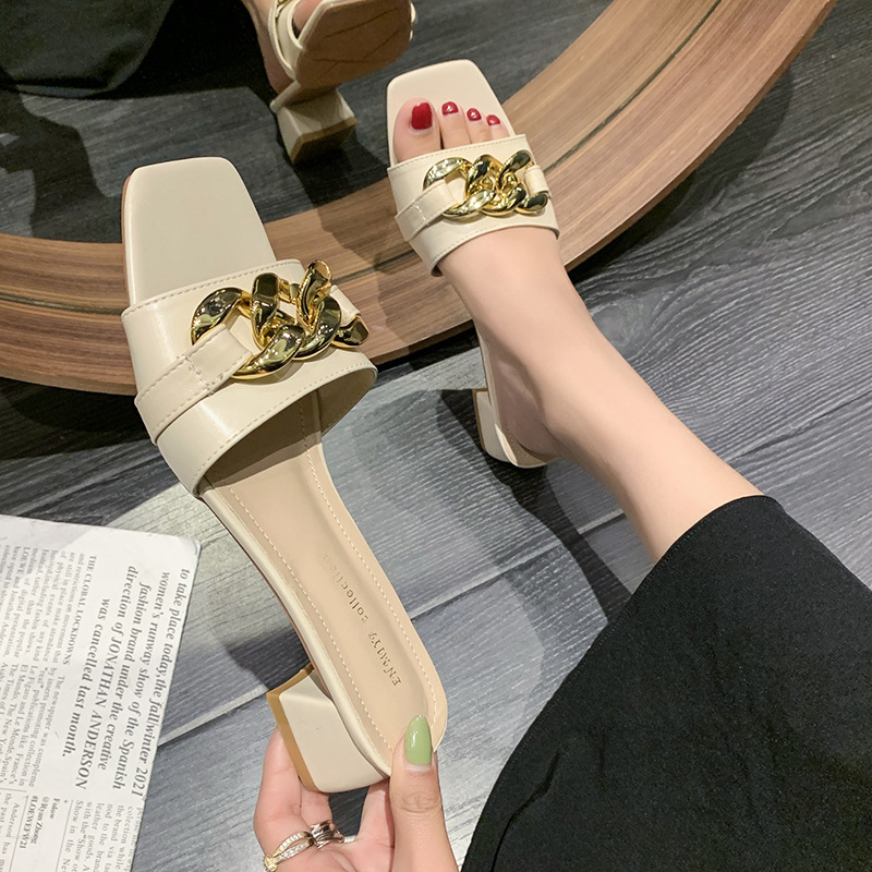 페어리 스타일 하이힐 샌들과 슬리퍼 여성용 겉옷 2023 여름 새로운 스퀘어 헤드 보우 여성용 중형 두꺼운 힐 슬리퍼스토어 가기