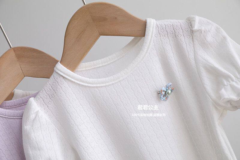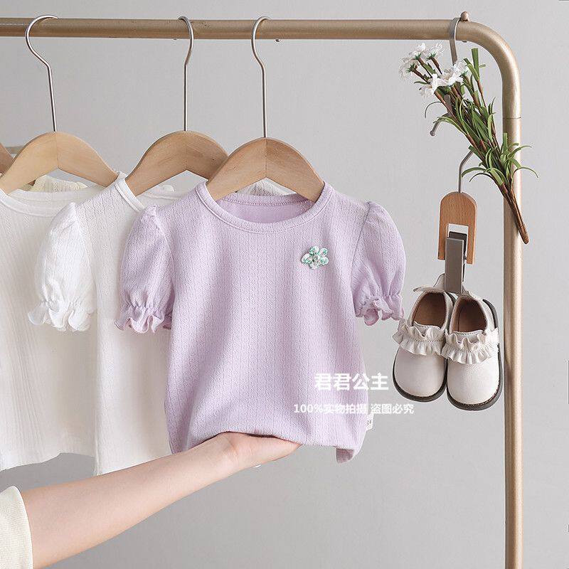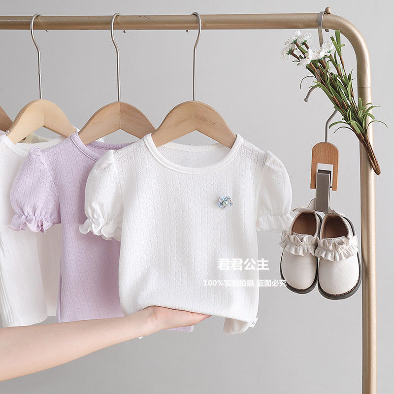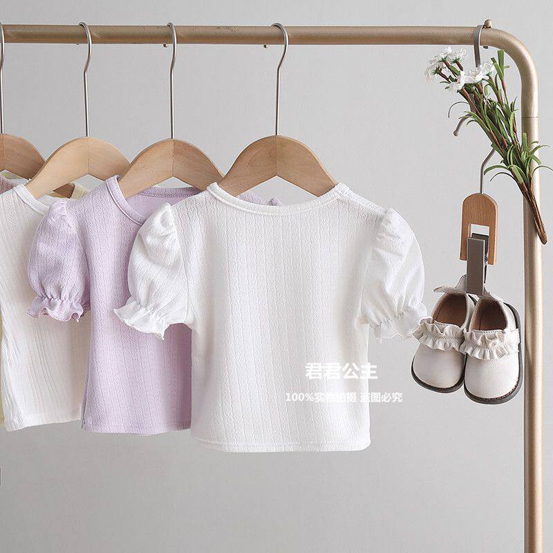 여아 반팔 티셔츠 여름 새로운 어린이 아기 퍼프 슬리브 베이스 셔츠 여름 옷 아기 얇은 반팔 탑스토어 가기