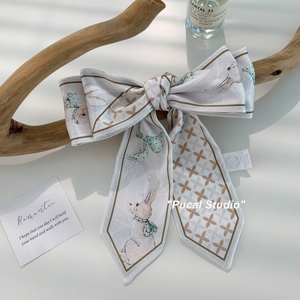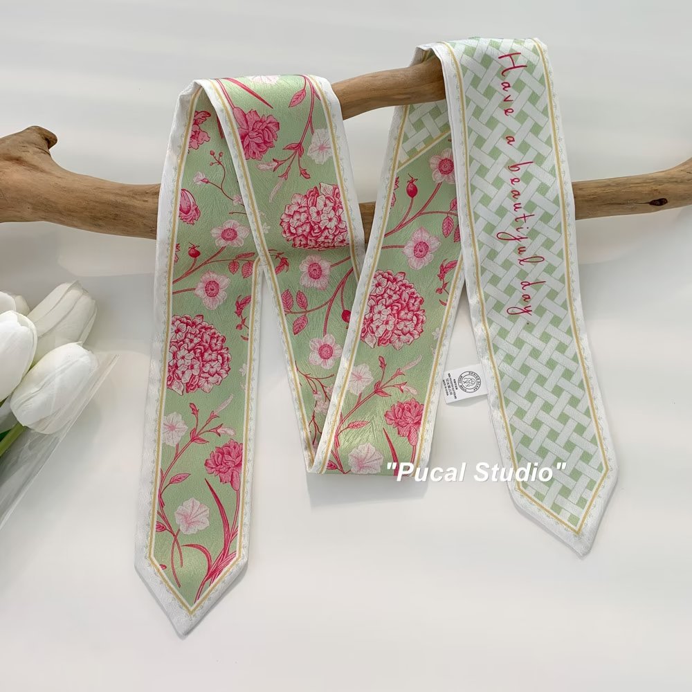 신선한 예술 스타일 소녀의 넥타이 헤어 밴드 봄과 여름 달콤한 꽃 트릴 새틴 긴 스카프 손잡이 리본 스카프