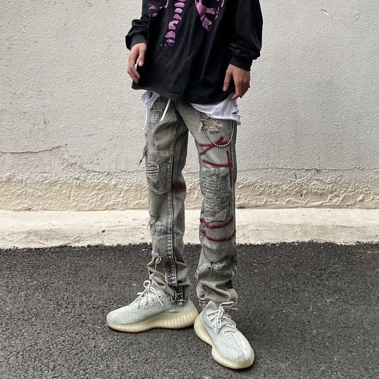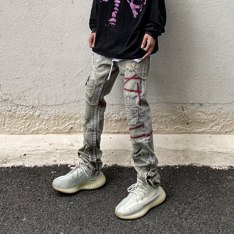 아메리칸 스타일 레트로 올드 힙합 찢어진 패치 청바지 하이 스트리트 분위기 스타일 남성용 슬림 핏 팬츠스토어 가기