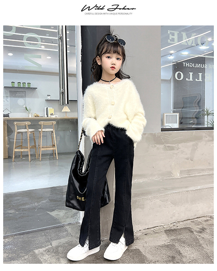 여아 가을 겨울 트임 플레어 팬츠 2025 신상 중대형 아동용 청바지 아동용 플리스 안감 신축성 바지스토어 가기